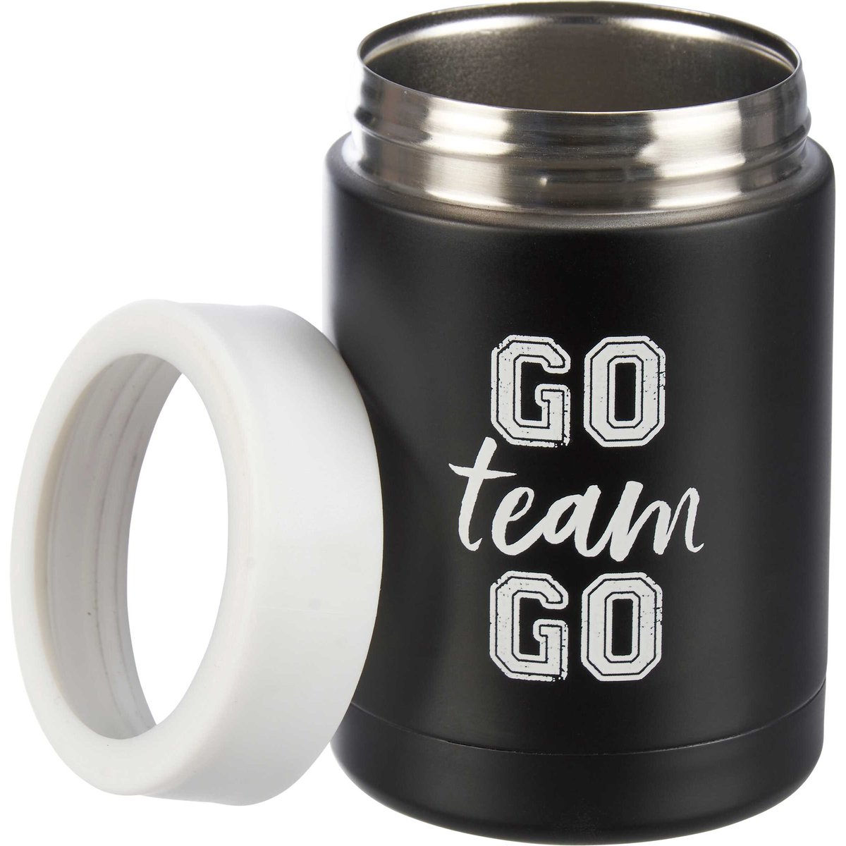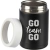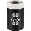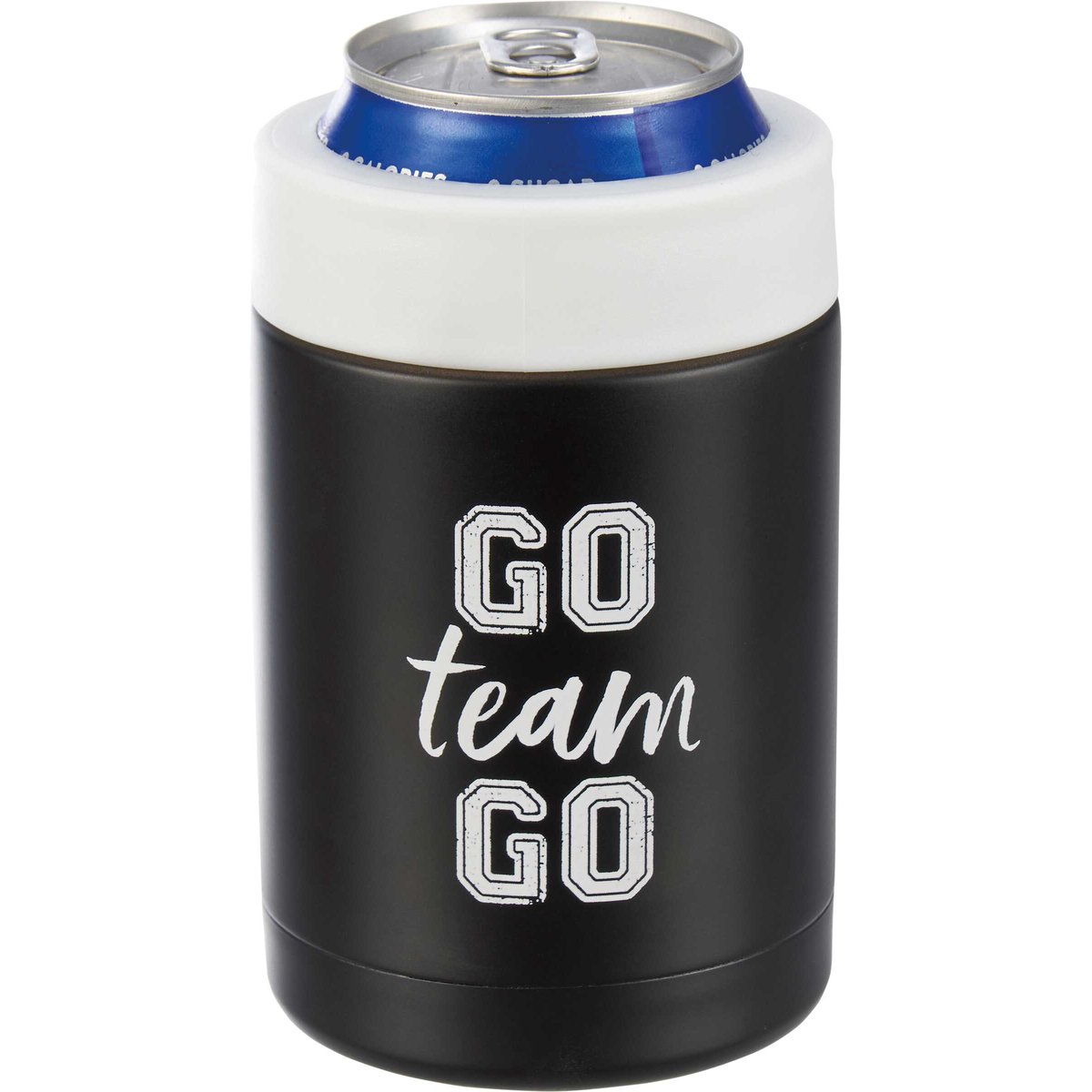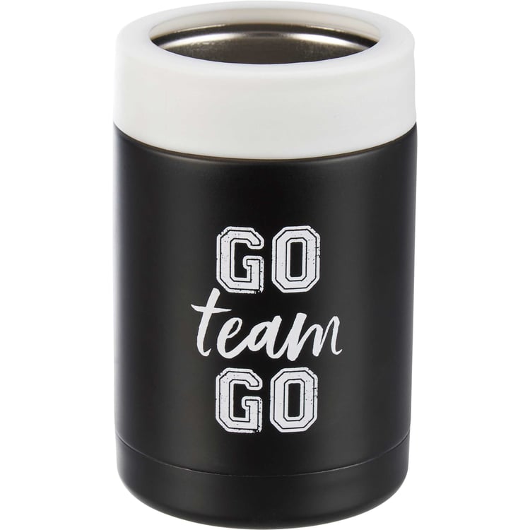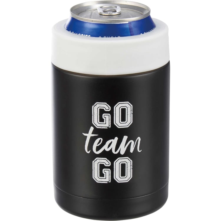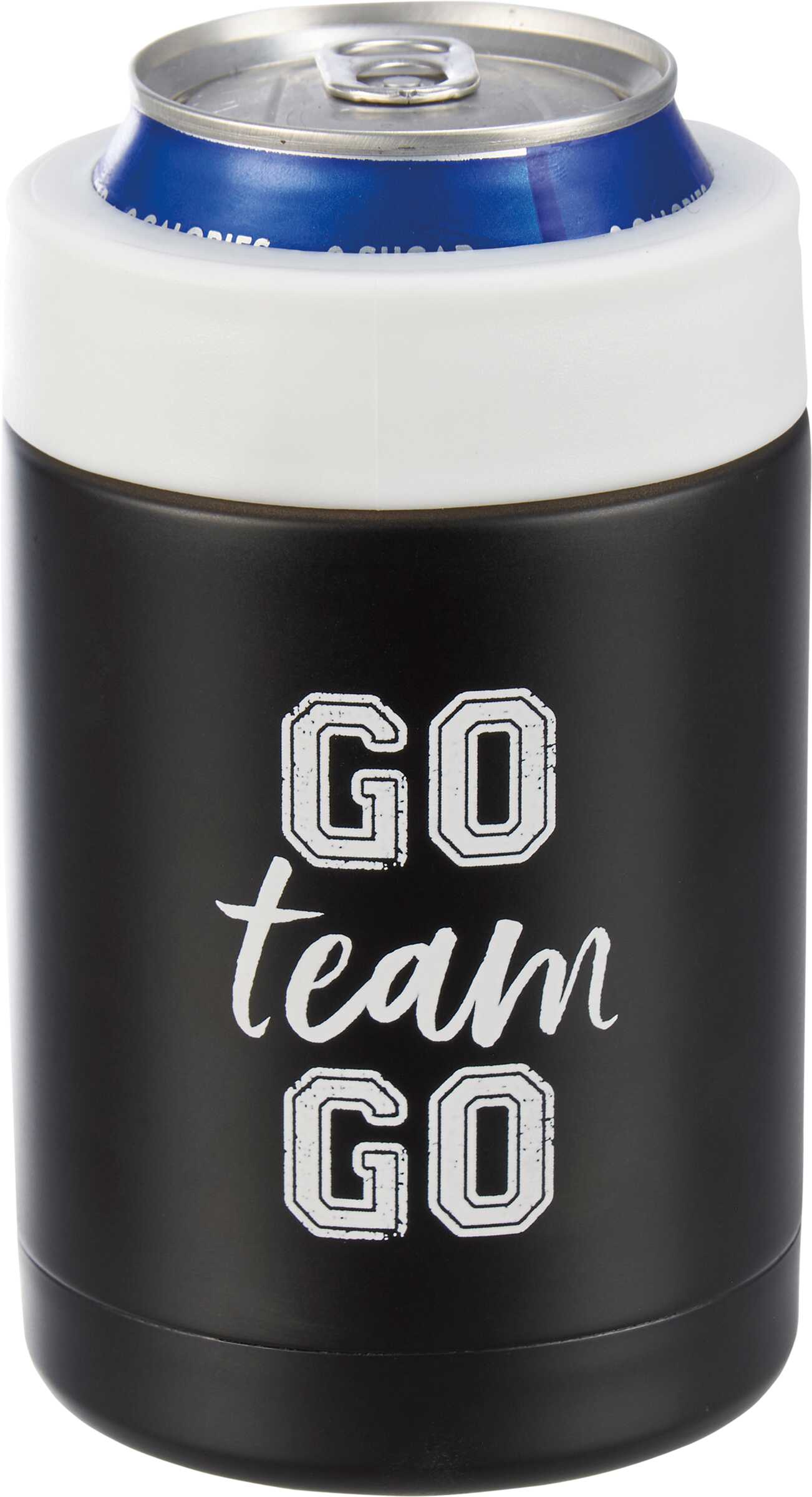 Perfect for warmer weather, this insulated can cooler from our Sports Collection displays a bold "Go Team Go" sentiment. Keep drinks cold up to 4 hours using the convenient screw-top lid to secure a 12 oz can inside the stainless steel cooler. Our Go Team Go can cooler is hand-wash only. Do not microwave.