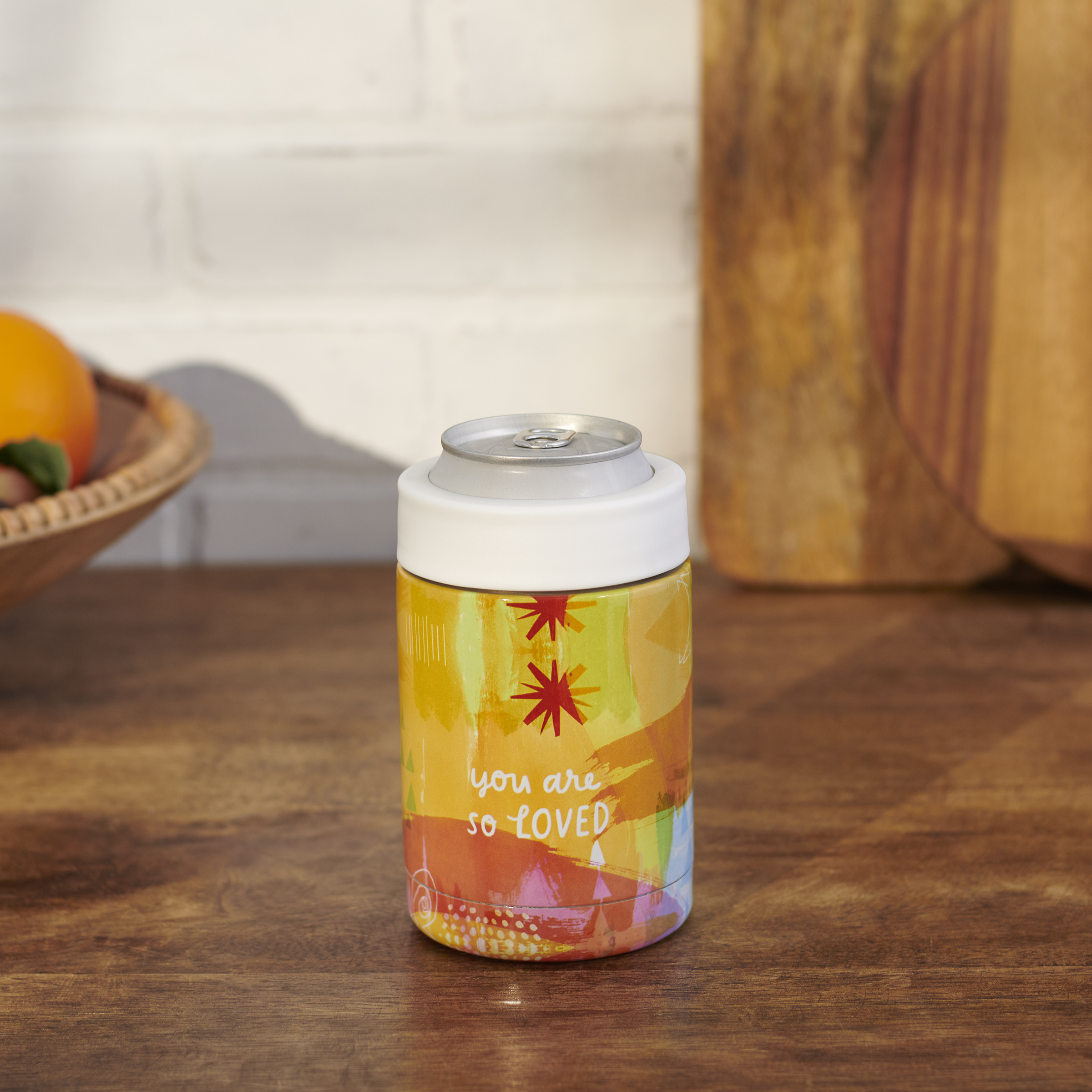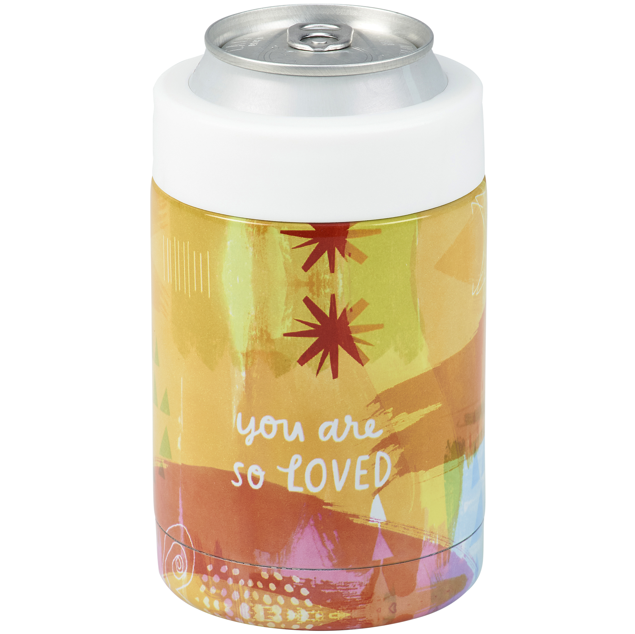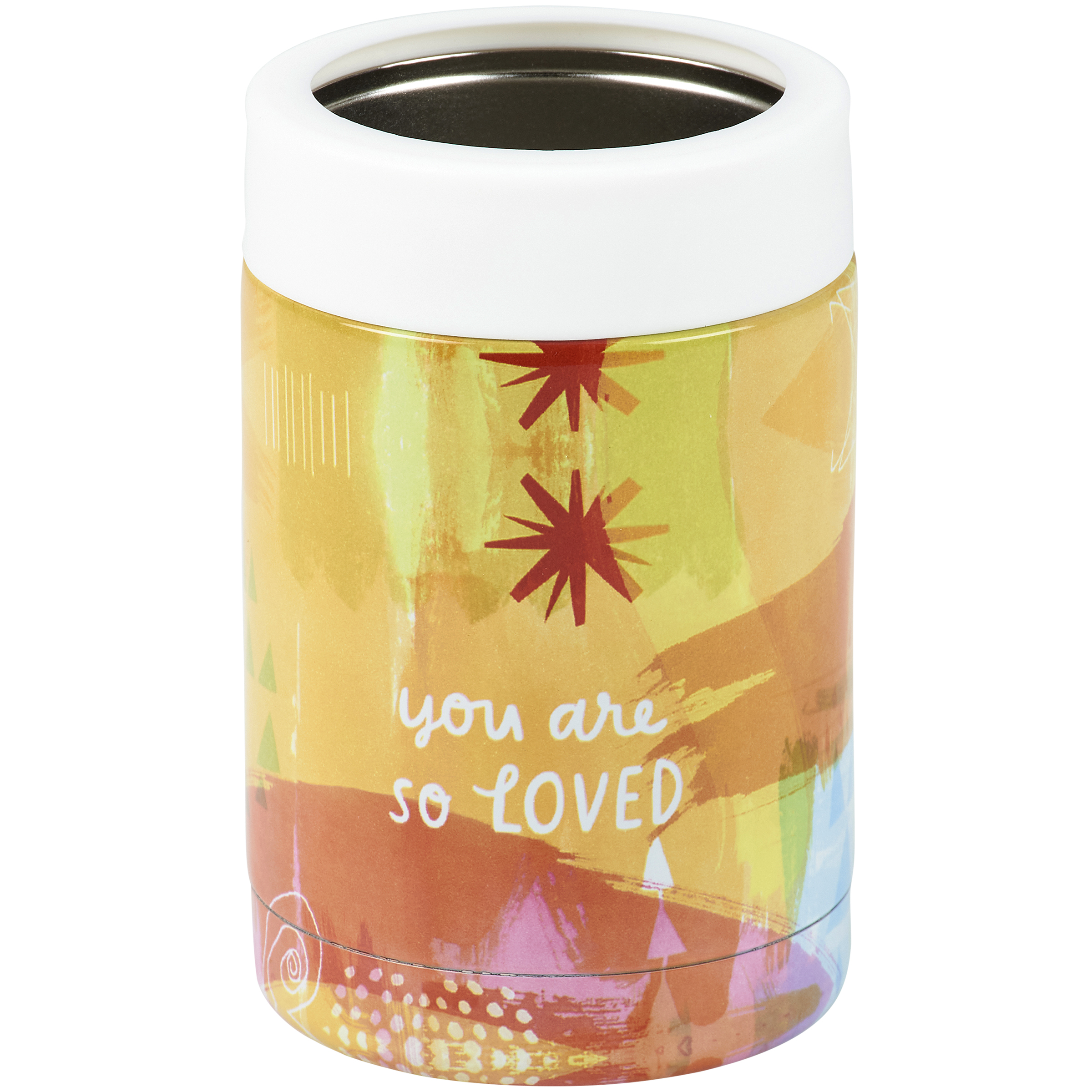 Perfect for warmer weather, this insulated can cooler from our Inspiration & Blooms Collection displays a wrap-around design of hand illustrated abstract art in a warm color palette with an uplifting "You Are So Loved" sentiment. Keep drinks cold up to 4 hours using the convenient screw-top lid to secure a 12 oz can inside the stainless steel cooler. Our So Loved can cooler is hand-wash only. Do not microwave.