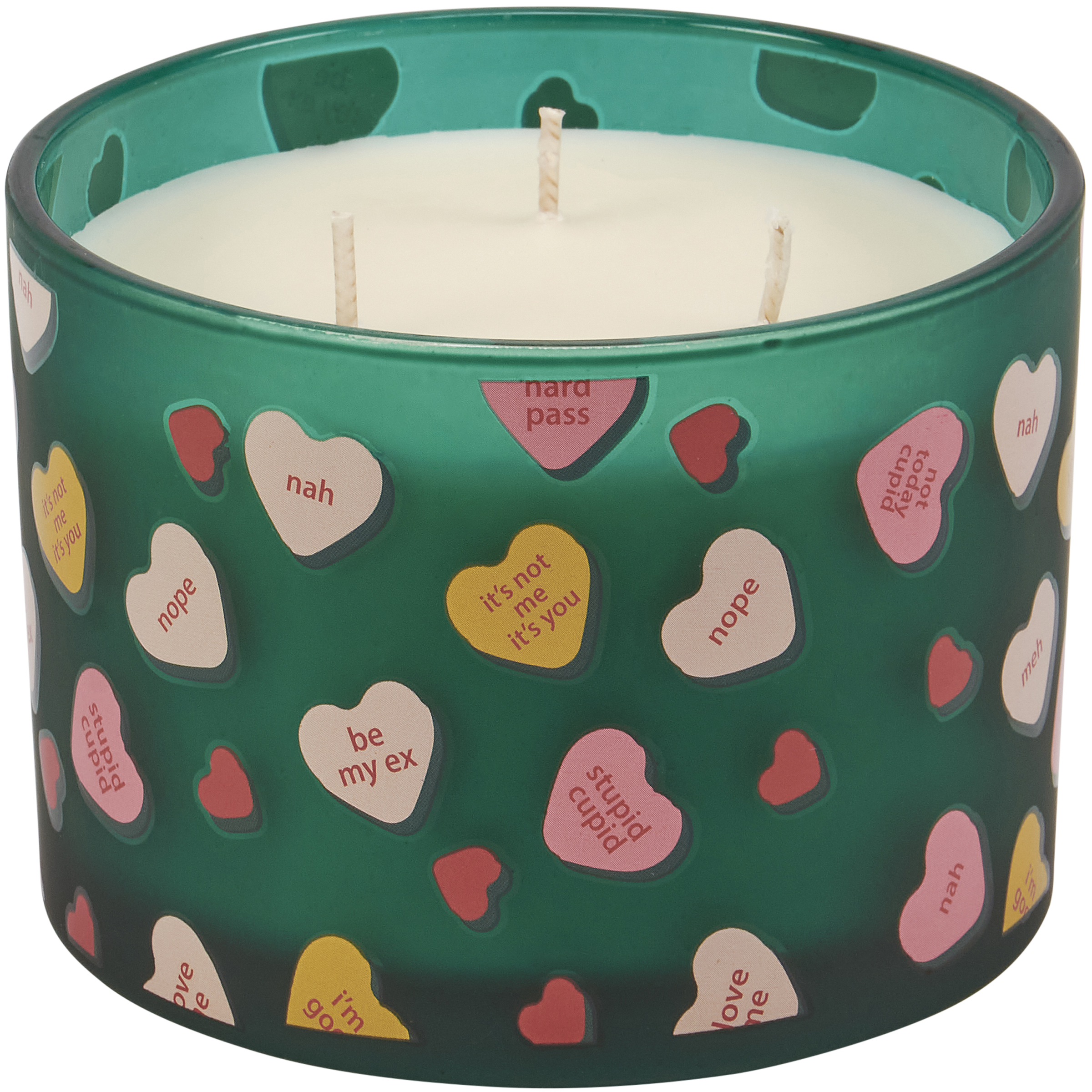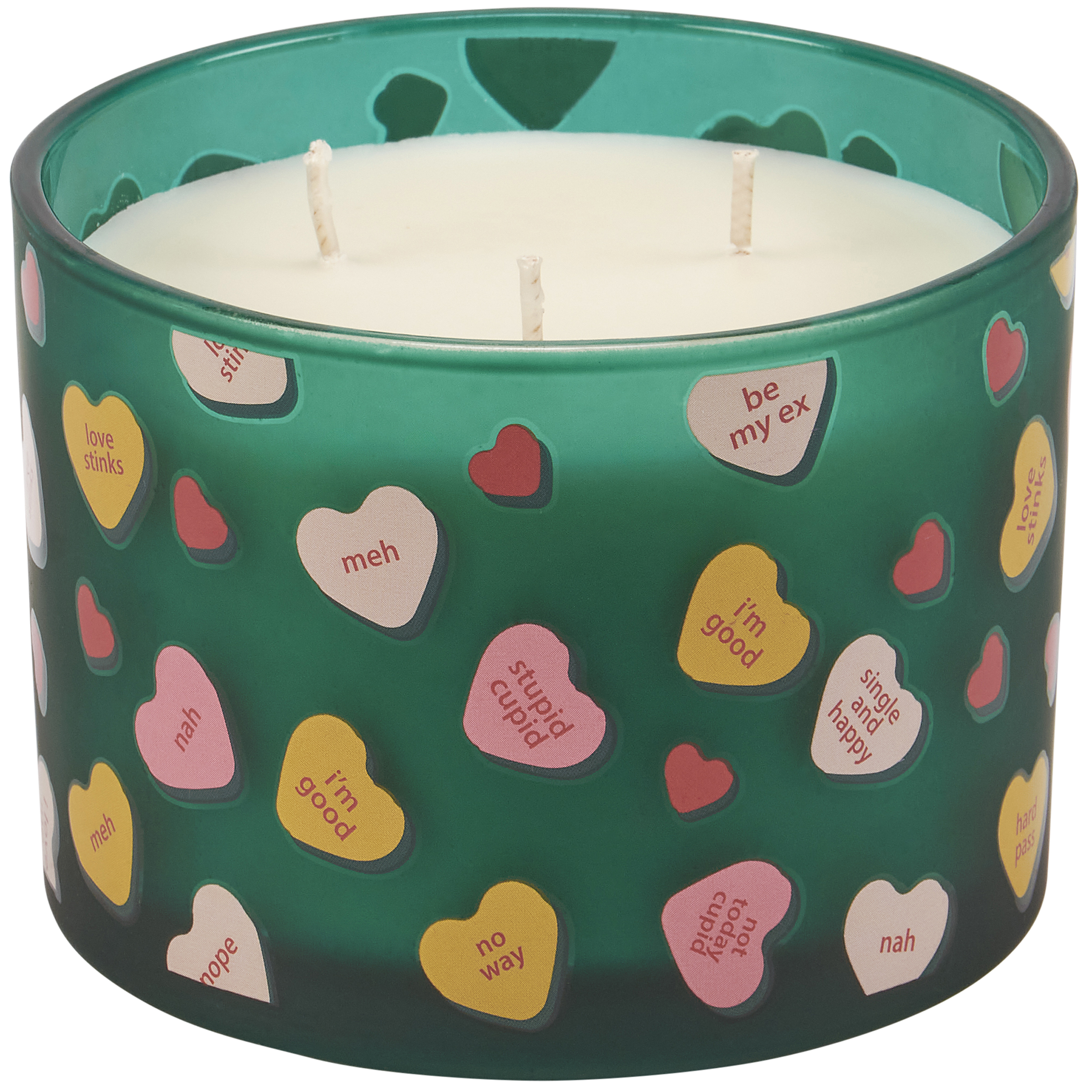 A jar candle from our Valentine's Day Collection displaying a full wrap-around design of candy hearts with sassy anti-valentine themed sentiments on frosted green glass that is a fun alternative for valentine's day gifting. Seasonal candle features soy-based wax and 3 fabric wicks with 30 hours of burn time activating a fun Cherry scent. Our Anti-Valentine candle includes a dust cover and plastic lid for protection and polished appearance. A fun Valentine's Day gift perfect for a seasonal home accent.