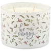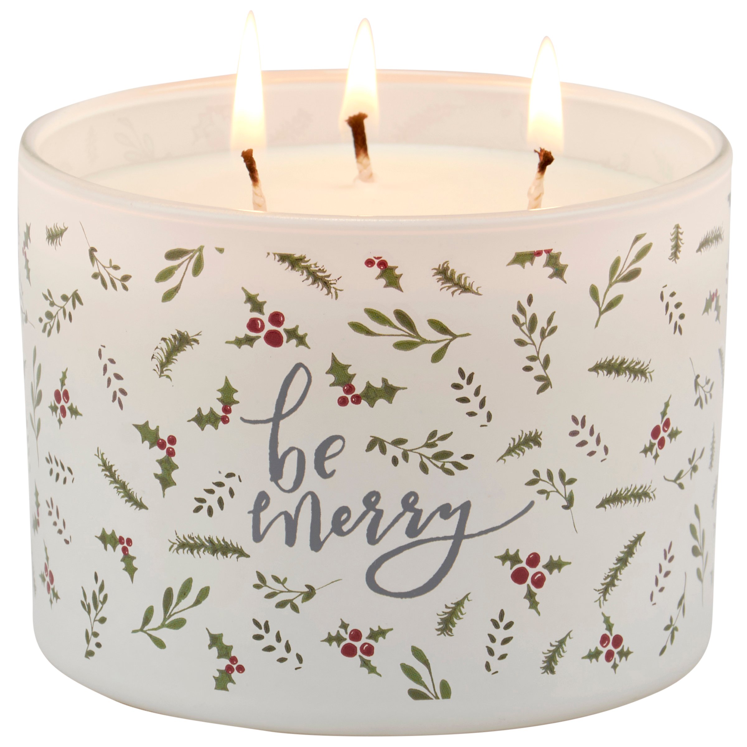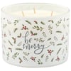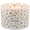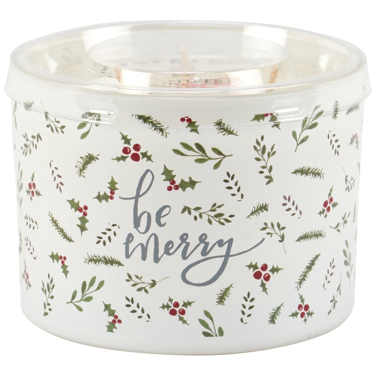 A candle from our Christmas Collection displaying a full wrap-around design of holly and winter greenery with seasonal sentiment that reads "Be Merry" on frosted glass. Winter greenery designs are replicated from original art hand painted in a unique watercolor style. Seasonal candle features soy-based wax and 3 fabric wicks with 30 hours of burn time activating a refreshing Evergreen scent. Our Be Merry candle includes a dust cover and plastic lid for protection and enhanced appearance on store displays. An inspirational Christmas gift perfect for a seasonal home accent.