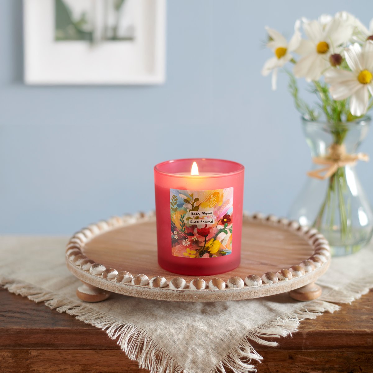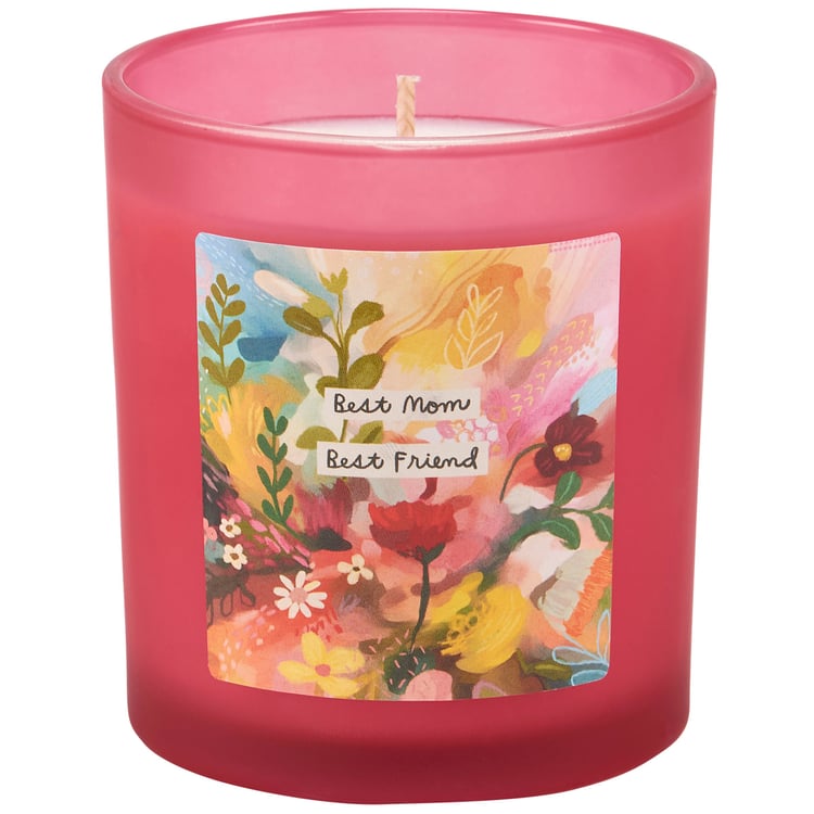 A candle from our Mother's Day Collection displaying a double-sided design of hand illustrated abstract flowers on frosted pink glass surrounding a heartwarming mom-themed sentiment that reads "Best Mom - Best Friend." Mom candle features soy-based wax and cotton wick with 35 hours of burn time activating a calming Peony scent. Our Best Mom Best Friend candle includes a dust cover and plastic lid for protection and enhanced appearance on store displays. A lovely Mother's Day gift perfect for an everyday home accent.