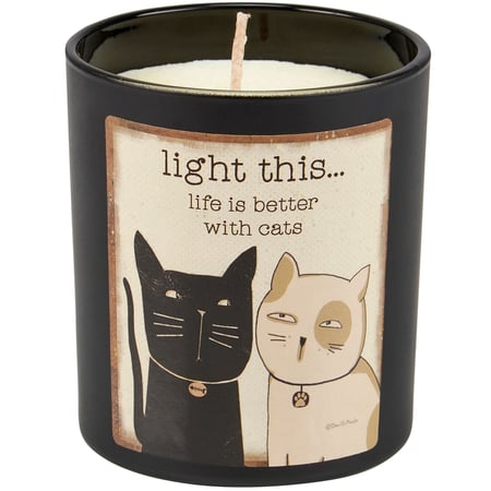 A jar candle from our Pet Collection displaying a double-sided design of cats in a rustic style on frosted black glass with a sassy pet-themed sentiment that reads "Light This... Life Is Better With Cats." Candle features soy-based wax and cotton wick with 35 hours of burn time activating a cleansing Sea Salt & Sage scent. Our Better with Cats jar candle includes a dust cover and plastic lid for protection and polished appearance. A fun pet-themed home accent that is great for gifting.
