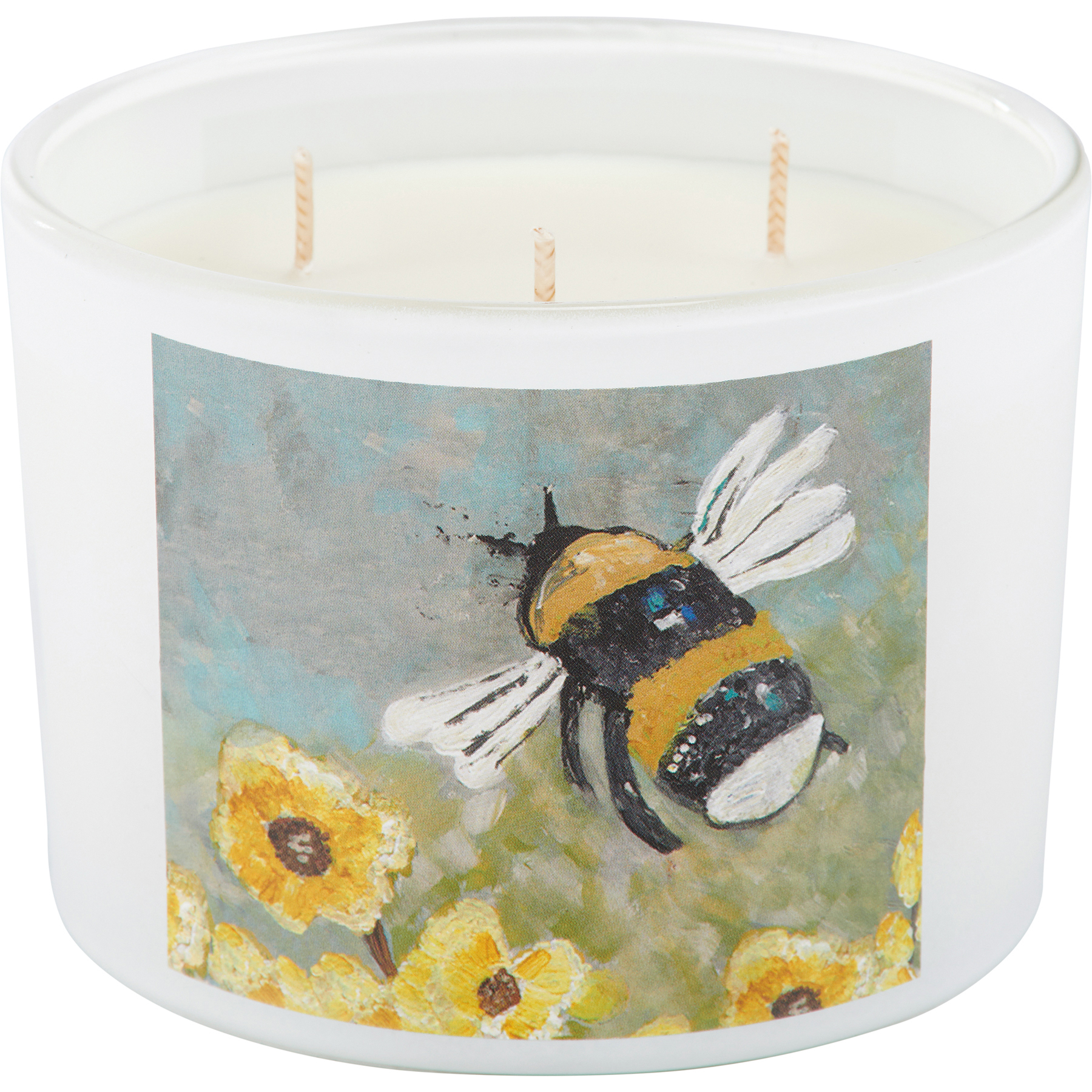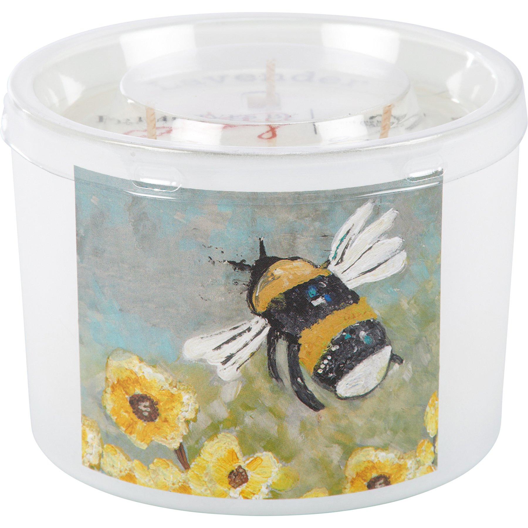 A candle from our Friendship Heart Gallery Collection displaying a double-sided hand painted design of a bee and yellow flowers on clear matte glass. Design is replicated from original art created at the Friendship Heart Gallery in downtown Lancaster, PA by artists with intellectual disabilities and autism. Candle features soy-based wax and 3 fabric wicks with 30 hours of burn time activating a calming Lavender scent. Our Bumblebee candle includes a dust cover and plastic lid for protection and polished appearance. A charming everyday home accent great for gifting.
