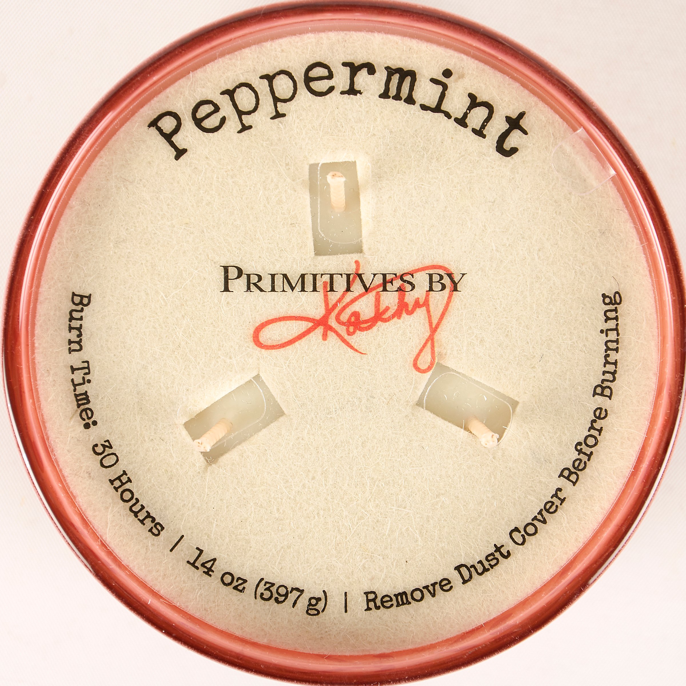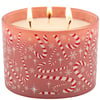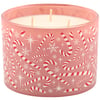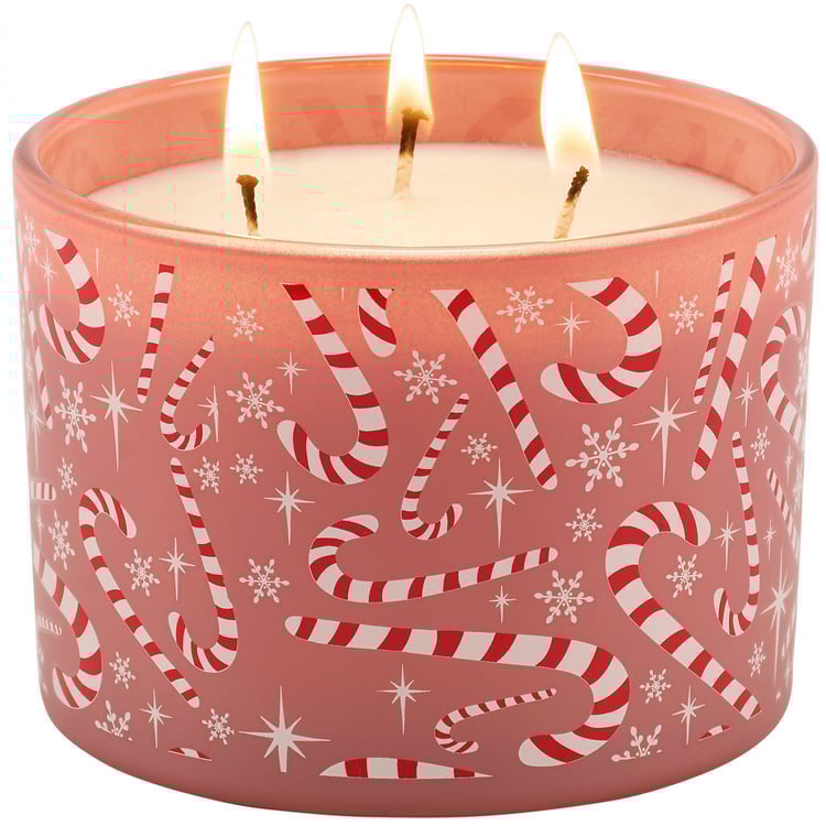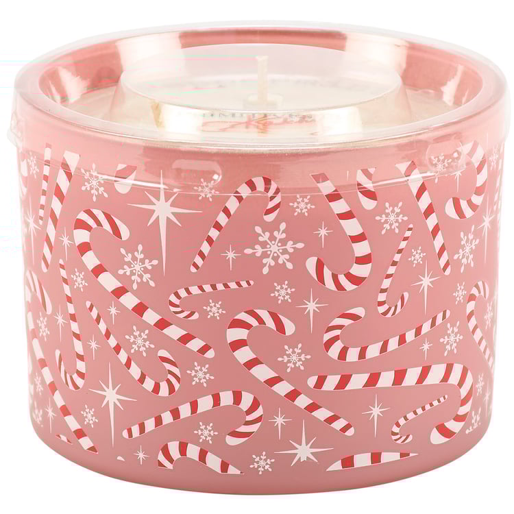 A candle from our Christmas Collection displaying a pattern of hand illustrated snowflakes, north stars, and candy canes on frosted pastel pink glass. Seasonal candle features soy-based wax and 3 fabric wicks with 30 hours of burn time activating a refreshing Peppermint scent. Our Candy Canes candle includes a dust cover and plastic lid for protection and enhanced appearance on store displays. A retro inspired Christmas gift perfect for a seasonal home accent.