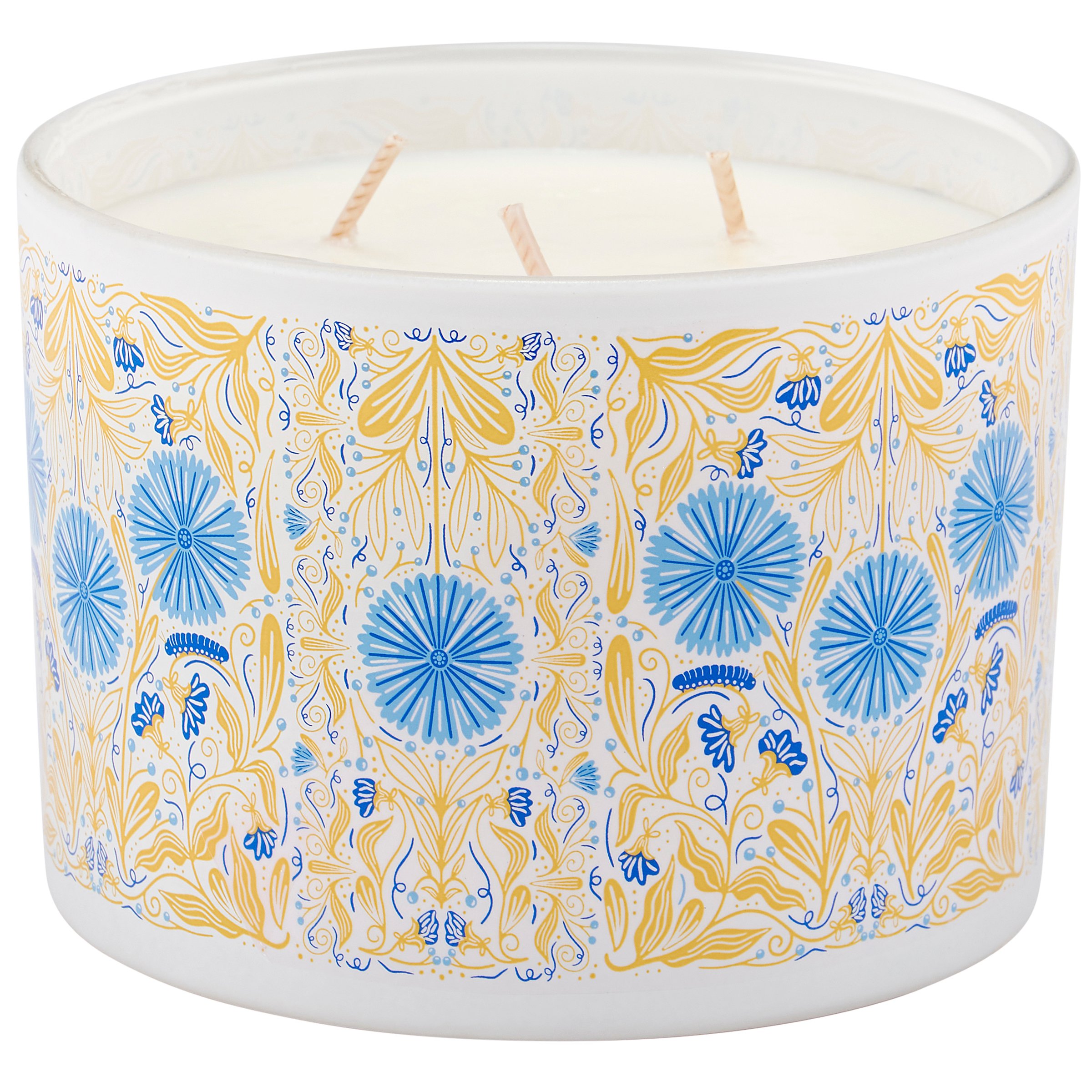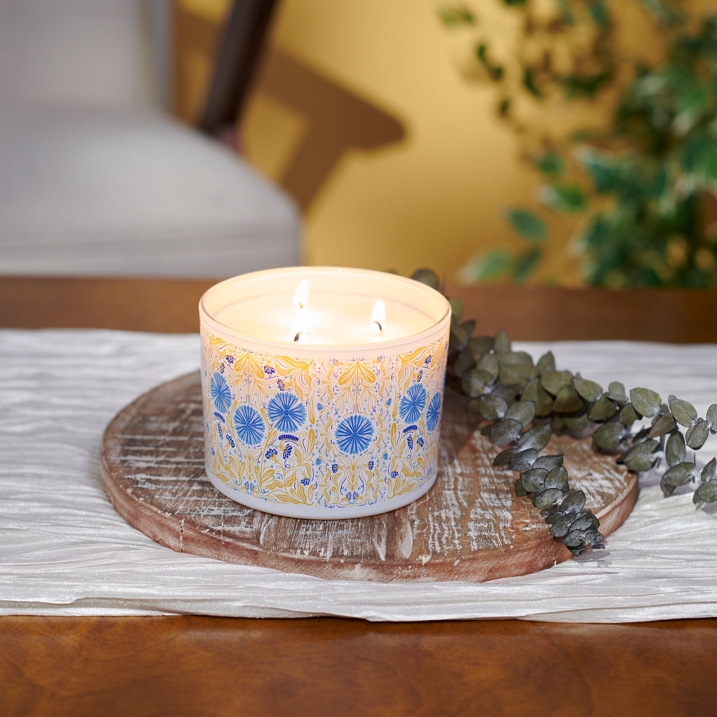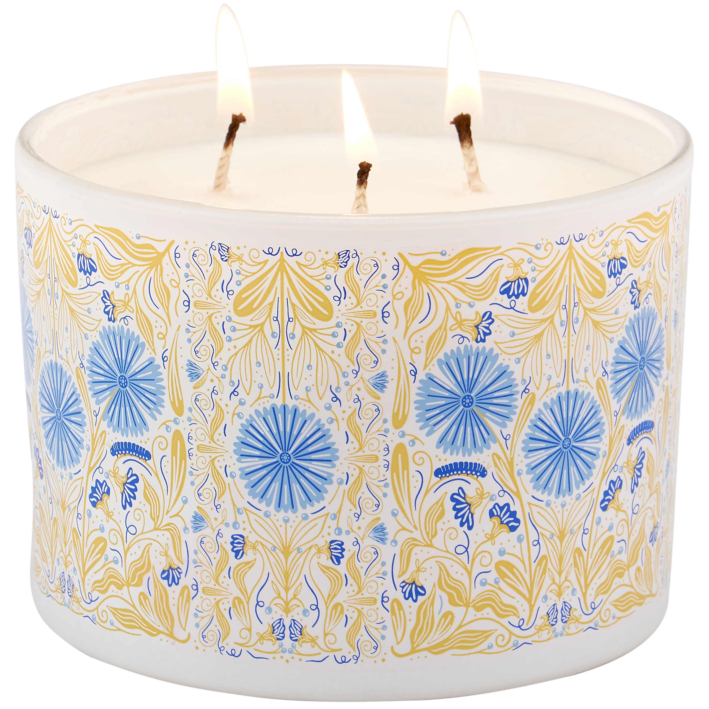 A candle from our Folk Art Collection displaying a full wrap-around design of colorful flowers and caterpillars on frosted glass. Floral design is replicated from original hand illustrated artwork inspired by folk art. Candle features soy-based wax and 3 fabric wicks with 30 hours of burn time activating a relaxing Eucalyptus scent. Our Caterpillar Floral candle includes a dust cover and plastic lid for protection and enhanced appearance on store displays. A folk art home accent that is great for gifting.