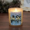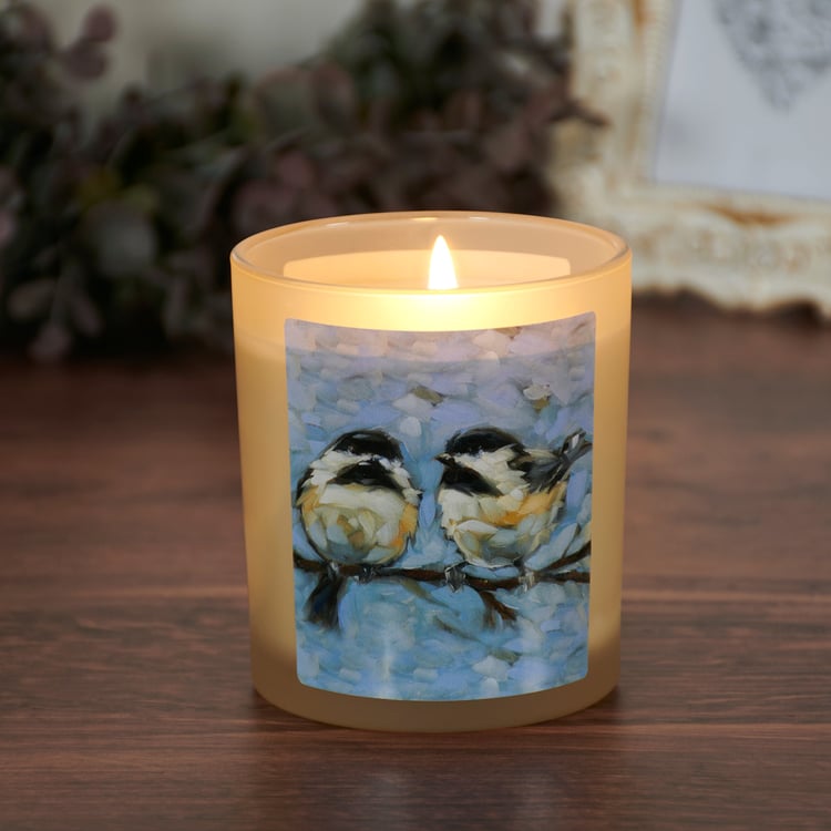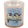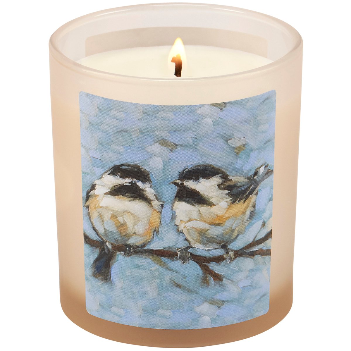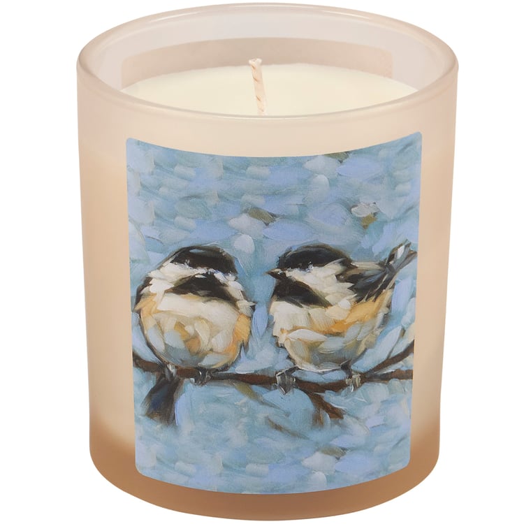 A jar candle from our Easter & Spring Collection featuring a double-sided design on frosted glass displaying chickadees next to each other on a branch in a textured hand painted style. Candle features soy-based wax and cotton wick with 35 hours of burn time activating a calming Lilac scent. Our Chickadee Friends candle includes a dust cover and plastic lid for protection and polished appearance. A charming seasonal home accent great for gifting.