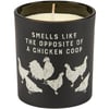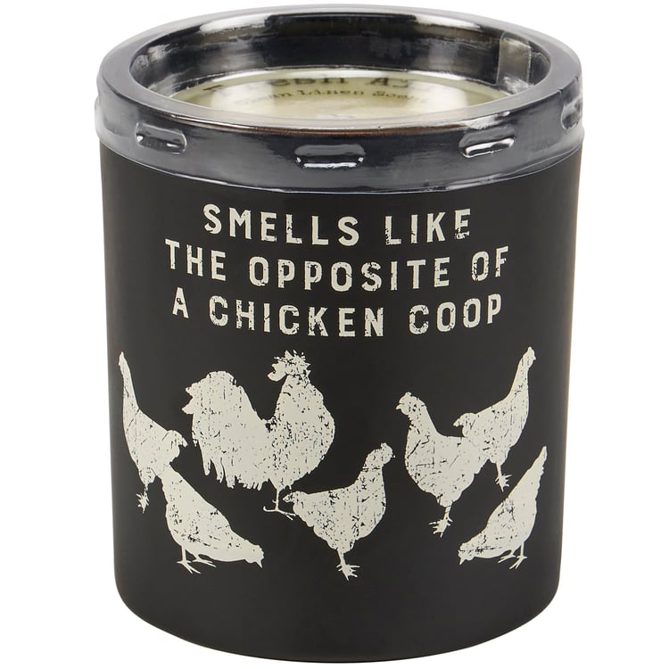 A jar candle from our Farmhouse Collection displaying a design of a rooster and chickens in a rustic style on matte black glass with a farm-themed sentiment that reads "Smells Like The Opposite Of A Chicken Coop." Candle features soy-based wax and cotton wick with 35 hours of burn time activating a refreshing Fresh Air scent. Our Chicken Coop jar candle includes a dust cover and plastic lid for protection and polished appearance. A fun farm-themed home accent that is great for gifting.