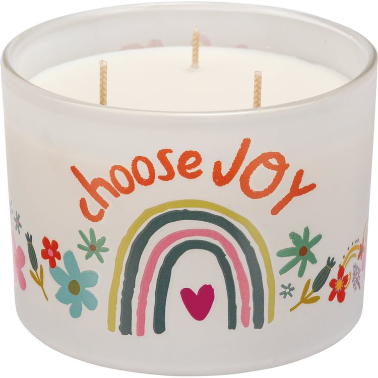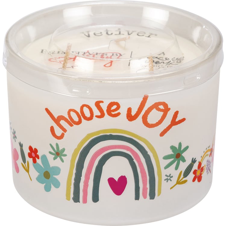 A frosted glass vessel holds this soy-based wax candle featuring a refreshing vetiver scent, an inspirational "Choose Joy" sentiment, and colorful rainbow and floral designs. This 14 oz. candle makes a perfect gift. Our Choose Joy jar candle contains three fabric wicks for a total of 30 hours of burn time. Includes a plastic wax cover for protection and a polished look.