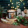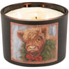 A jar candle from our Christmas Collection displaying a double-sided design of a highland cow wearing a Christmas wreath on frosted black glass. Design is replicated from original artwork painted onto burlap canvas, giving the art a unique depth and texture. Seasonal candle features soy-based wax and 3 fabric wicks with 30 hours of burn time activating a calming Cinnamon scent. Our Christmas Highland jar candle includes a dust cover and plastic lid for protection and polished appearance. A Christmas-themed home accent that is great for gifting.