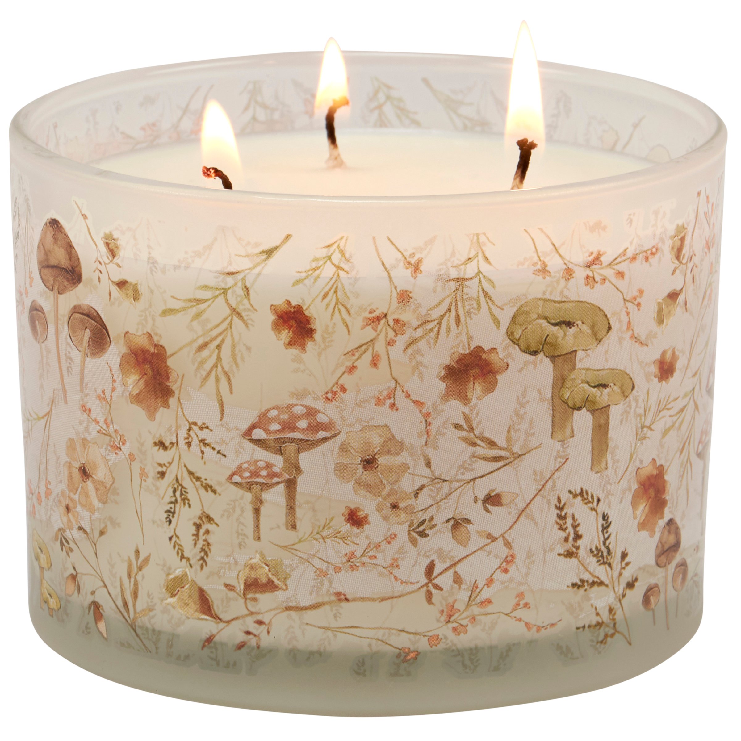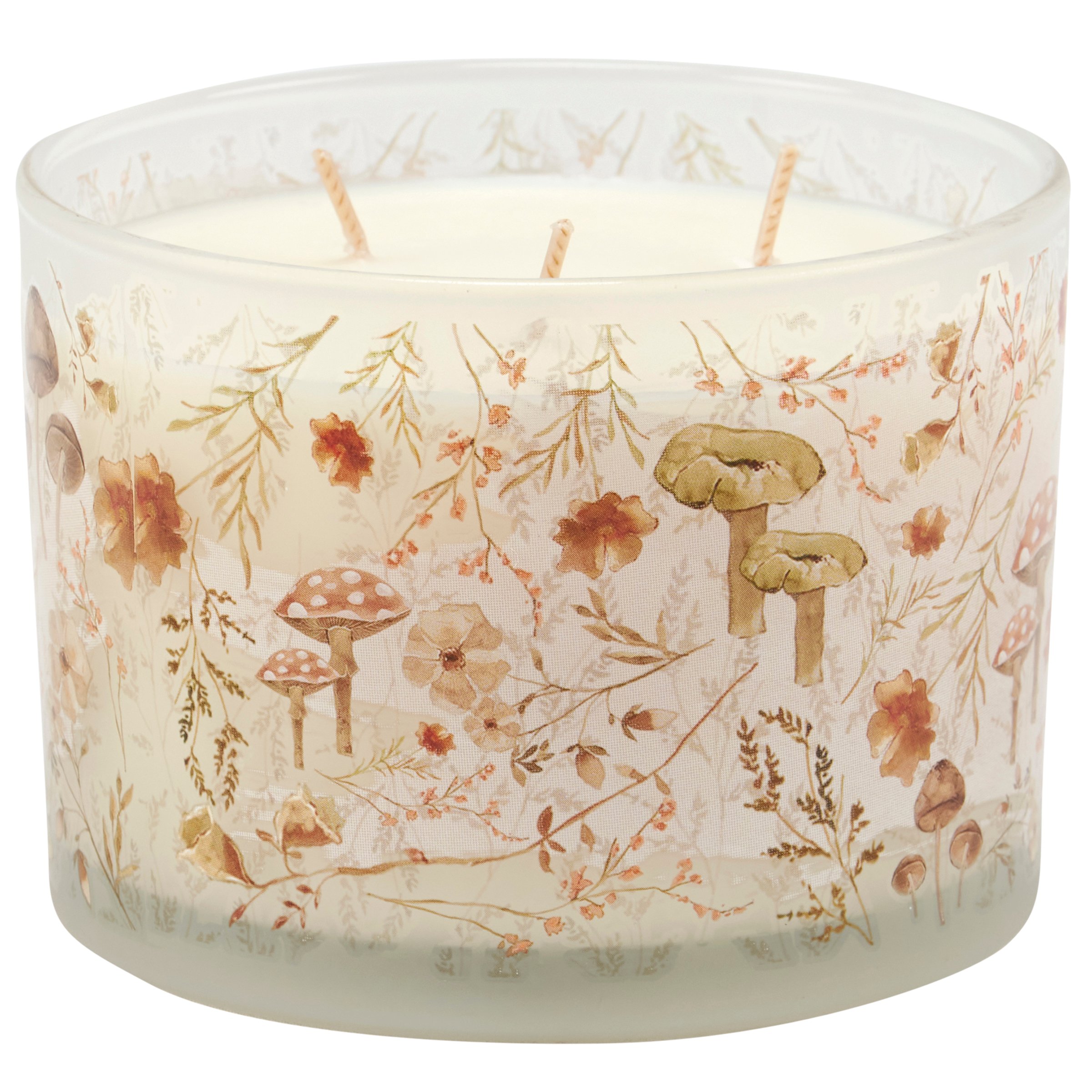A candle from our Cottagecore Collection displaying a full wrap-around design of wildflowers and mushrooms on frosted glass. Garden designs are replicated from original art hand painted in a watercolor style. Cottage candle features soy-based wax and 3 fabric wicks with 30 hours of burn time activating a refreshing Fresh Air scent. Our Cottage Garden candle includes a dust cover and plastic lid for protection and enhanced appearance on store displays. A nature-themed home accent that is great for gifting.