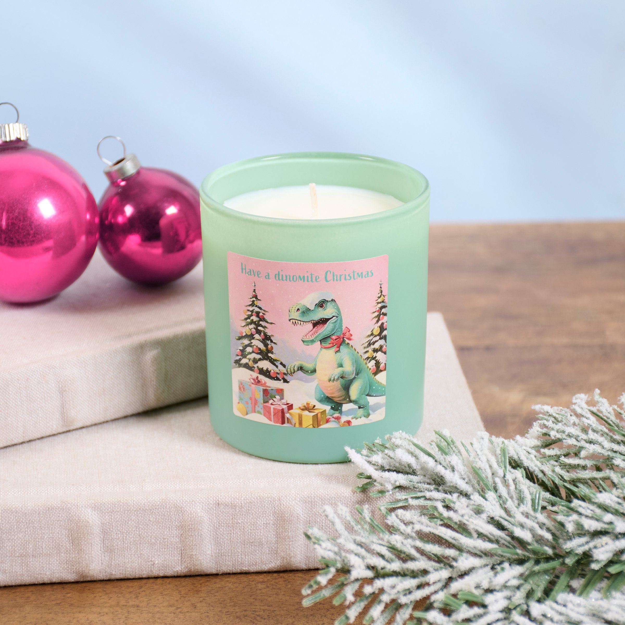 A candle from our Christmas Collection displaying a pastel inspired double-sided design of a t-rex celebrating Christmas with a seasonal sentiment that reads "Have A Dinomite Christmas" on frosted pastel green glass. Holiday dinosaur candle features soy-based wax and a fabric wick with 35 hours of burn time activating a delightful Sugar Cookie scent. Our Dinomite Christmas candle includes a dust cover and plastic lid for protection and enhanced appearance on store displays. A fun dinosaur-themed Christmas gift perfect for a seasonal home accent.