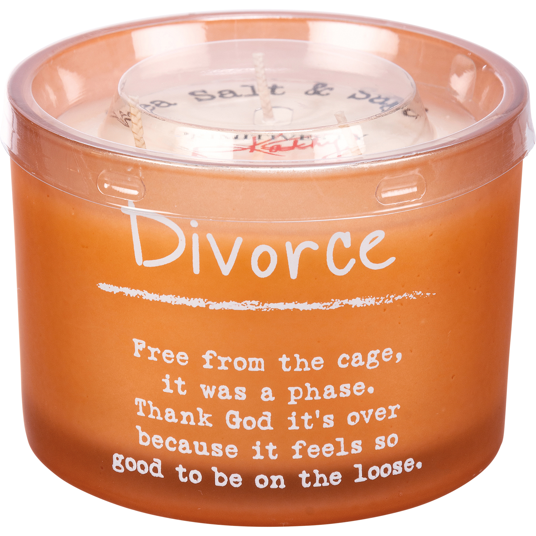 A brown frosted glass vessel holds this soy-based wax candle from our Poetry Collection featuring a refreshing sea salt and sage scent with "Divorce Free From The Cage, It Was A Phase. Thank God It's Over Because It Feels So Good To Be On The Loose." sentiment. This 14 oz. candle makes a perfect gift. Our Divorce jar candle contains three fabric wicks for a total of 30 hours of burn time. Includes a plastic wax cover for protection and a polished look.