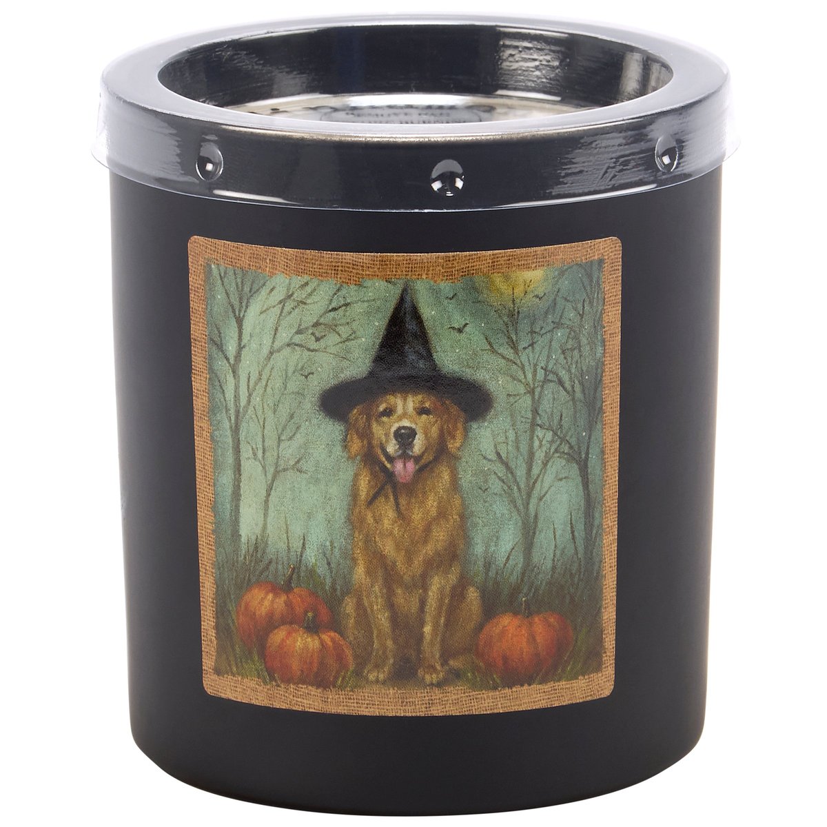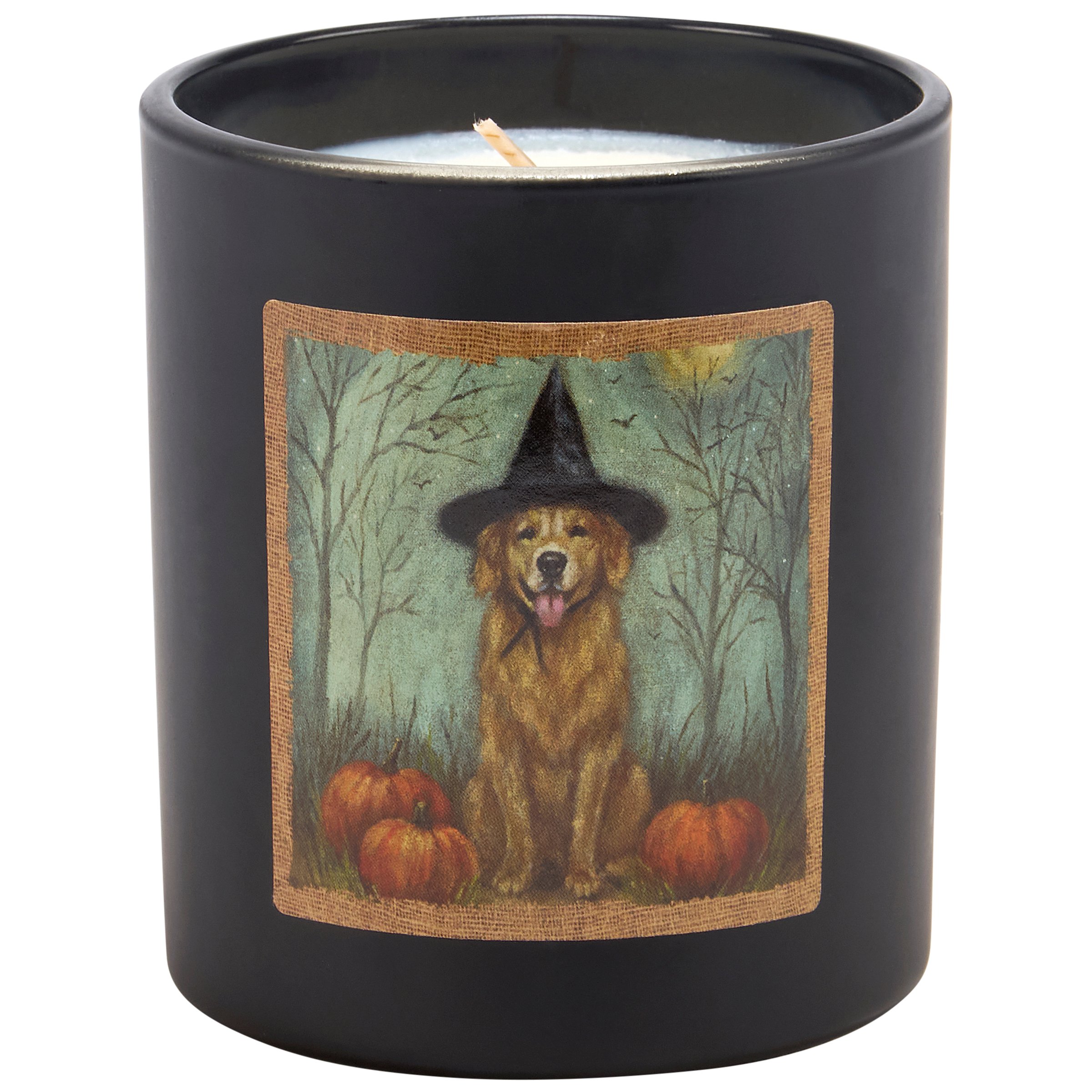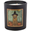 A candle from our Halloween Collection displaying a double-sided design of a dog dressed in a witch costume on matte black glass. Dog witch design is replicated from original artwork painted onto burlap canvas, giving the art a unique depth and texture. Seasonal candle features soy-based wax and a fabric wick with 35 hours of burn time activating a calming Cinnamon scent. Our Dog As A Witch candle includes a dust cover and plastic lid for protection and enhanced appearance on store displays. A pet-themed gift perfect for a seasonal home accent.