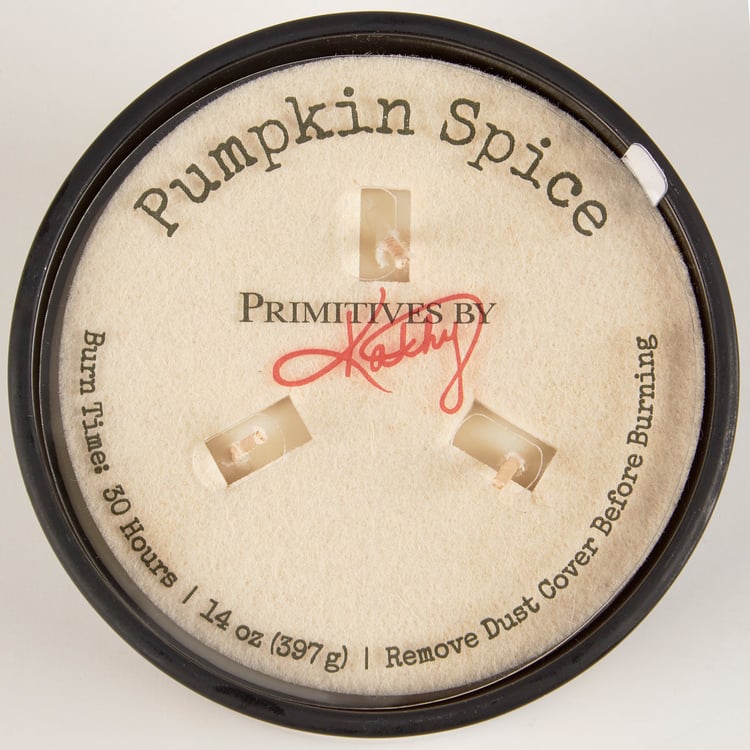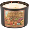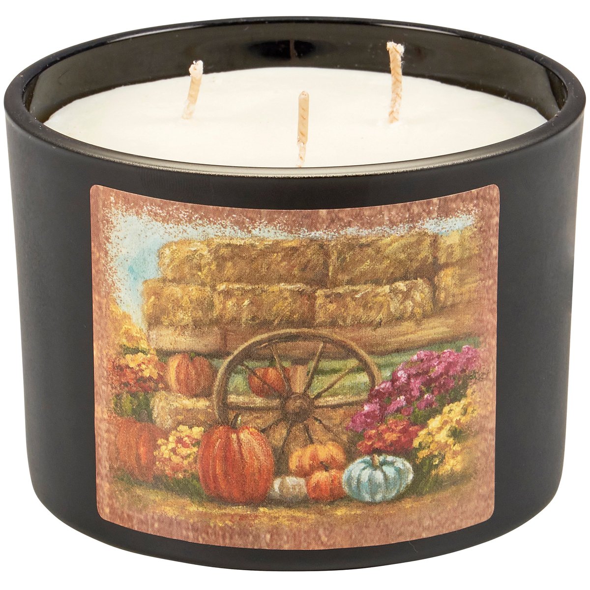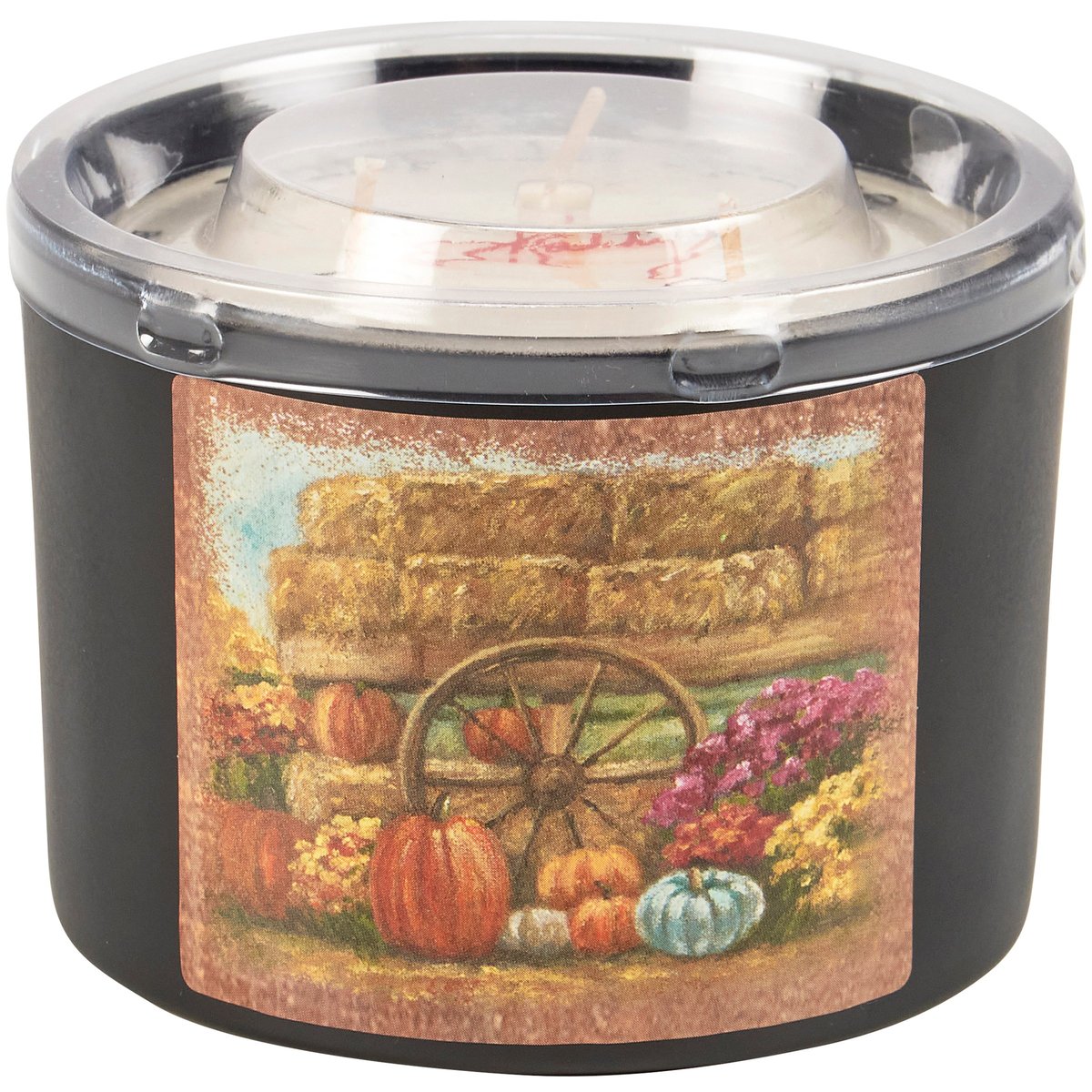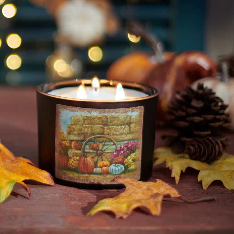 A jar candle from our Fall & Harvest Collection displaying a double-sided design of a farm scene with fall foliage and pumpkins on frosted black glass. Design is replicated from original artwork painted onto burlap canvas, giving the art a unique depth and texture. Seasonal candle features soy-based wax and 3 fabric wicks with 30 hours of burn time activating a calming Pumpkin Spice scent. Our Fall Farm jar candle includes a dust cover and plastic lid for protection and polished appearance. A fall-themed home accent that is great for gifting.