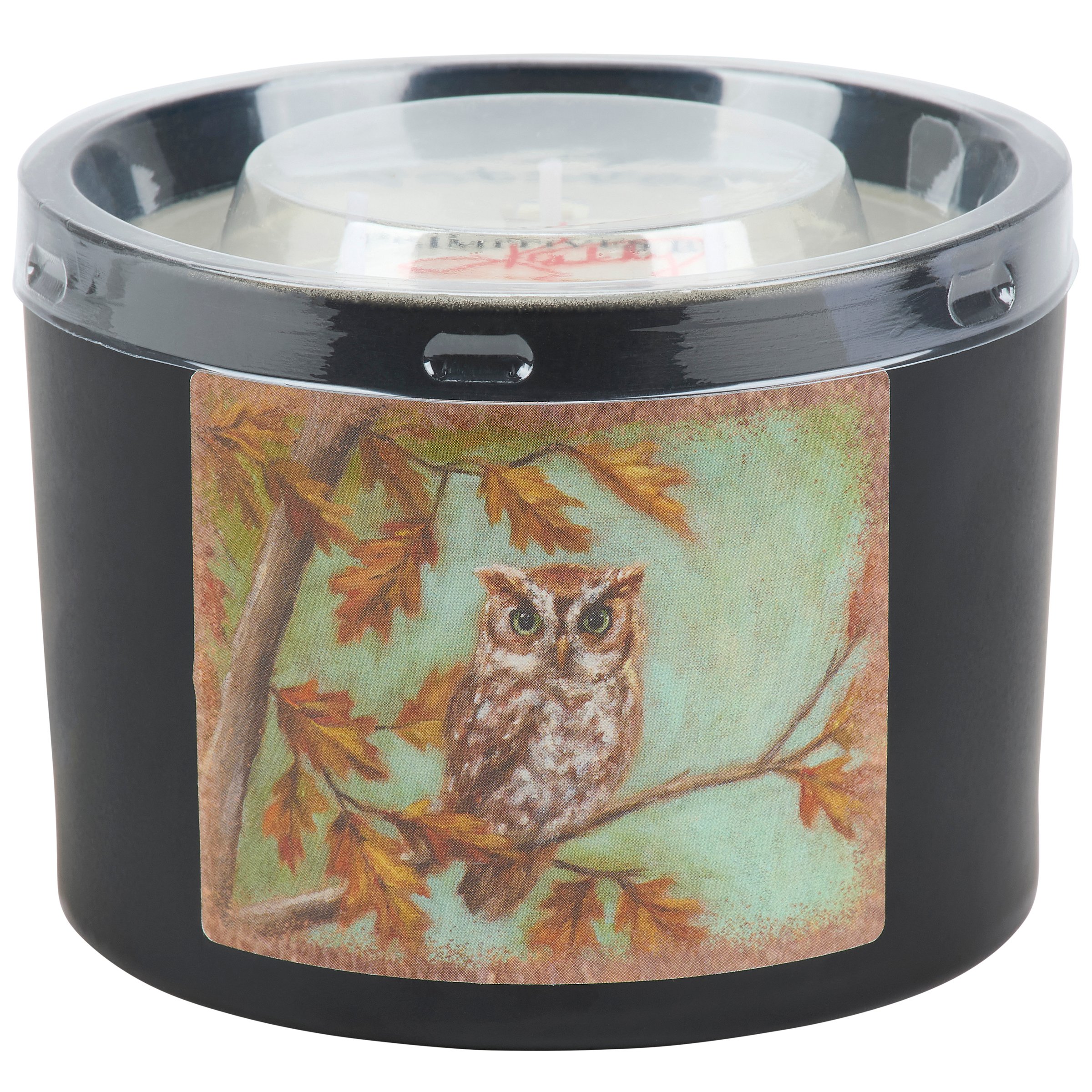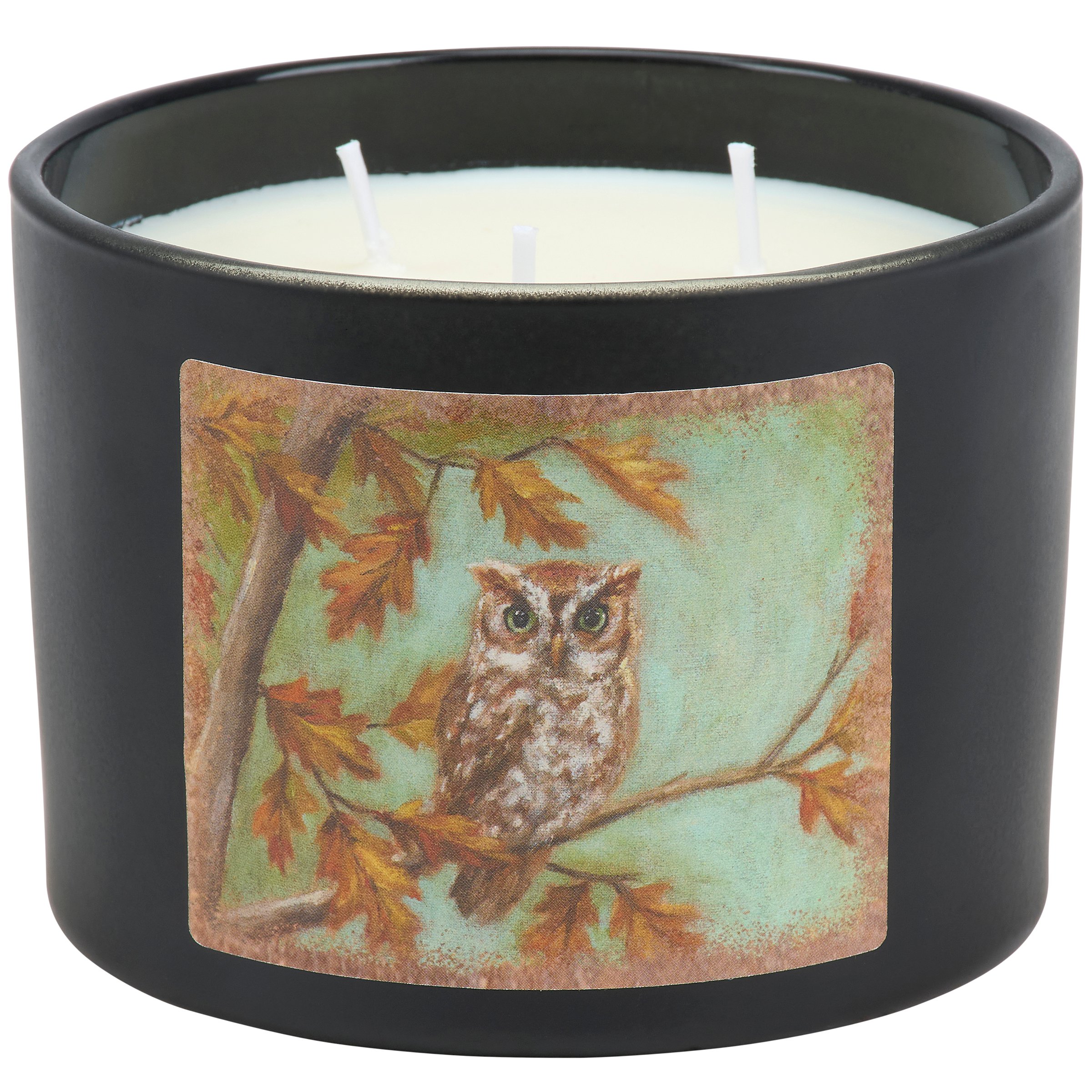 A candle from our Fall & Harvest Collection featuring a double-sided design on matte black glass displaying a charming fall scene of an owl on a branch with autumn leaves. Fall owl design is replicated from original artwork painted onto burlap canvas, giving the art a unique depth and texture. This fall candle features soy-based wax and 3 fabric wicks with 30 hours of burn time activating an earthy Vetiver scent. Our Fall Owl candle includes a dust cover and plastic lid for protection and enhanced appearance on store displays. A nature themed fall home accent that easily adds natural lighting and seasonal style to any home or work space.