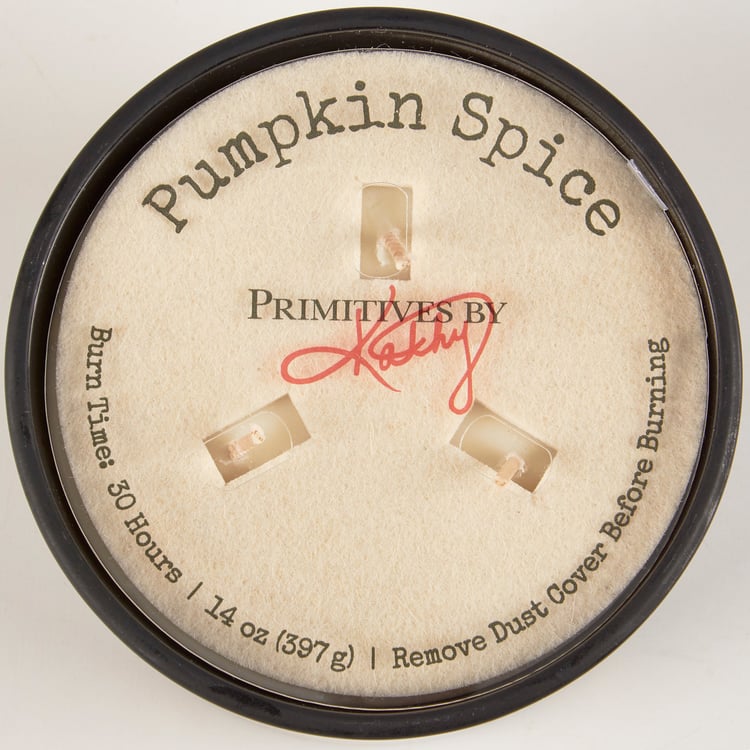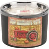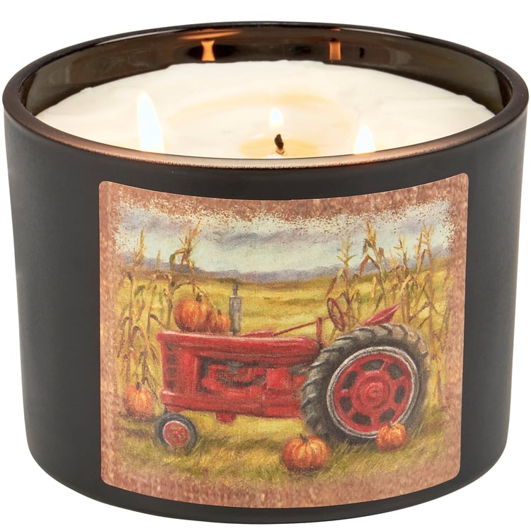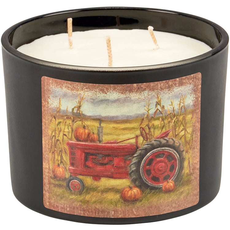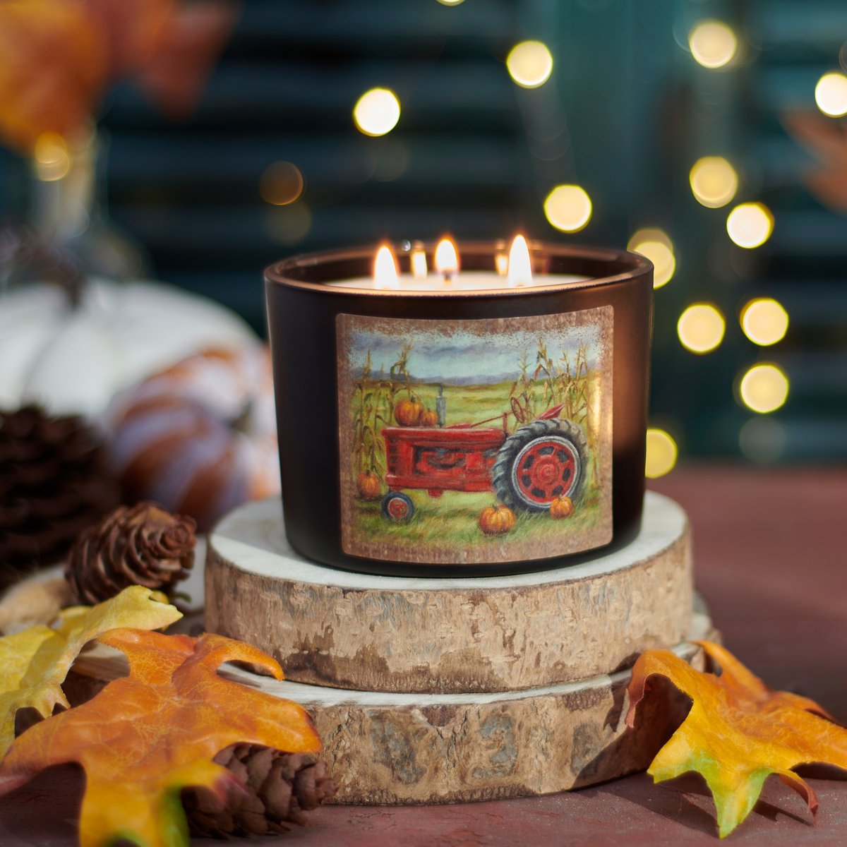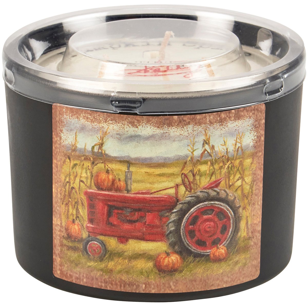 A jar candle from our Fall & Harvest Collection displaying a double-sided design of a farm scene with a red tractor and pumpkins on frosted black glass. Design is replicated from original artwork painted onto burlap canvas, giving the art a unique depth and texture. Seasonal candle features soy-based wax and 3 fabric wicks with 30 hours of burn time activating a calming Pumpkin Spice scent. Our Fall Tractor jar candle includes a dust cover and plastic lid for protection and polished appearance. A fall-themed home accent that is great for gifting.