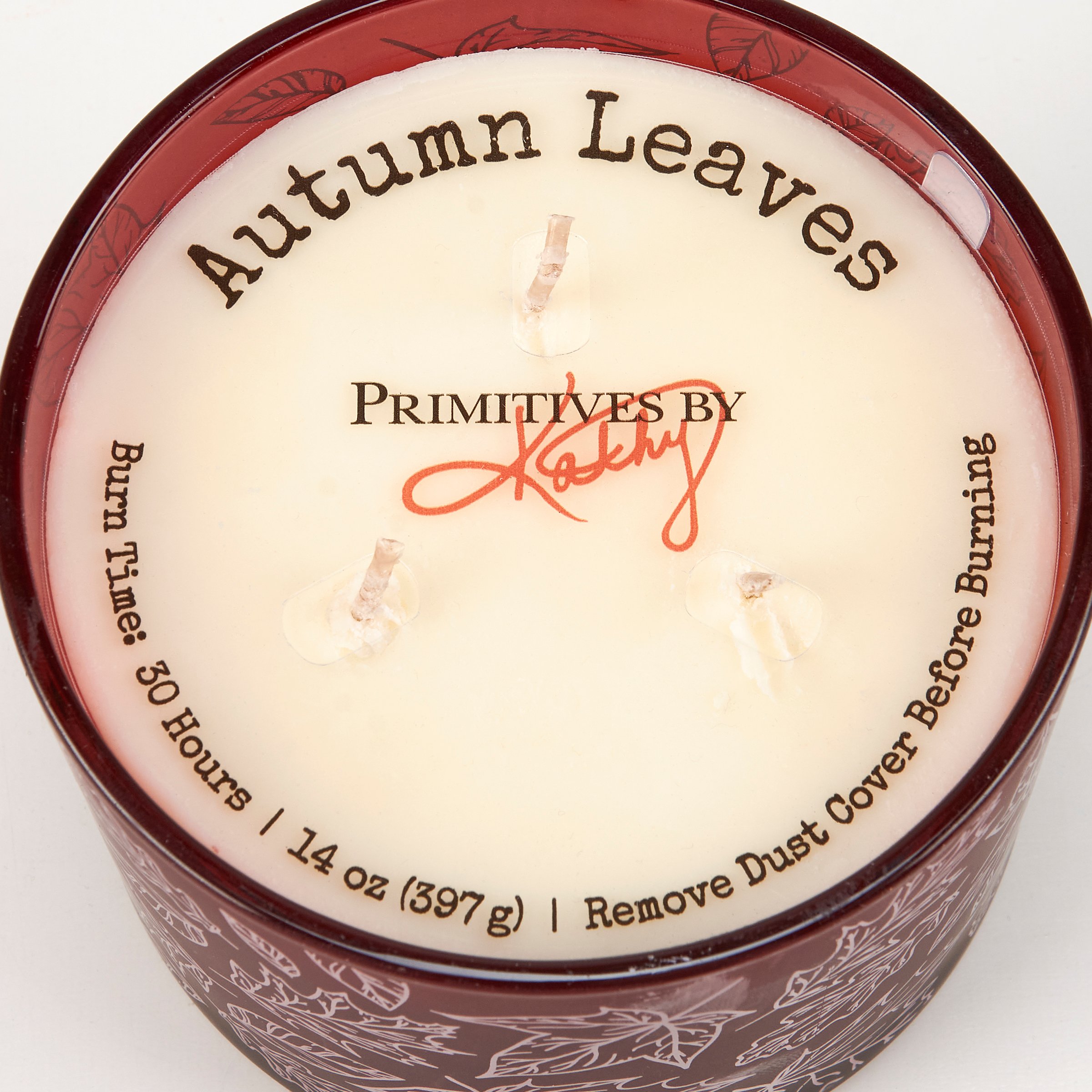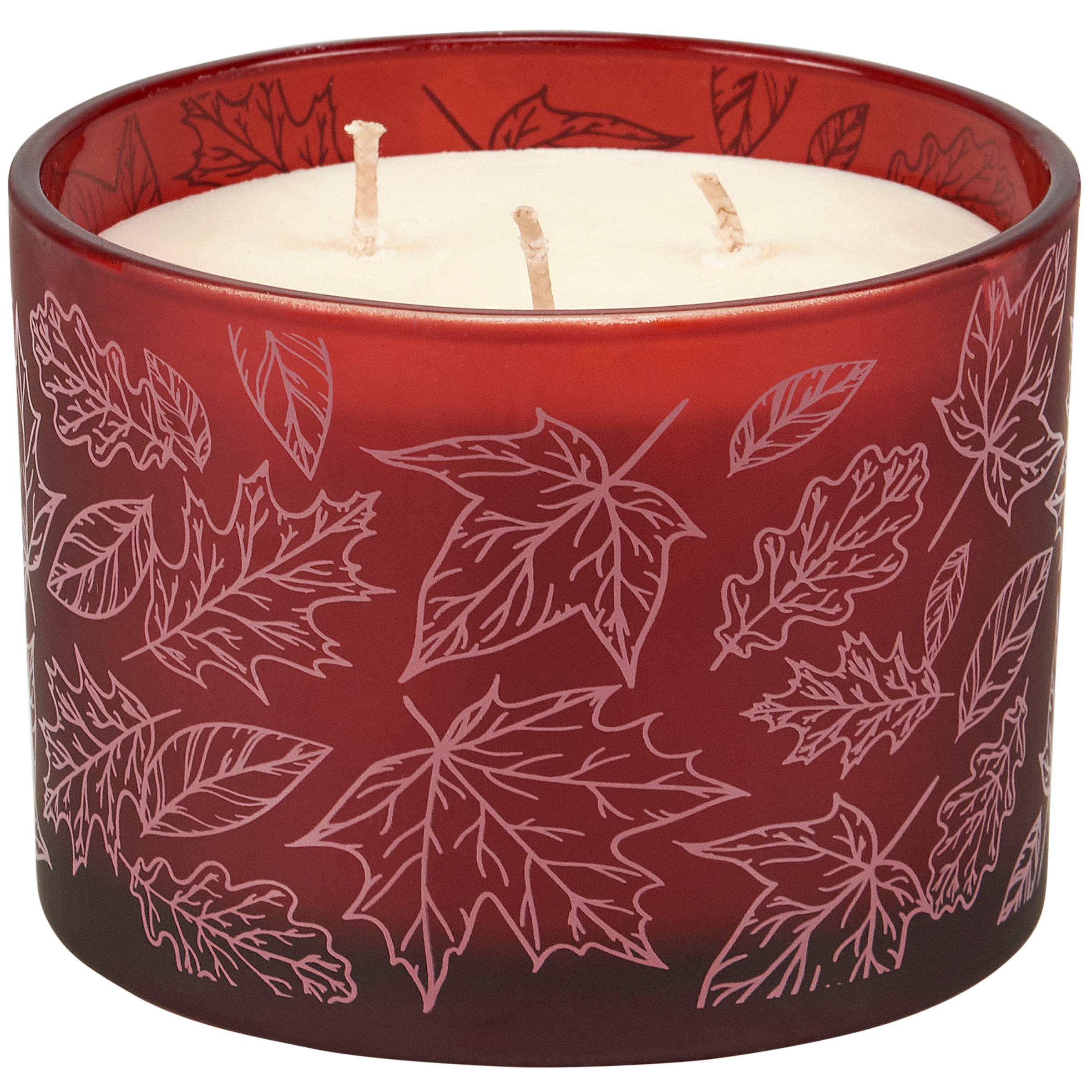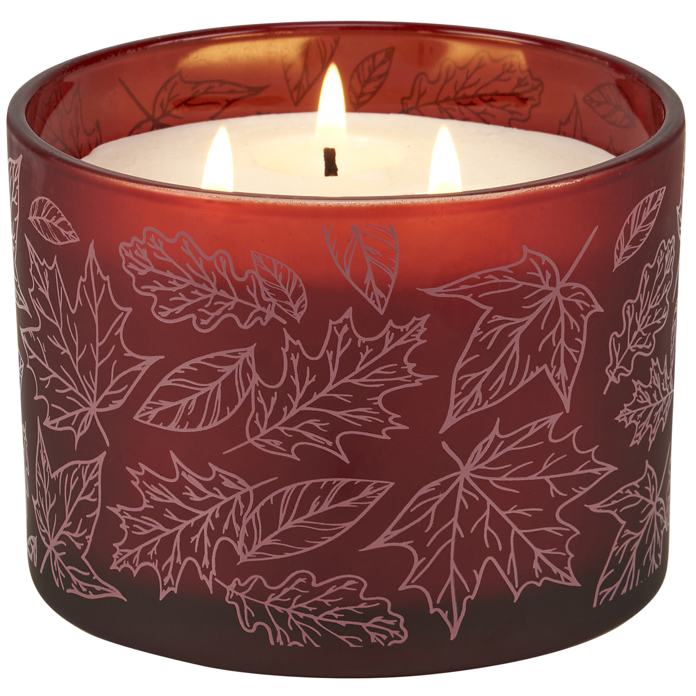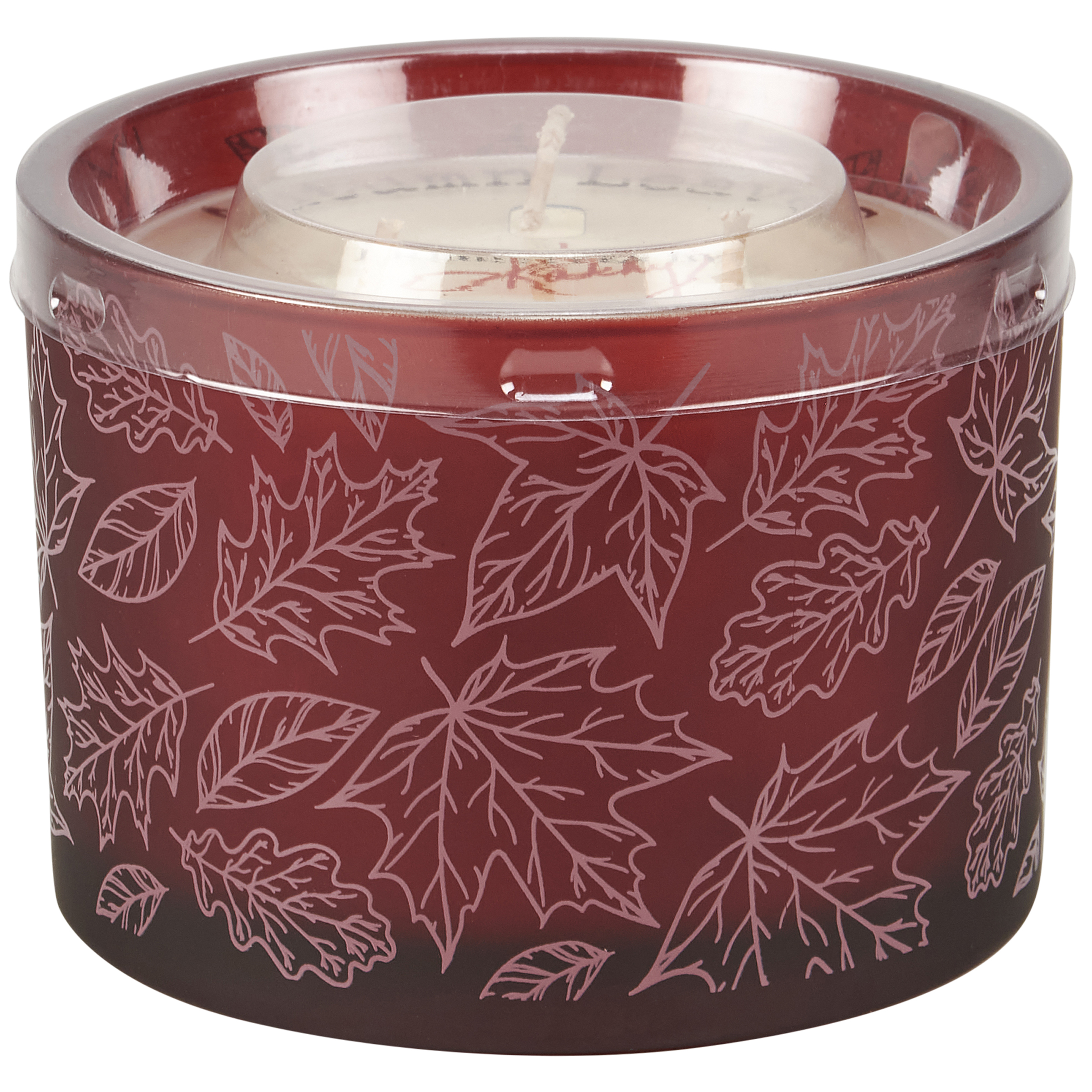 A jar candle from our Fall & Harvest Collection displaying a deep autumn red frosted glass background with hand illustrated designs of falling autumn leaves. Seasonal candle features soy-based wax and 3 fabric wicks with 30 hours of burn time activating a calming Autumn Leaves scent. Our Falling Leaves jar candle includes a dust cover and plastic lid for protection and polished appearance. A fall-themed home accent that is great for gifting.