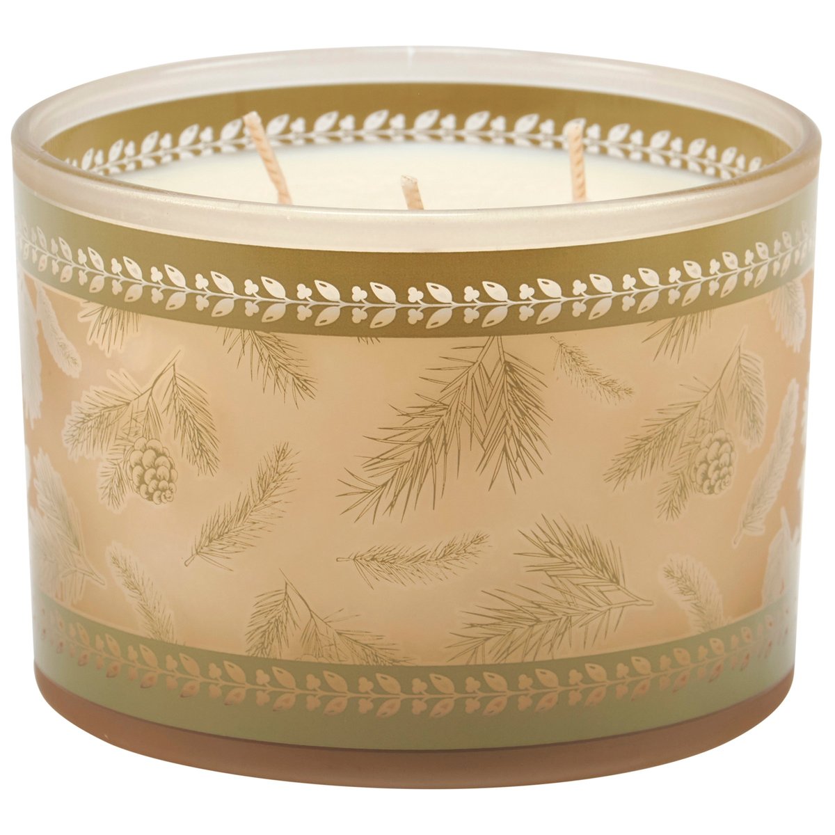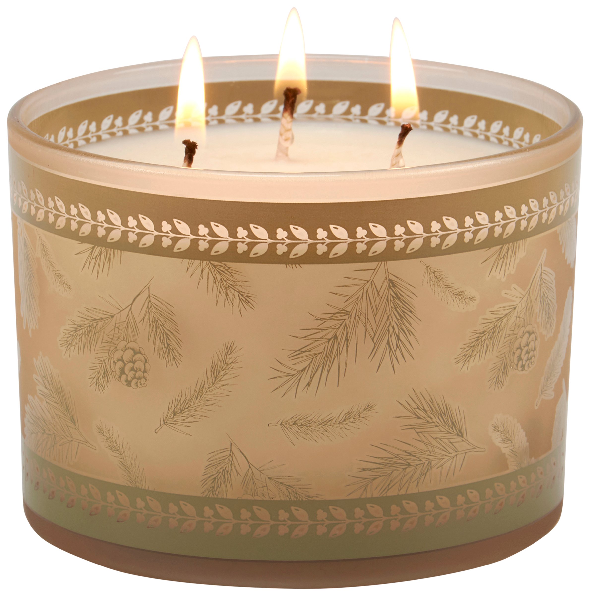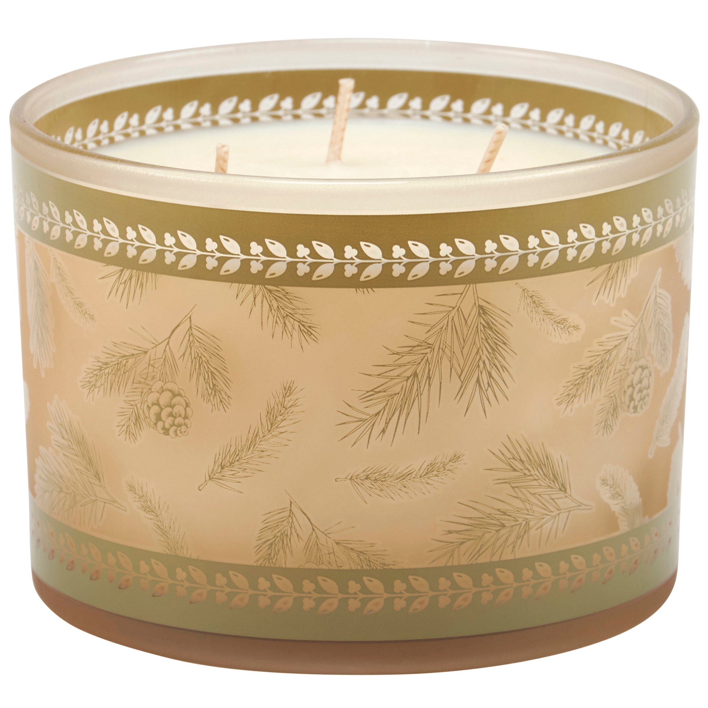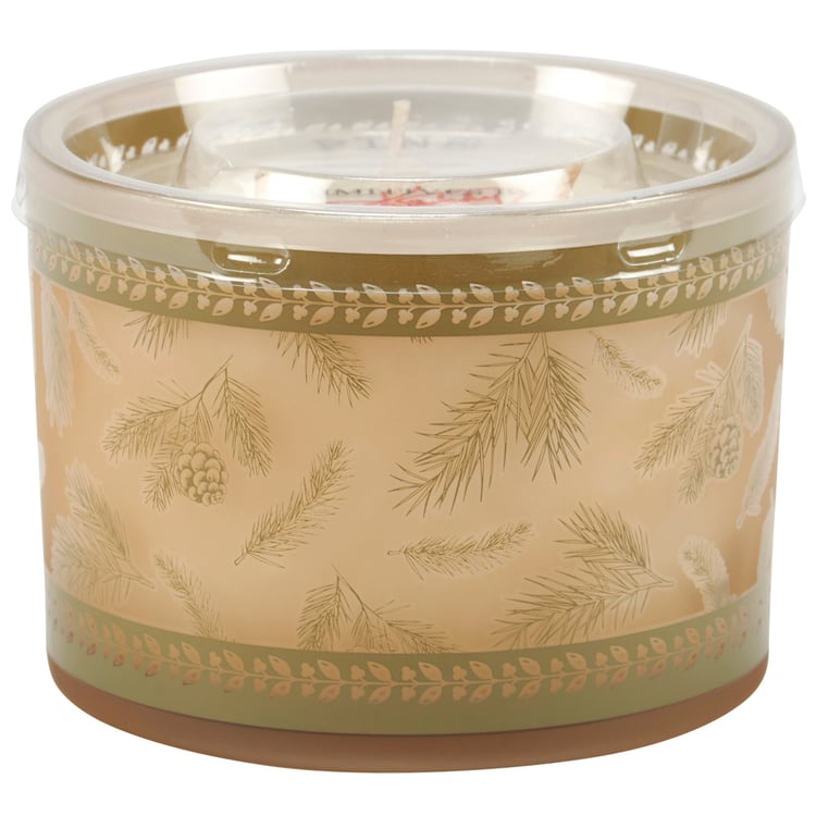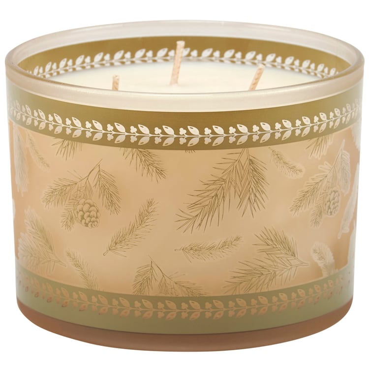 A candle from our Christmas Collection displaying a full wrap-around design of vintage fresh pine art on frosted brown glass. Vintage candle features soy-based wax and 3 fabric wicks with 30 hours of burn time activating a refreshing Pine scent. Our Fresh Pine candle includes a dust cover and plastic lid for protection and enhanced appearance on store displays. A seasonal home accent that coordinates well with cabin decor.
