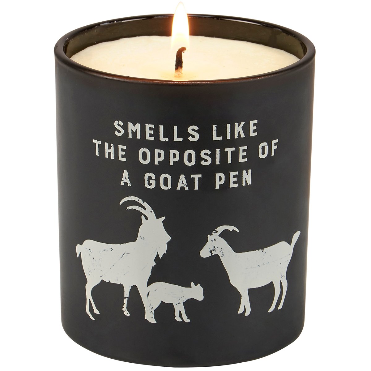 A jar candle from our Farmhouse Collection displaying a design of goats in a rustic style on matte black glass with a farm-themed sentiment that reads "Smells Like The Opposite Of A Goat Pen." Candle features soy-based wax and cotton wick with 35 hours of burn time activating a refreshing Fresh Air scent. Our Goat Pen jar candle includes a dust cover and plastic lid for protection and polished appearance. A fun farm-themed home accent that is great for gifting.
