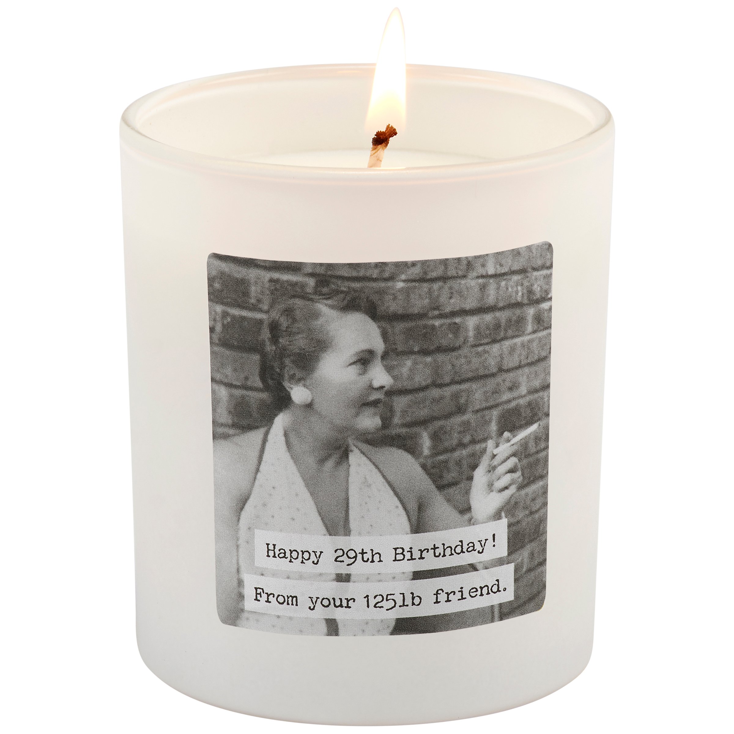 A jar candle from our Trash Talk By Annie Collection displaying a double-sided design of a vintage black and white photograph on frosted white glass complemented with a sassy birthday sentiment that reads "Happy 29th Birthday! From Your 125lb Friend." This funny candle features soy-based wax and a cotton wick with 35 hours of burn time activating a fun Birthday Cake scent. Our Happy 29th Birthday candle includes a dust cover and plastic lid for protection and enhanced appearance on store displays. A fun birthday gift perfect for adding personality to any home or work space.