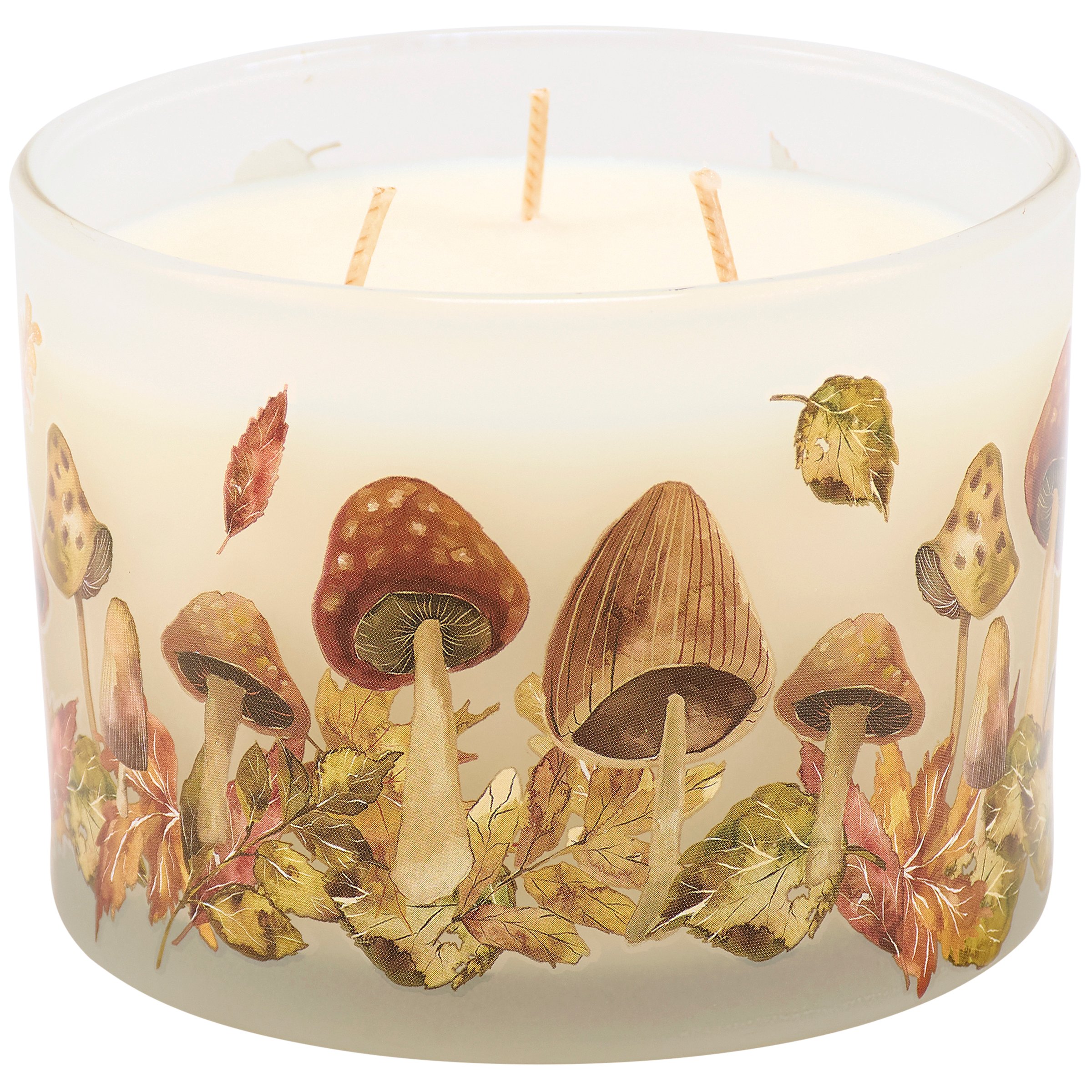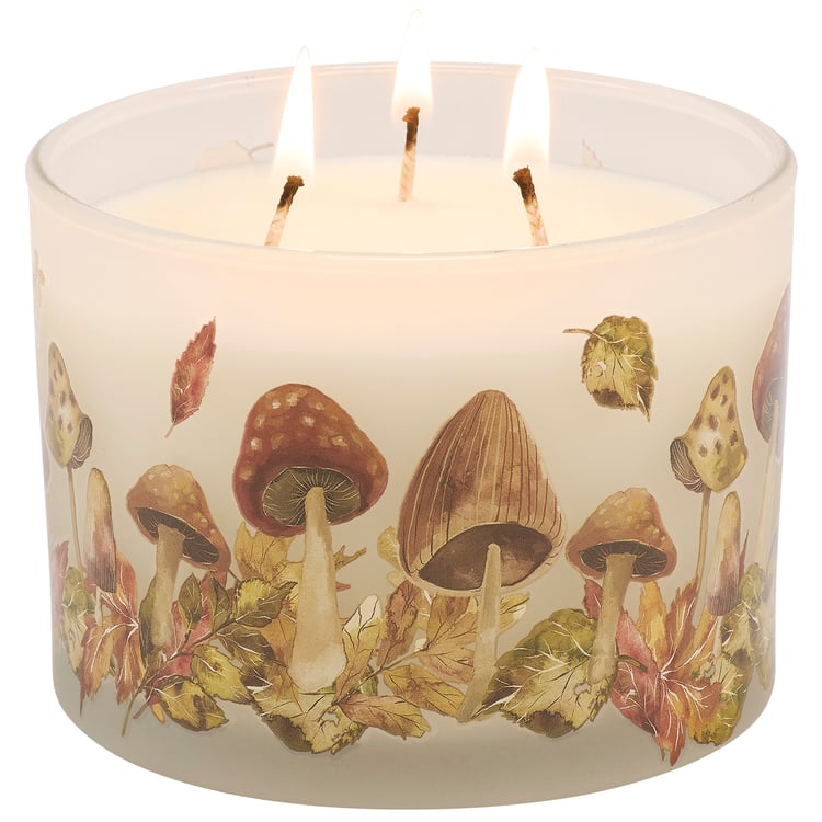 A candle from our Fall & Harvest Collection displaying a double-sided design of autumn leaves and mushrooms on frosted glass. Fall leaf design is replicated from original art hand painted in a watercolor style. Seasonal candle features soy-based wax and 3 fabric wicks with 30 hours of burn time activating an earthy Ebony scent. Our Harvest Leaves candle includes a dust cover and plastic lid for protection and enhanced appearance on store displays. A seasonal home accent that is great for gifting.
