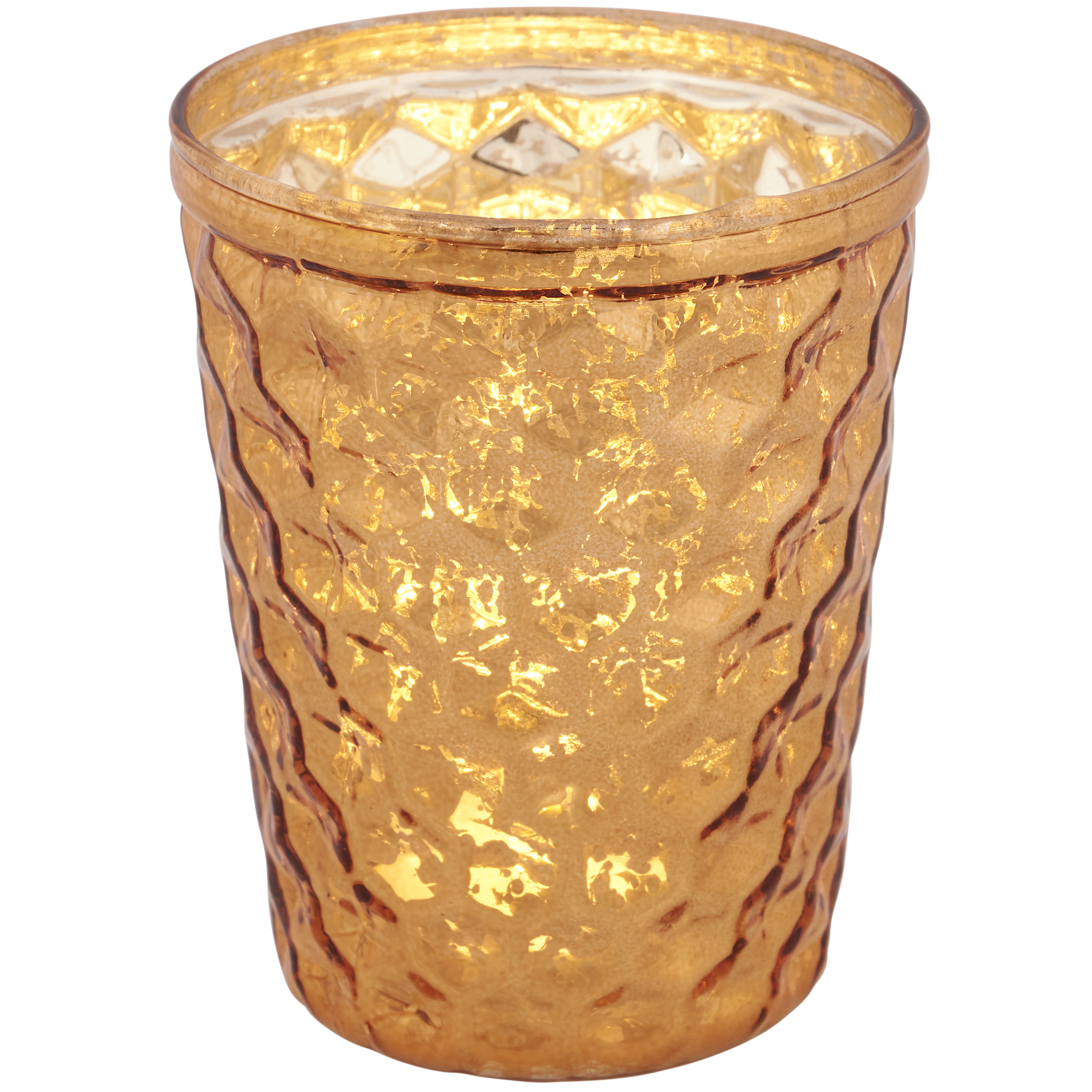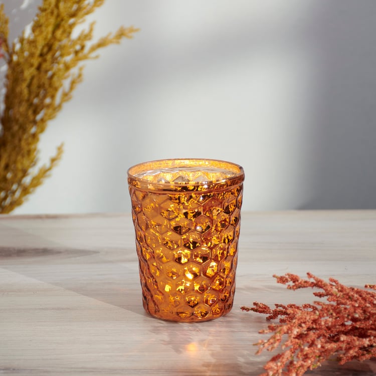 A glass candle holder from ourĀ Candle & Accessories Collection. Candle holder displays an amber inspired glass with textured pattern around the outside. Our Amber candle holder includes space inside to place a votive candle. Candle pictured not included. Perfect for a nature-themed home accent that adds natural lighting to any living space.