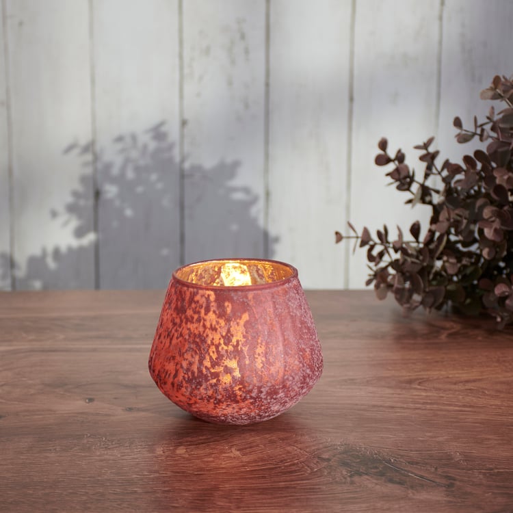 A glass candle holder from ourĀ Fall & Harvest Collection. Candle holder displays a blush inspired burgundy color with frosted and fleck accents. Our Burgundy candle holder includes space inside to place a votive candle. Candle pictured not included. Perfect for a stylish seasonal home accent that adds natural lighting to any living space.