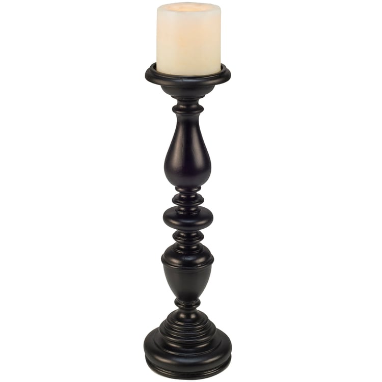 A candle holder from ourĀ Home Collection featuring a dark black color and classic candlestick design with space at the top for a single candle. Our Classic candle holder fits a candle up to 3 inches and can free-stand on flat surface. Candle pictured not included. A stylish home accent perfect for adding natural lighting to any living space.