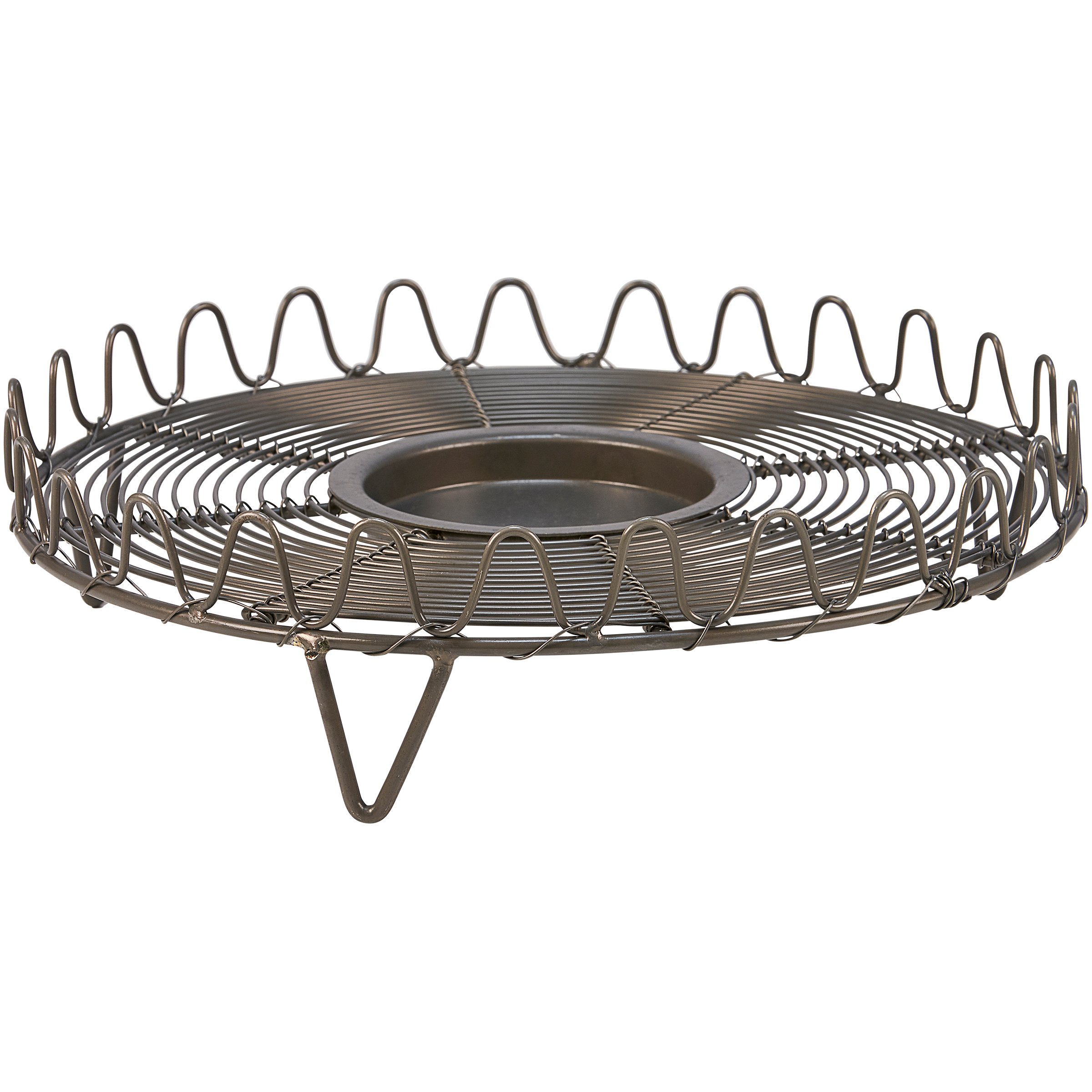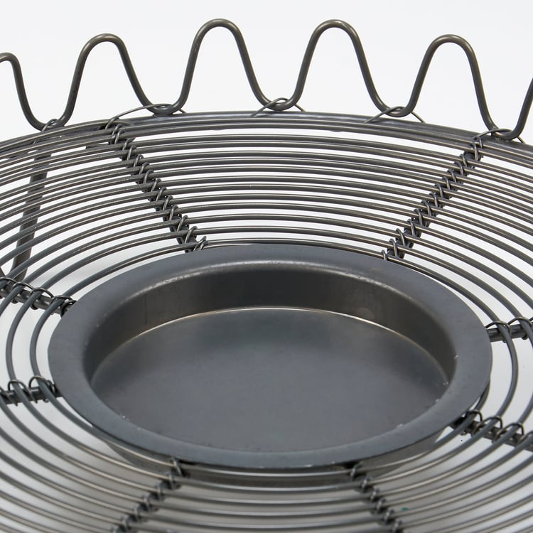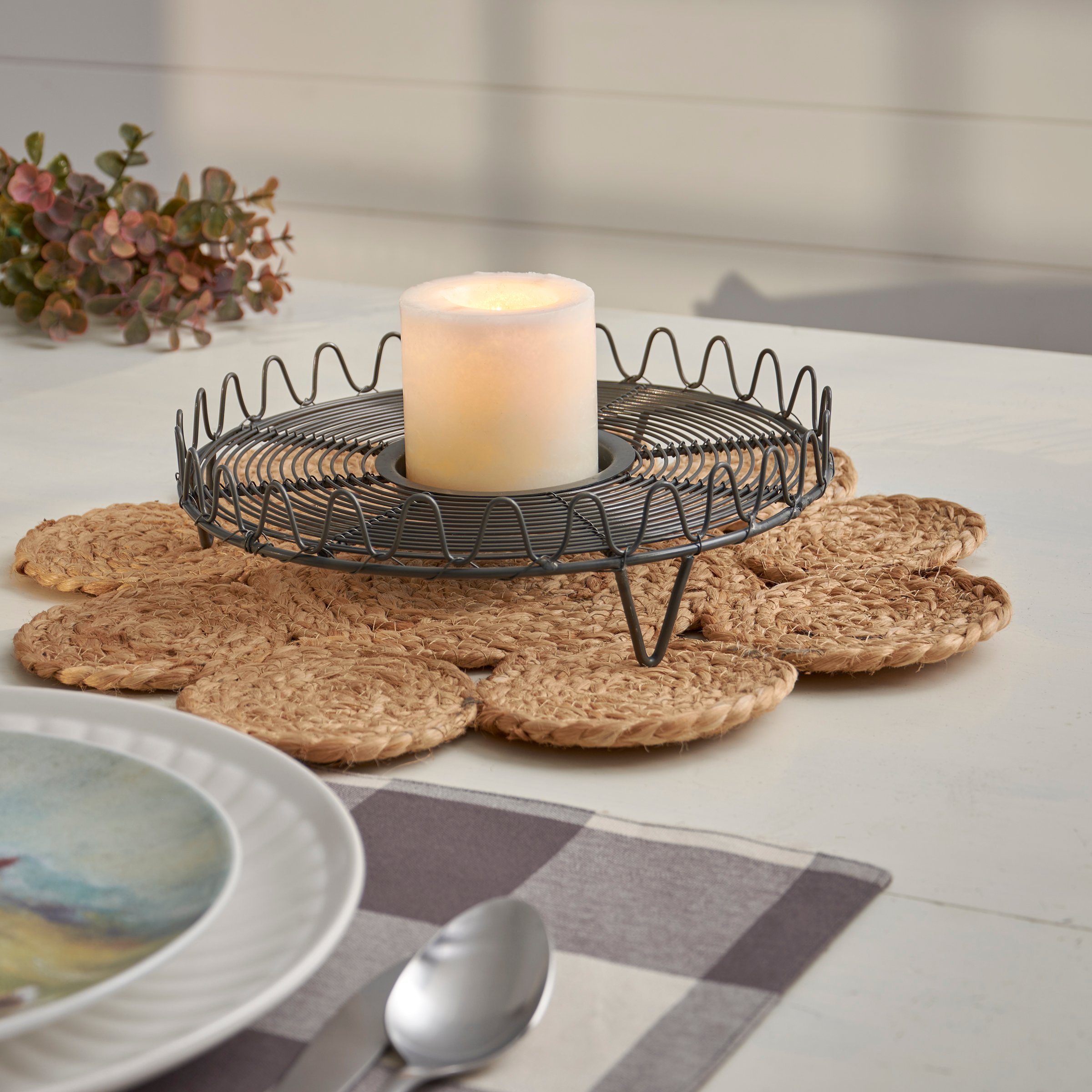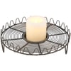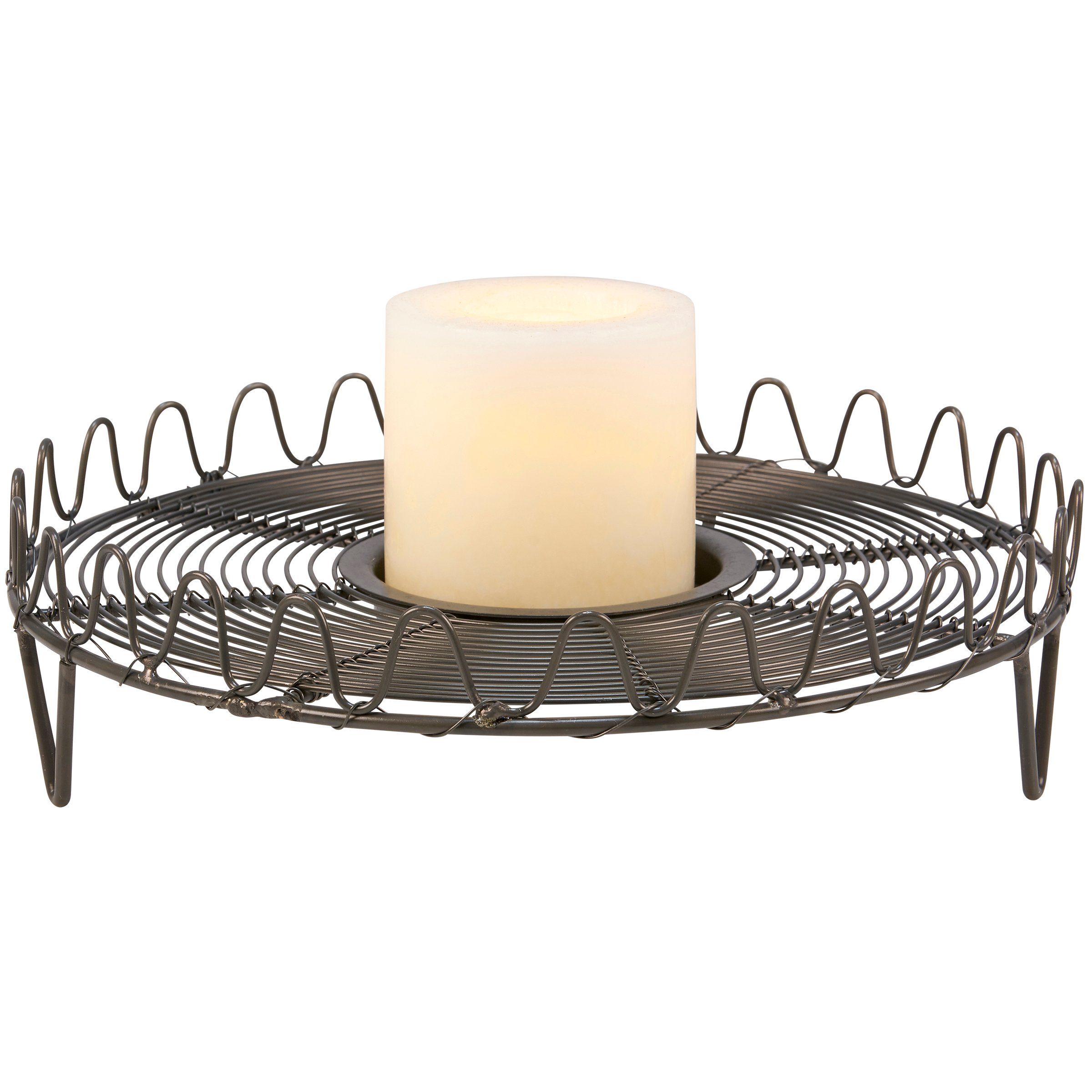 A metal candle holder from ourĀ Farmhouse Collection. Candle holder base features a round metal wire design in a dark gray finish with wave design border and a metal slot in the center that fits up to a 3" candle. Candle not included. Our Farmhouse candle holder is perfect for a rustic home accent.