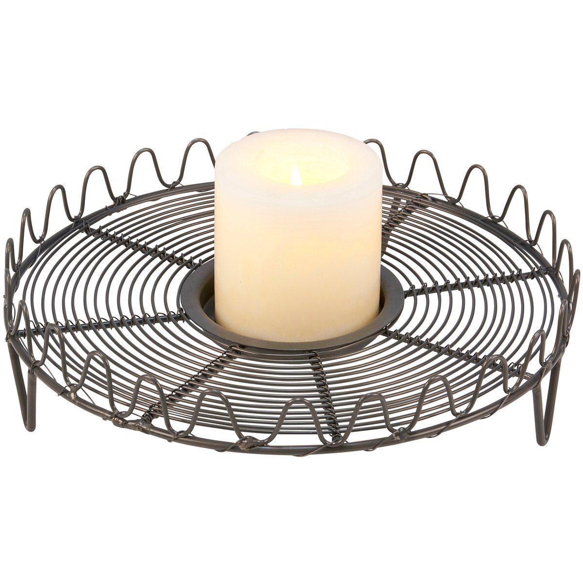A metal candle holder from ourĀ Farmhouse Collection. Candle holder base features a round metal wire design in a dark gray finish with wave design border and a metal slot in the center that fits up to a 3" candle. Candle not included. Our Farmhouse candle holder is perfect for a rustic home accent.