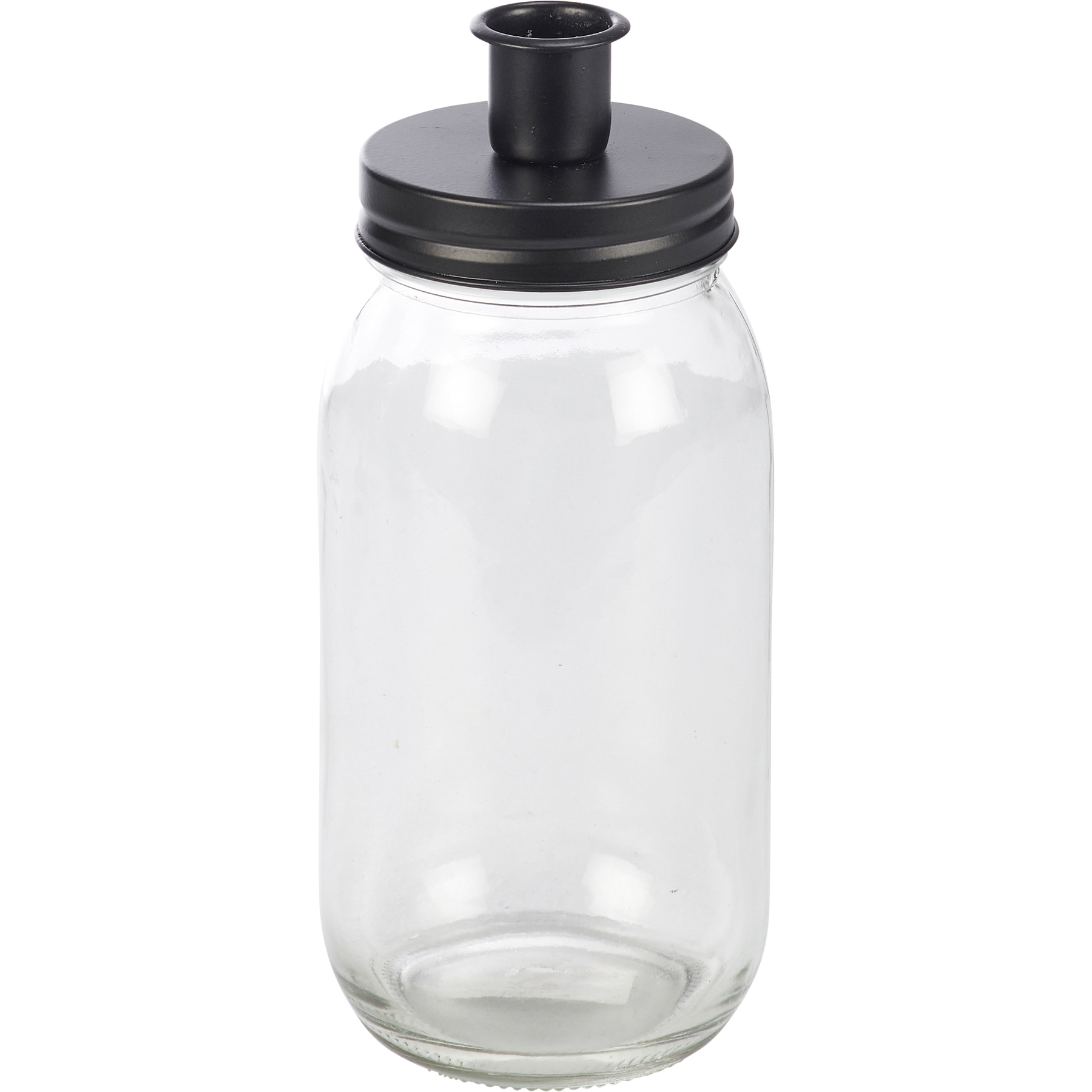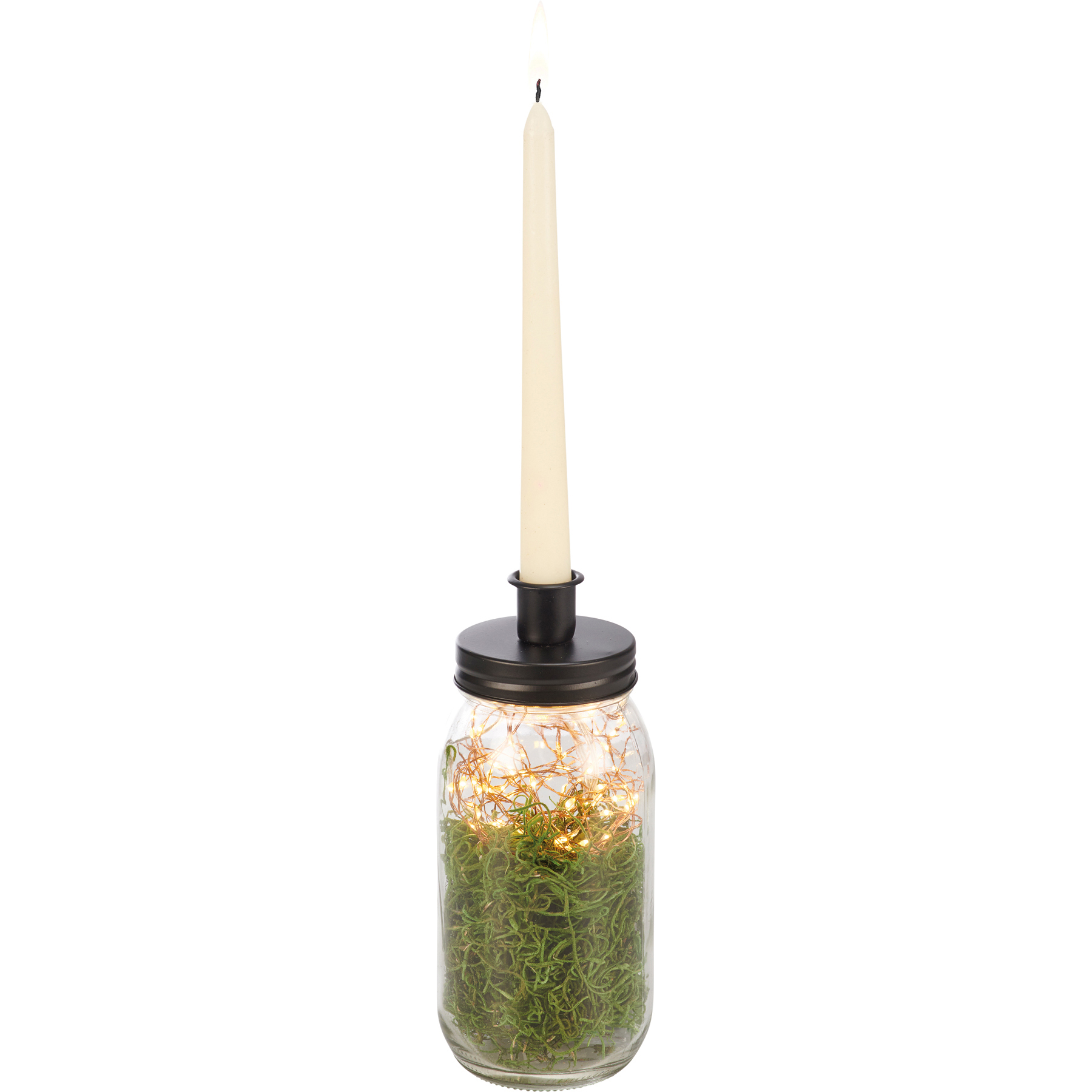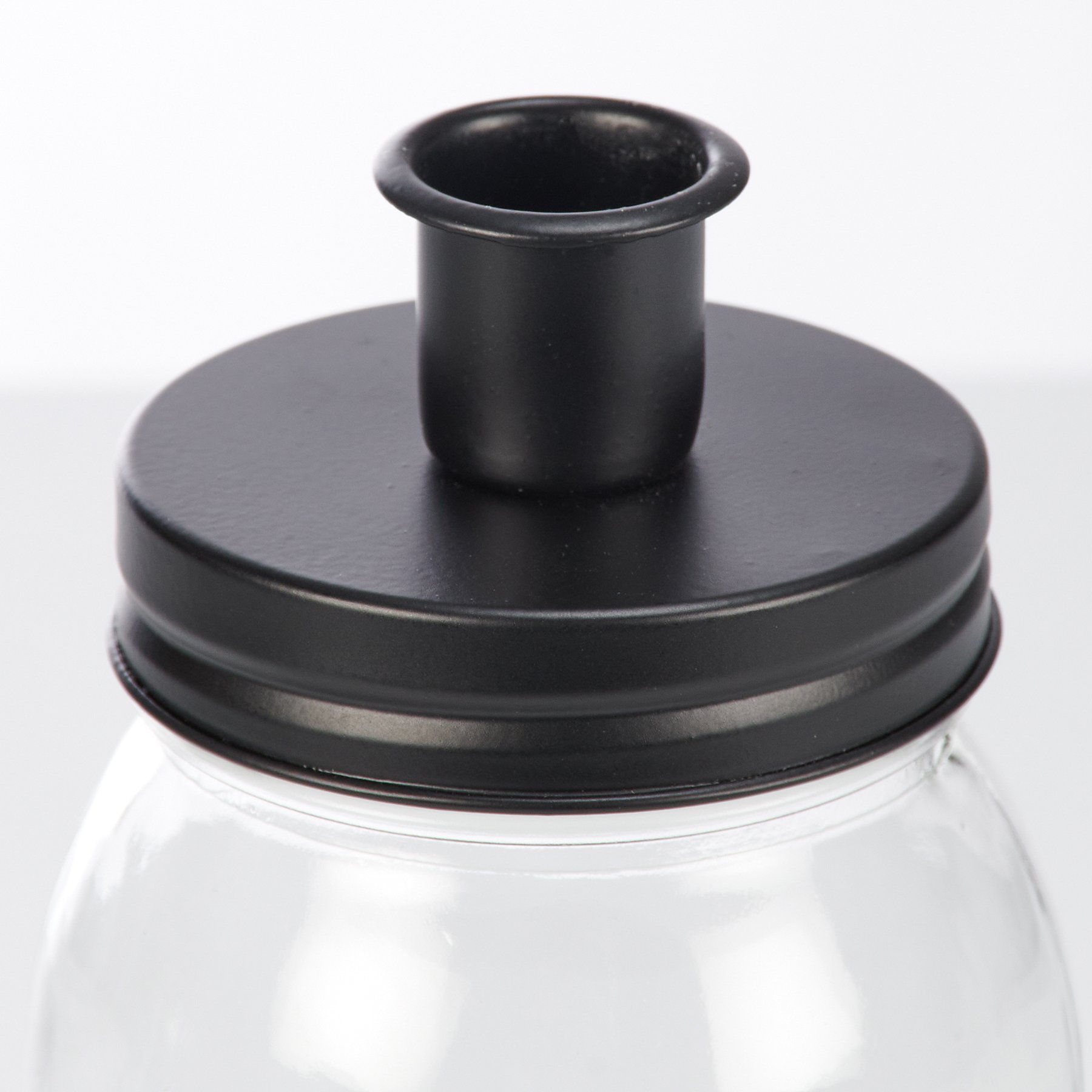 A rustic candle holder from our Home Accents Collection displaying a mason jar aesthetic. The lid of the jar features candle holder on top and can be removed to customize jar with decorative filler. Our Mason Jar candle holder is a versatile home accent. Candle not included.