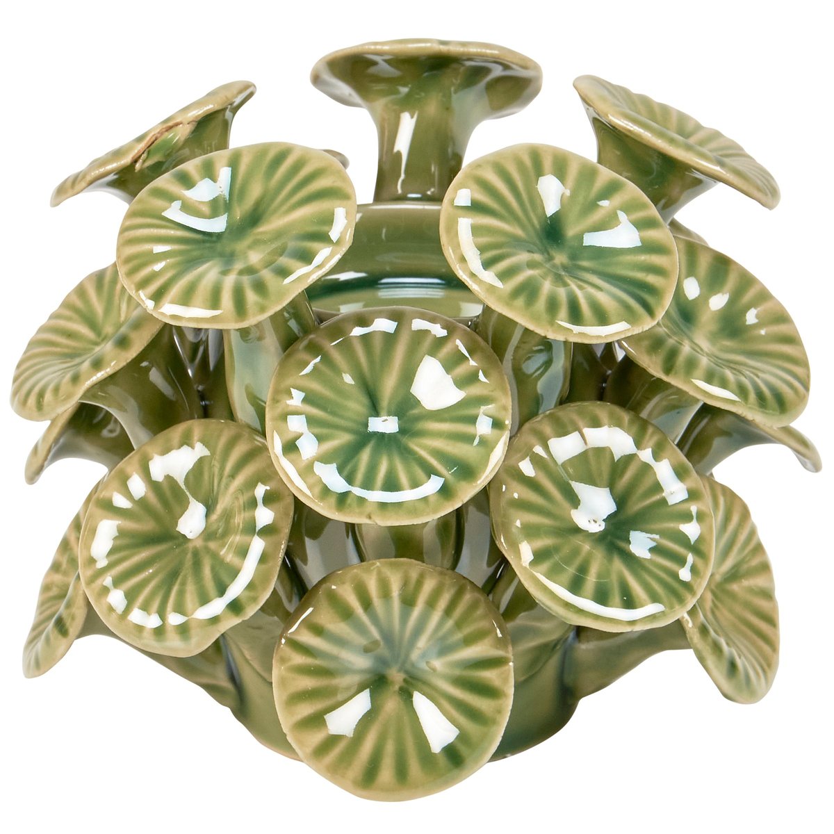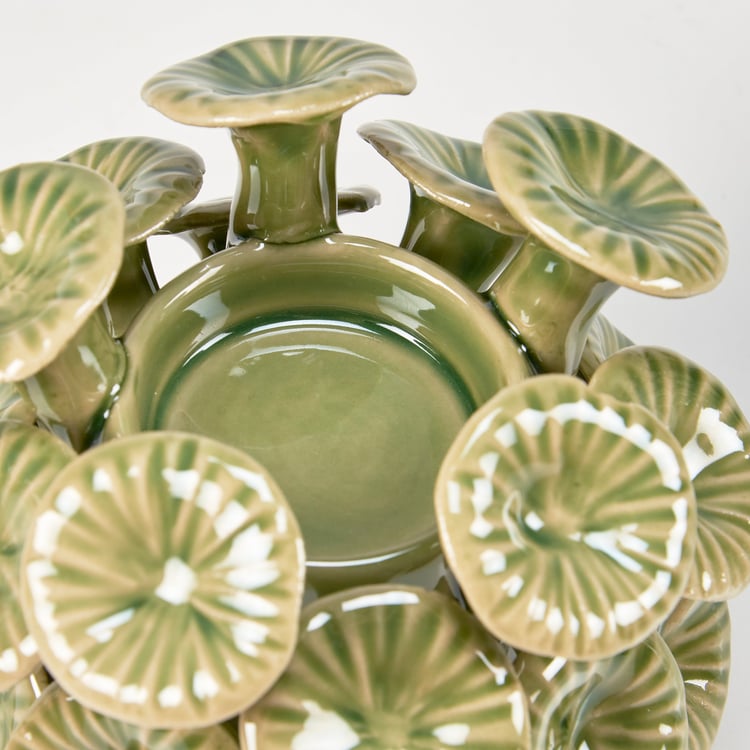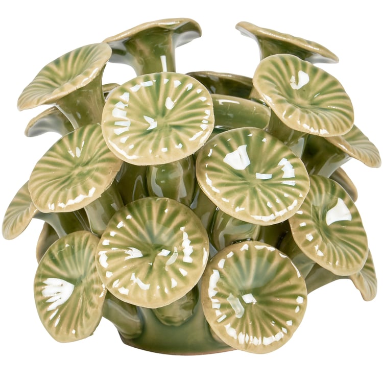 A ceramic candle holder that coordinates well with décor from our Cottagecore Collection. Candle holder features a dimensional mushroom blooms inspired design with a green glaze finish and center slot for a single candle. Our Mushroom Bloom candle holder fits a standard tealight candle and can free-stand on flat surface. Candle not included. A charming home accent perfect for adding natural lighting to any living space.