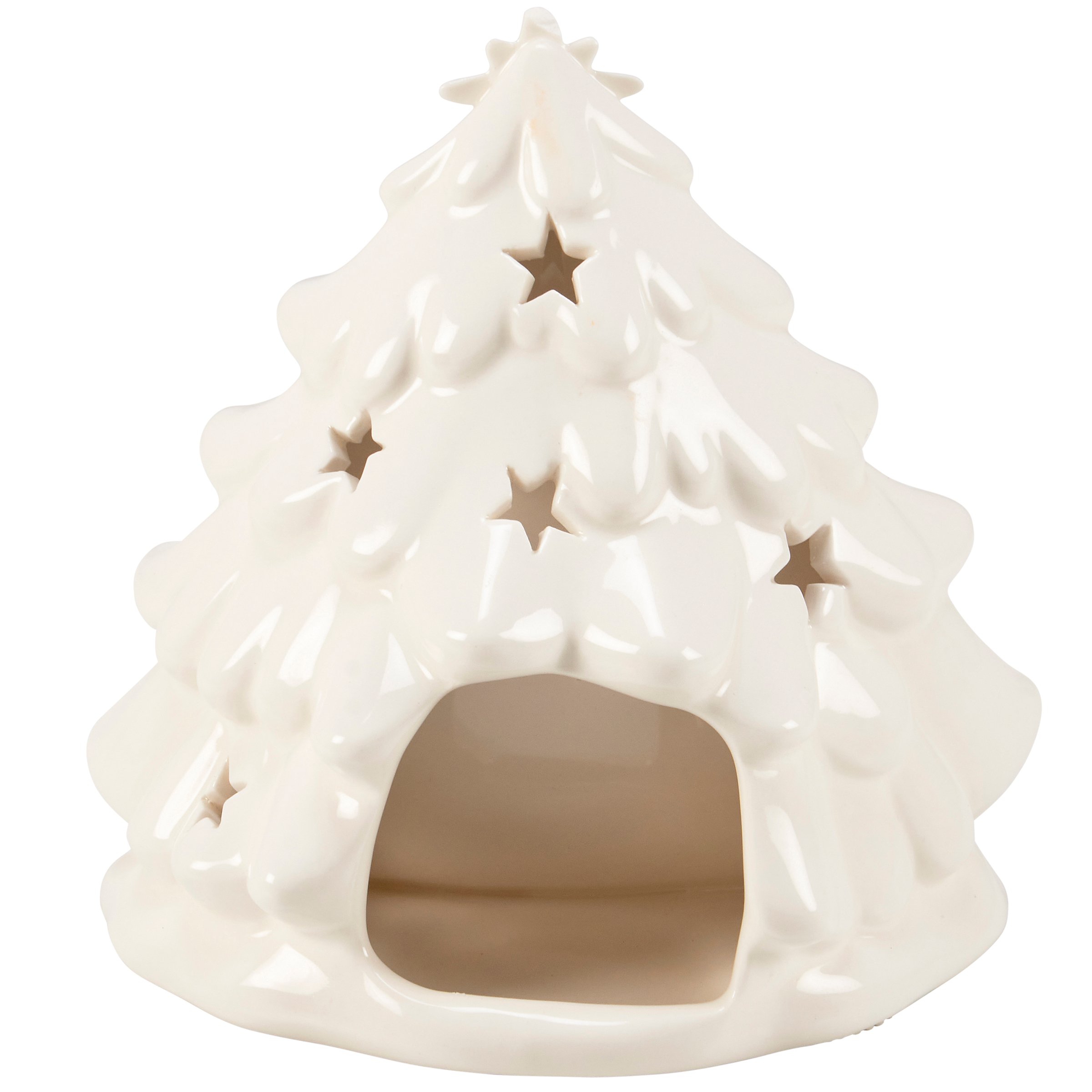 A ceramic candle holder that coordinates well with décor from our Christmas Collection. Seasonal candle holder features a sculpted nativity and Christmas tree design with simple glaze finish and a space in the back for a single candle that illuminates the cutout star designs throughout the tree. Our Nativity candle holder fits a standard tealight candle and can free-stand on flat surface. Candle pictured not included. A nativity-themed home accent perfect for adding natural lighting to any living space.