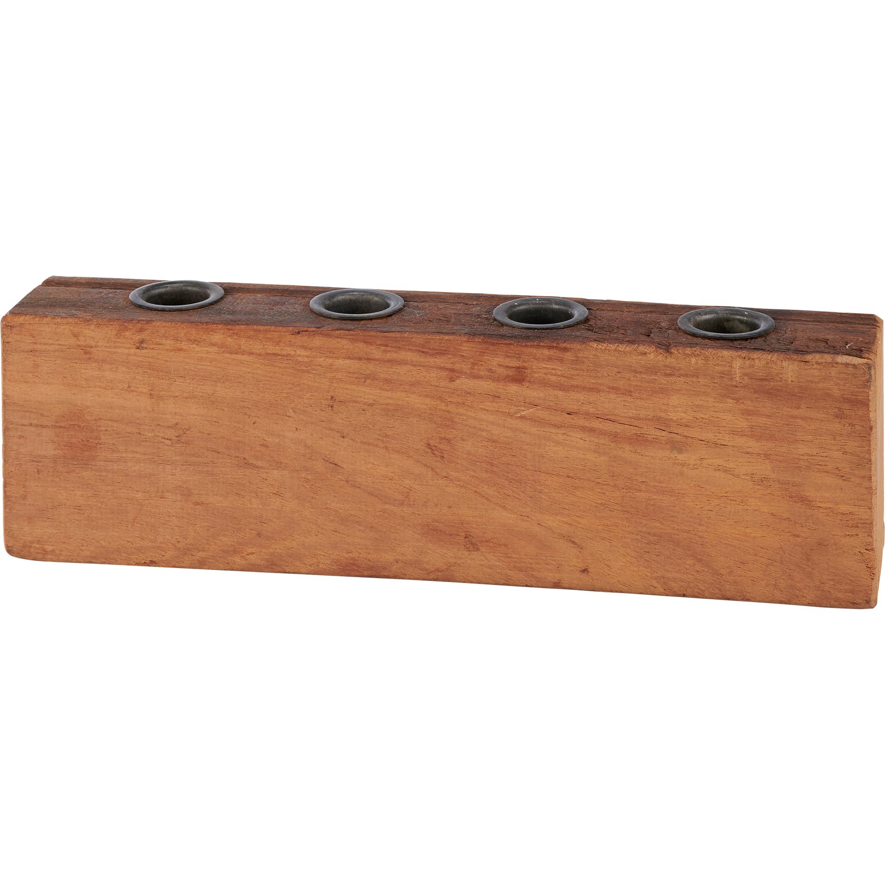 A wooden candle holder from our Primitive Collection. Holder features wooden base with aged appearance and four metal slots for candles. Our Primitive Wood candle holder is perfect for an antique style home accent.
