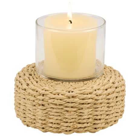 A candle holder from our Beach Collection displaying a woven rattan design. Beach candle holder features a sturdy rattan base with a center slot for a glass holder to place various light sources. Our Rattan candle holder fits up to a votive candle and can free-stand on flat surface. Candle pictured not included. A beach-themed home accent for adding natural lighting to any living space.