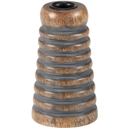 A wooden candle holder that coordinates well with bee-themed décor from our Garden Collection. Candle holder features natural stain wood with a ribbed cone shape similar to a beehive and space at the top for a single candle. Our Ribbed Cone candle holder fits standard taper candles and can free-stand on flat surface. Candle pictured not included. A rustic home accent perfect for adding natural lighting to any space.