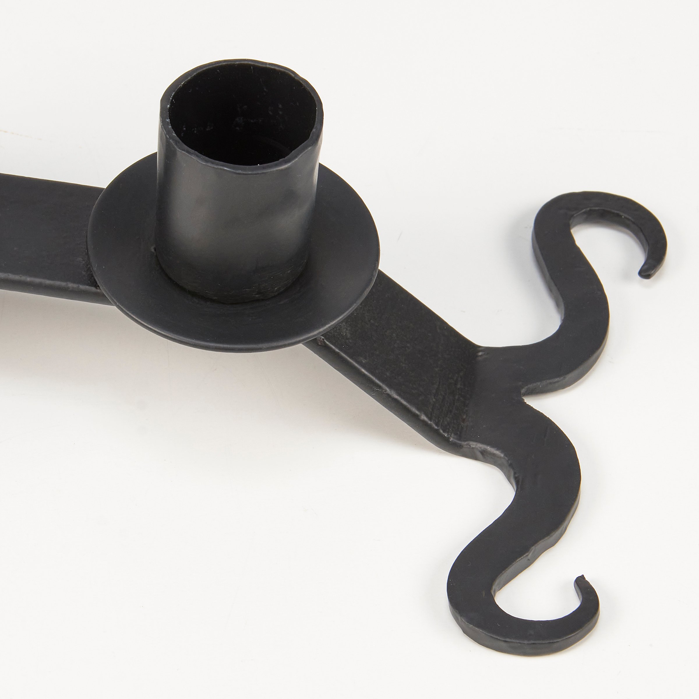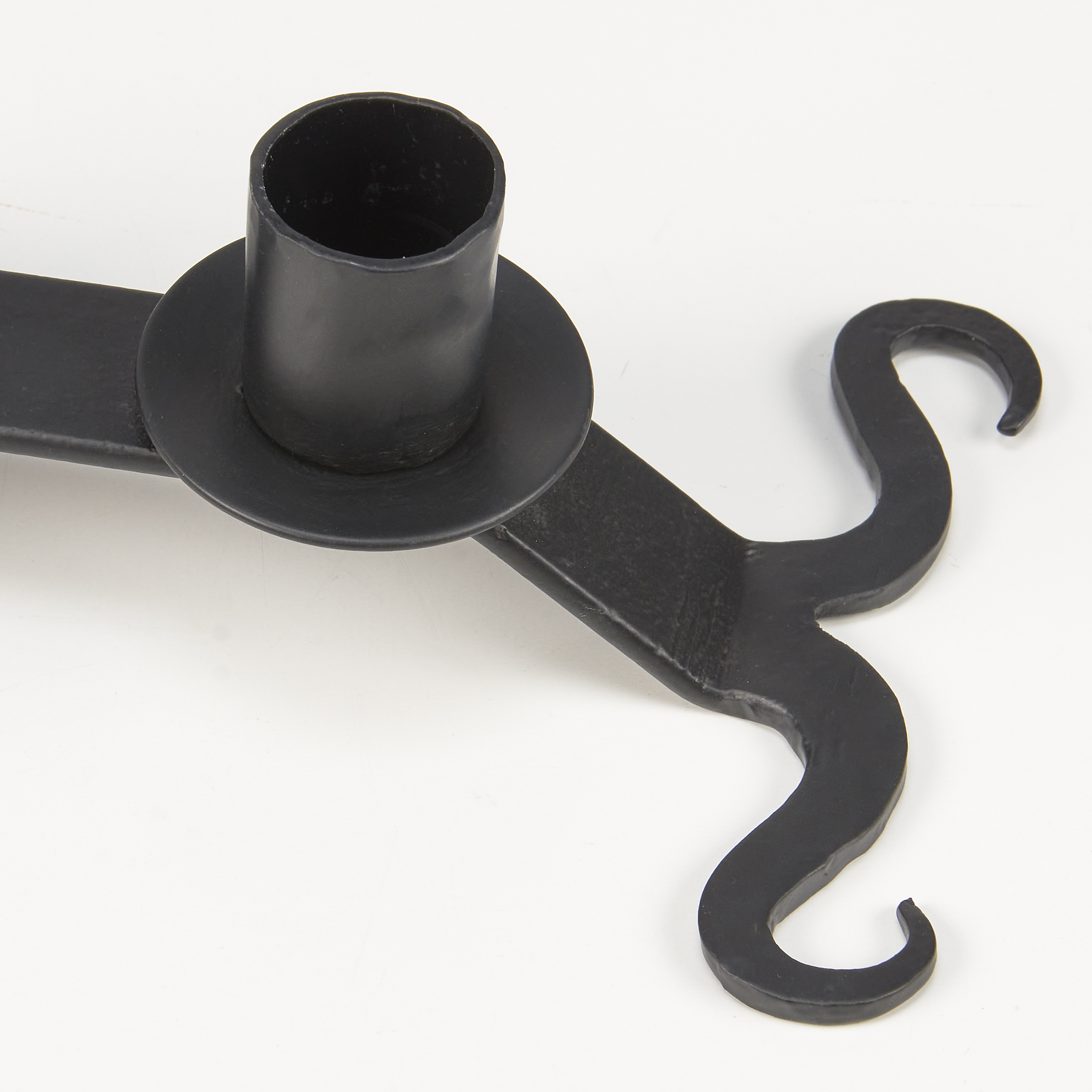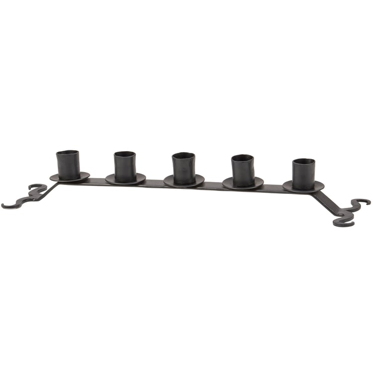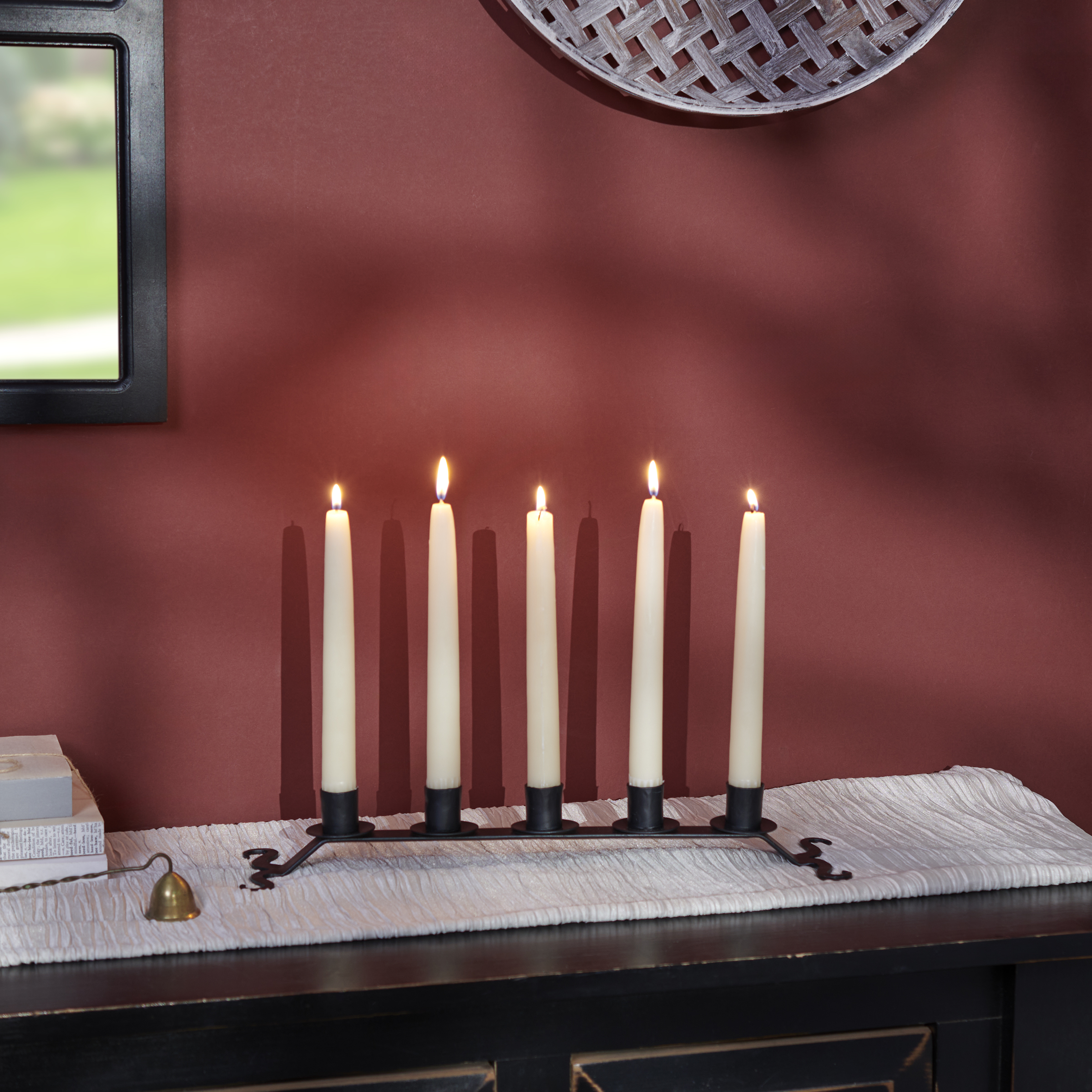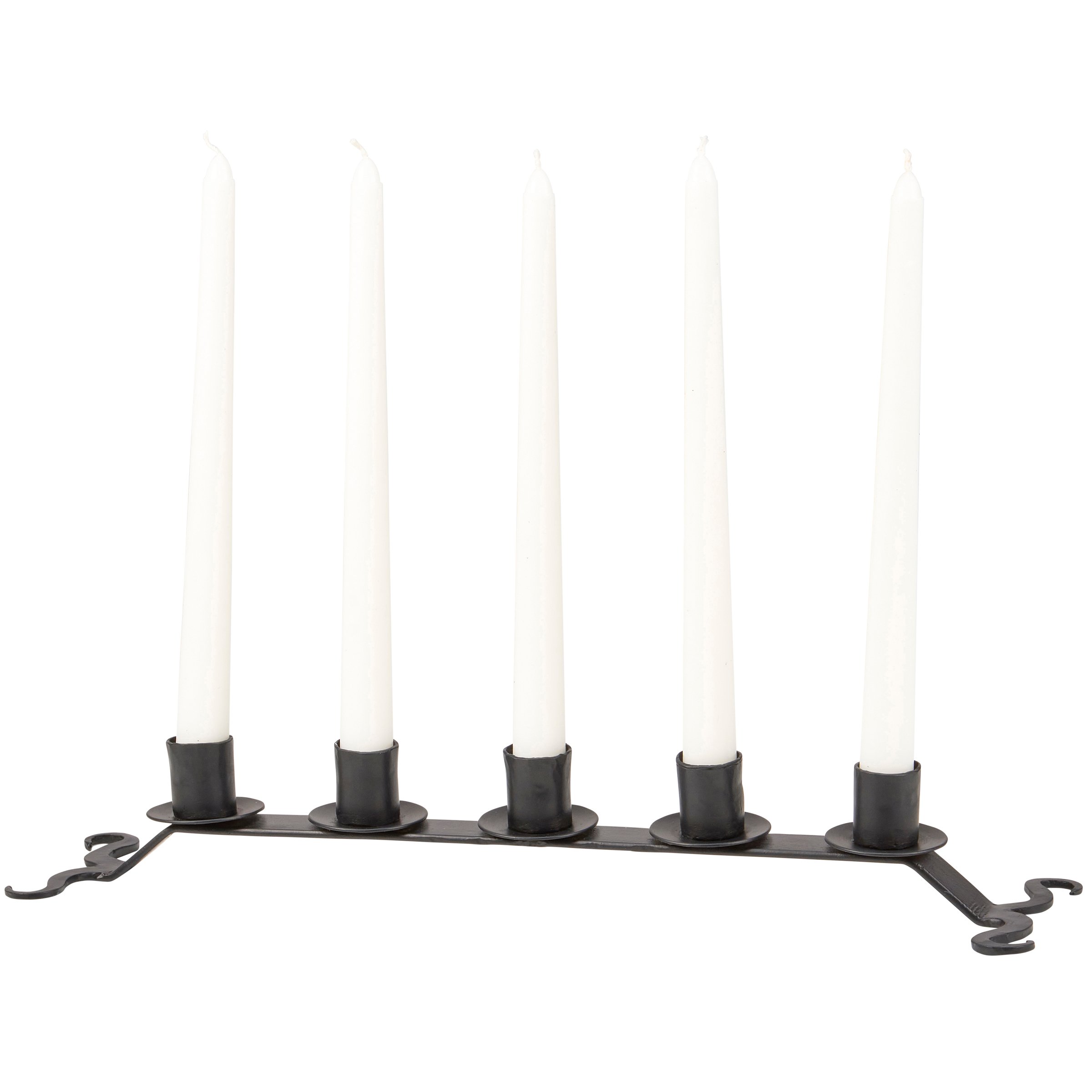 A metal candle holder from ourĀ Primitive Collection featuring a dark black color and iron fence inspired design with a row of 5 spaces for candles to be displayed. Our Rustic Iron candle holder fits standard taper candles and can free-stand on flat surface. Candles pictured not included. A classic home accent perfect for adding natural lighting to any living space.
