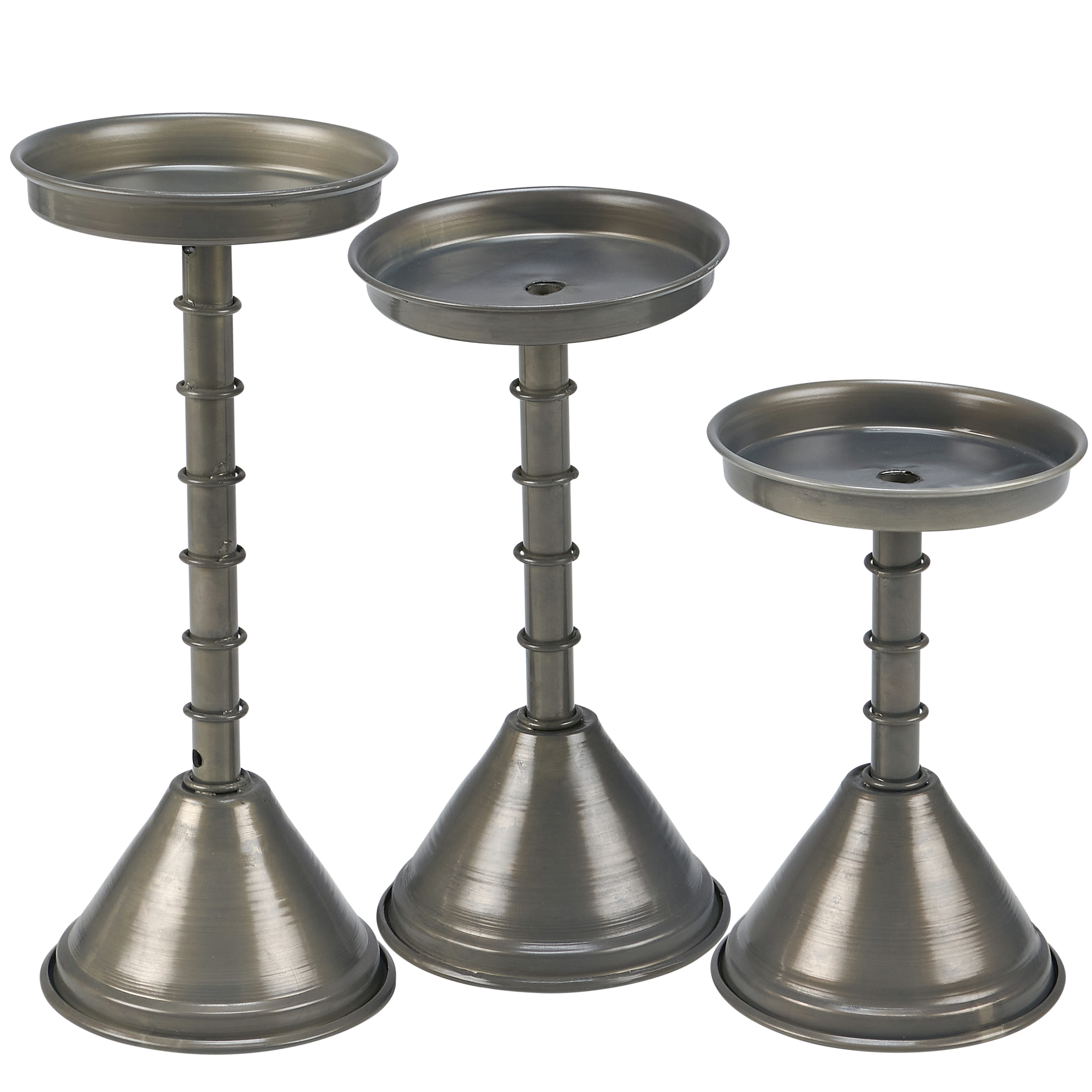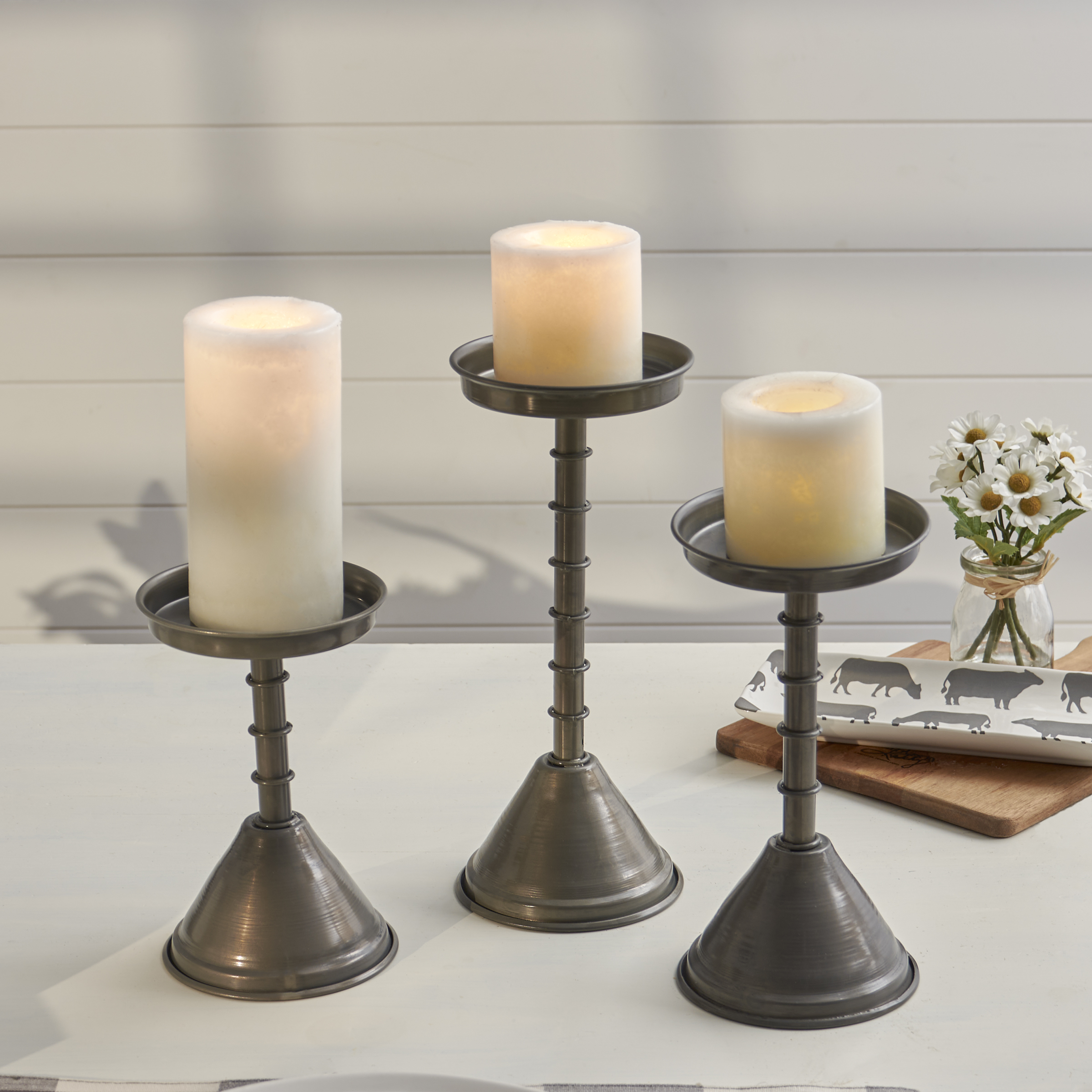 A set of metal candle holders from ourĀ Farmhouse Collection including three holders of different height. Candle holder bases feature funnel design with metal coil accents up to the top that fits up to a 4.25" candle. Candles not included. Our Funnels candle holder set is perfect for a rustic home accent.
