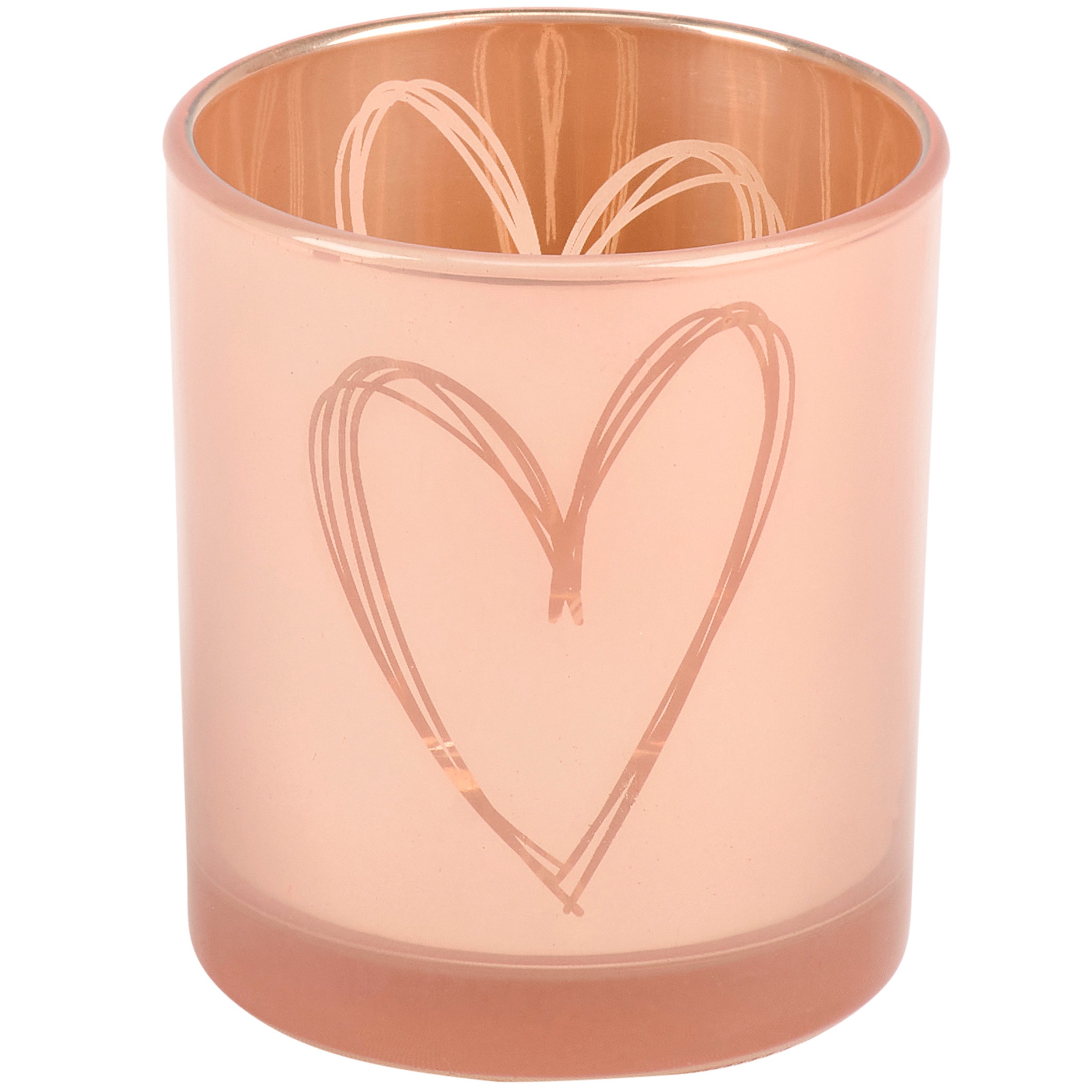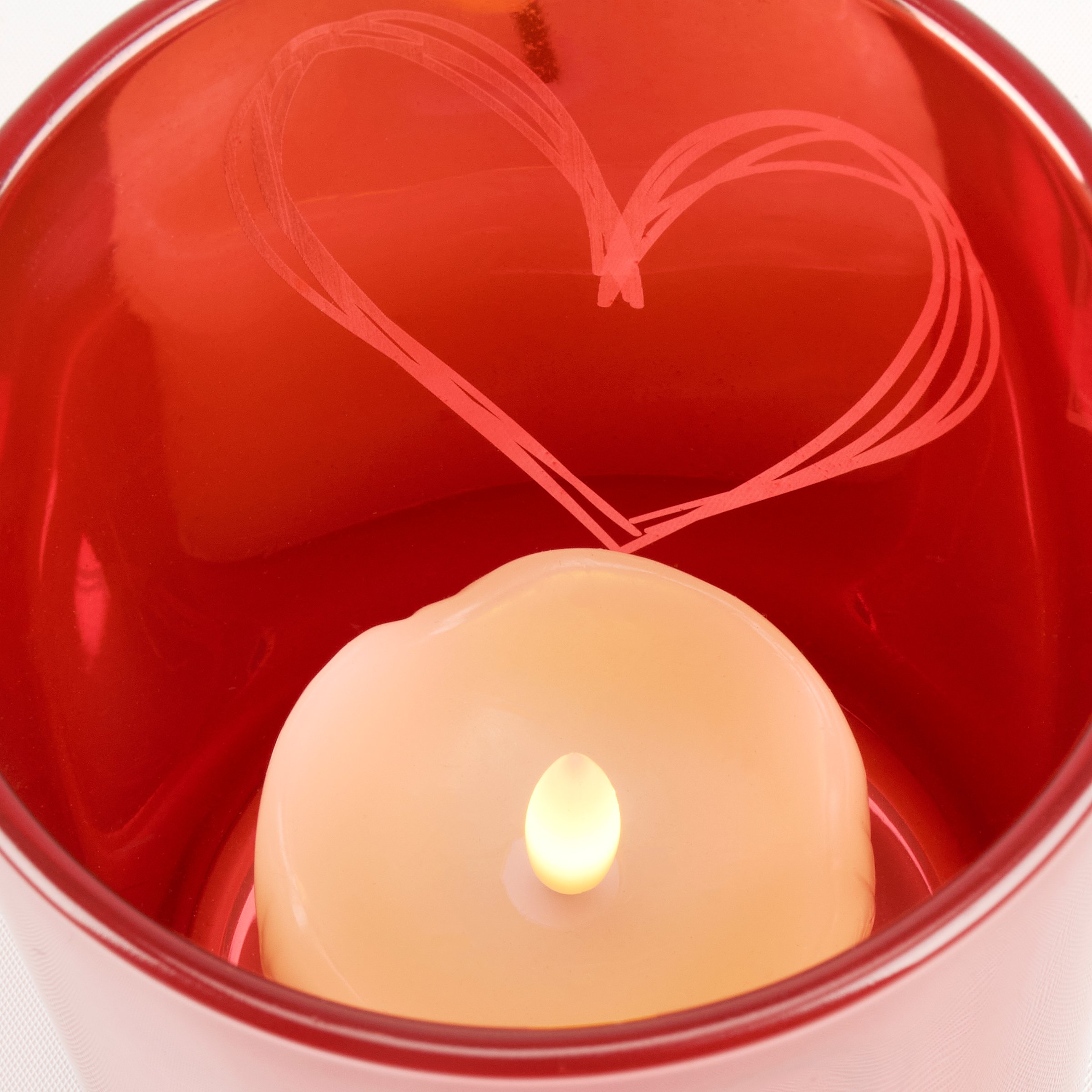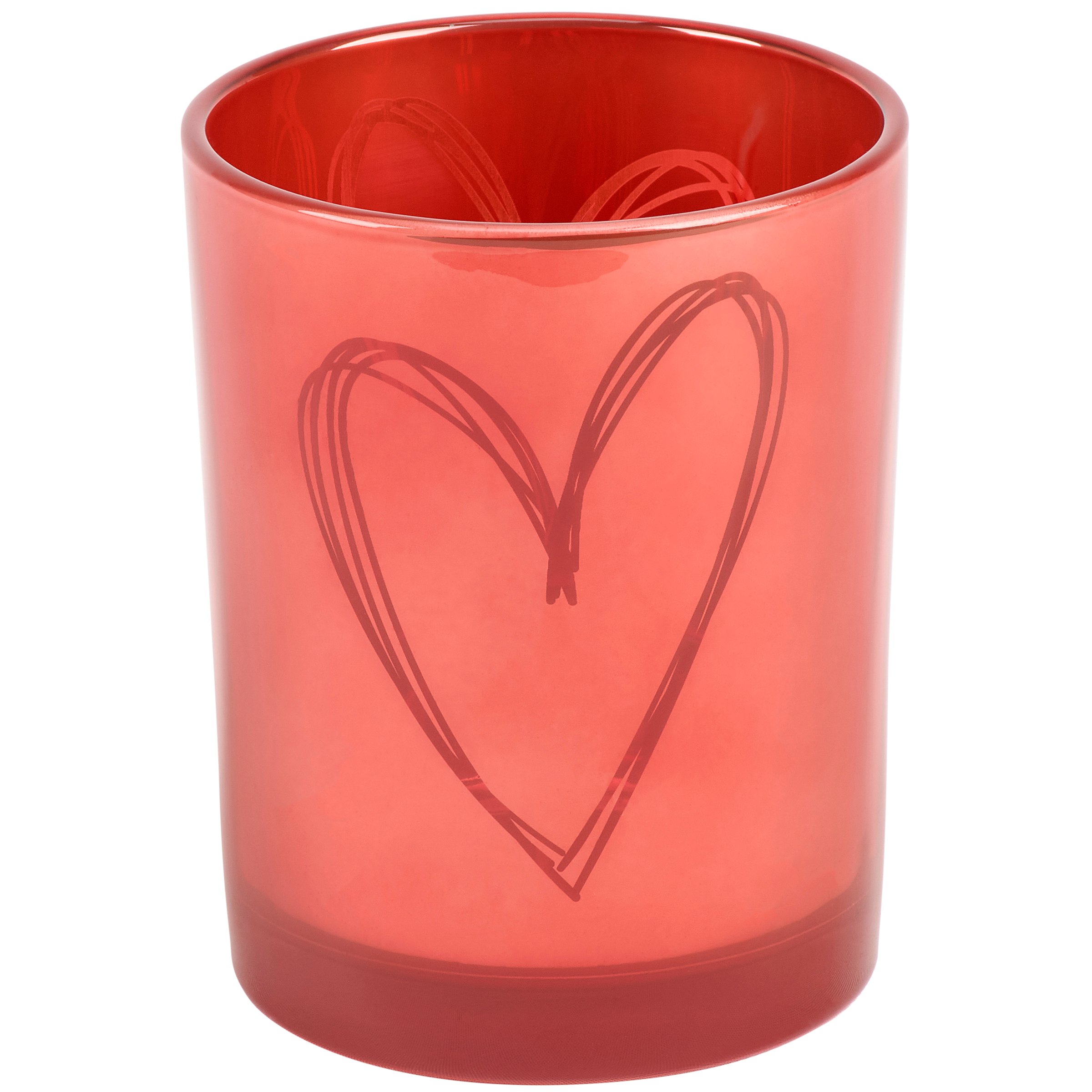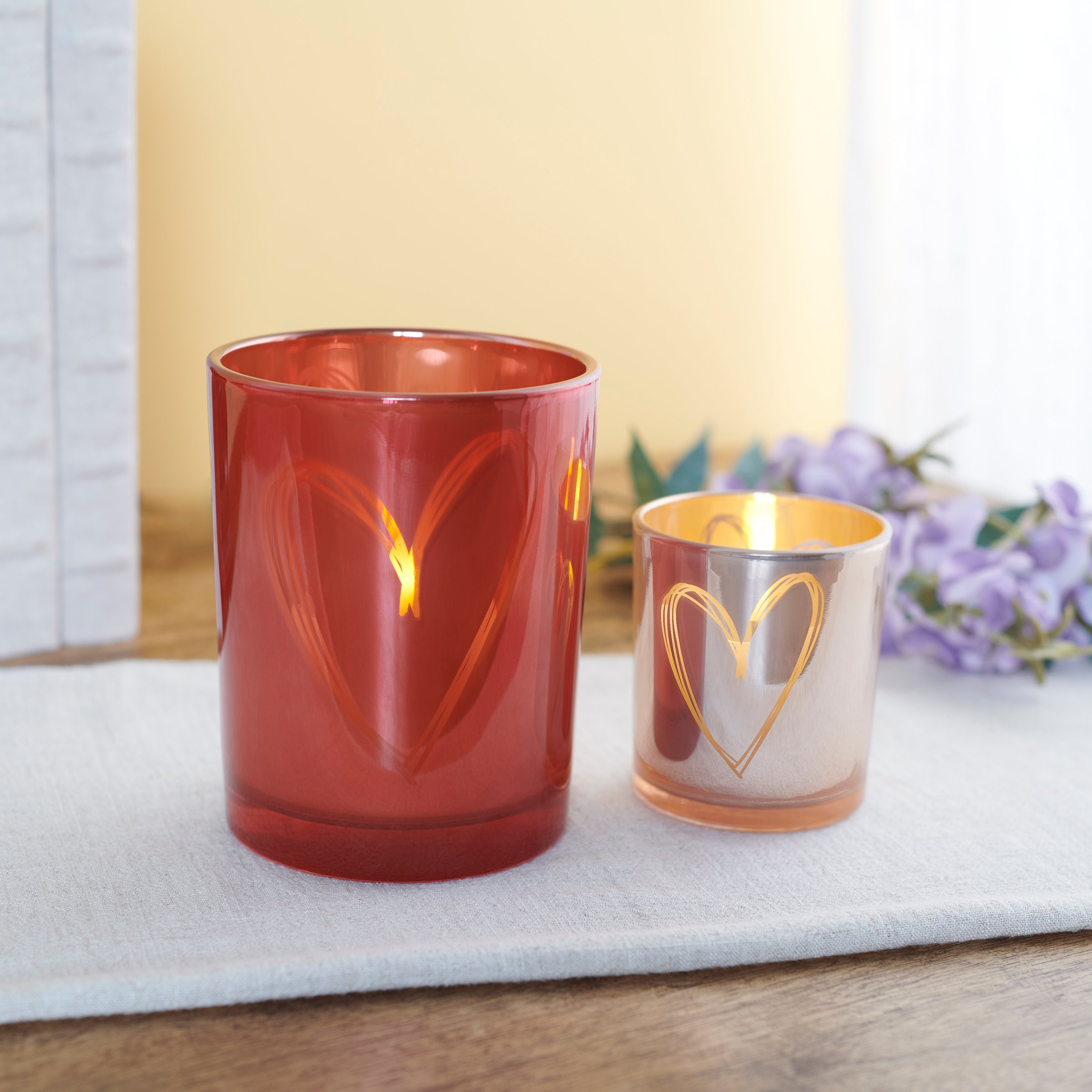 A set of glass candle holders that coordinates well with home decor from ourĀ Garden Collection. Each candle holder displays a hand drawn heart on either pink or red frosted glass with reflective detail inside. Our Hearts candle holder set includes 2 different size holders with space inside to place tealight candles. Candles pictured not included. Perfect for a Valentine's Day home accent that adds natural lighting to any space.