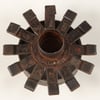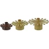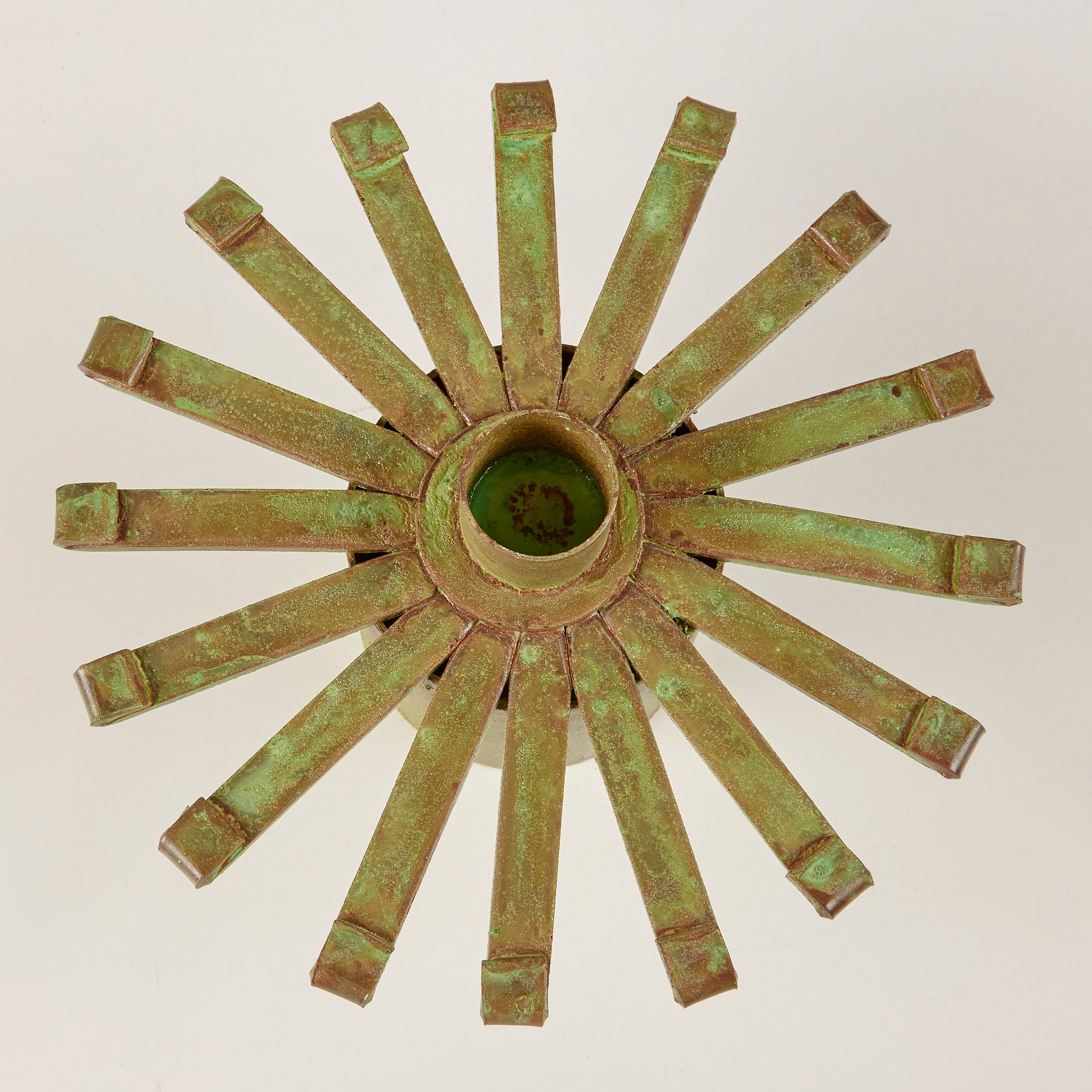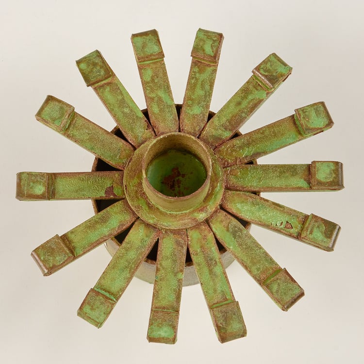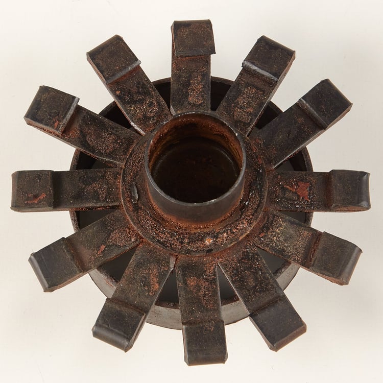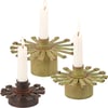 A metal candle holder set including 3 holders of different size and color that coordinate well with décor from our Primitive Collection. Each candle holder features a distressed metal finish with metal pieces forming a burst design around the space at the top for a candle. Our Iron Burst candle holders fit standard taper candles and can free stand on flat surface. Candles pictured not included. A set of rustic home accents perfect for adding natural lighting to any living space.