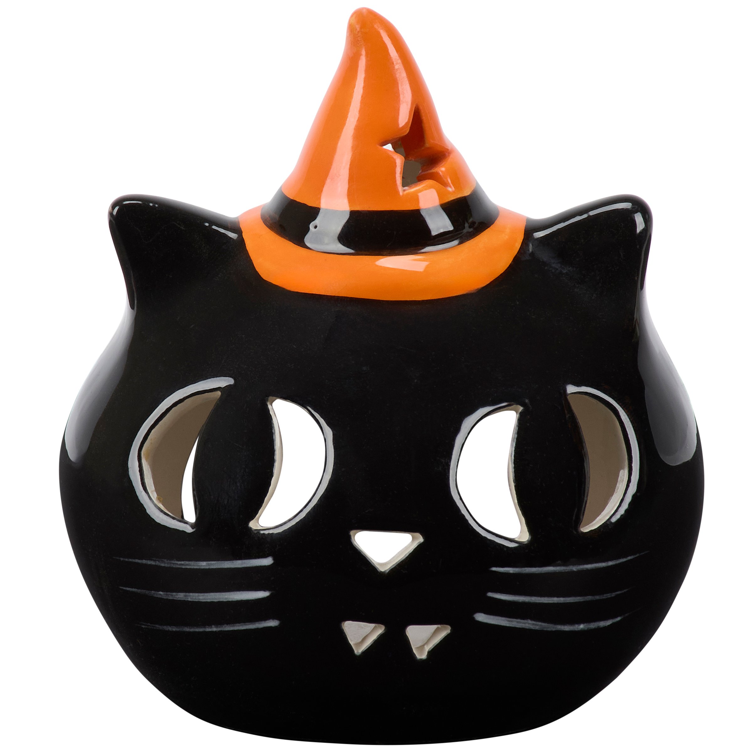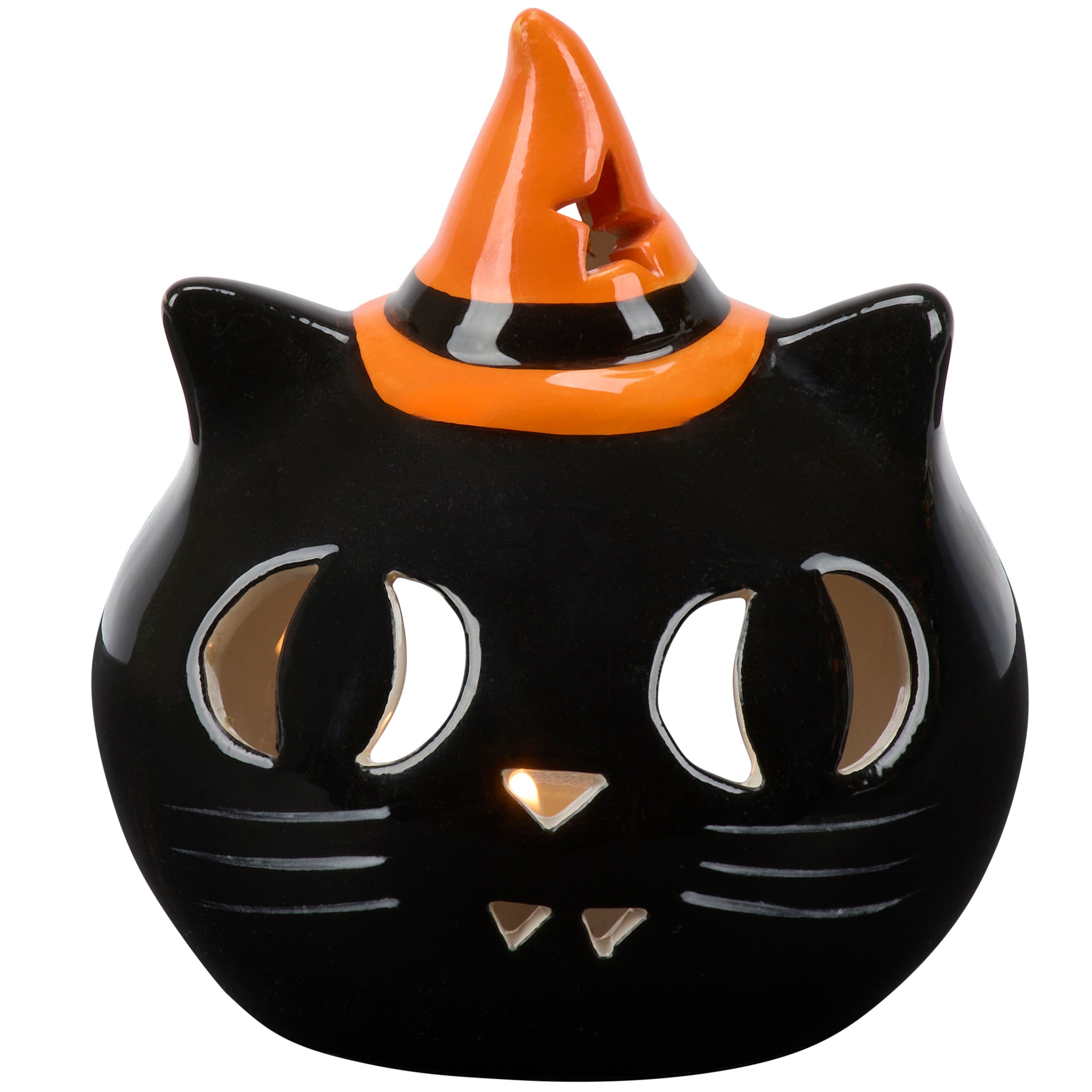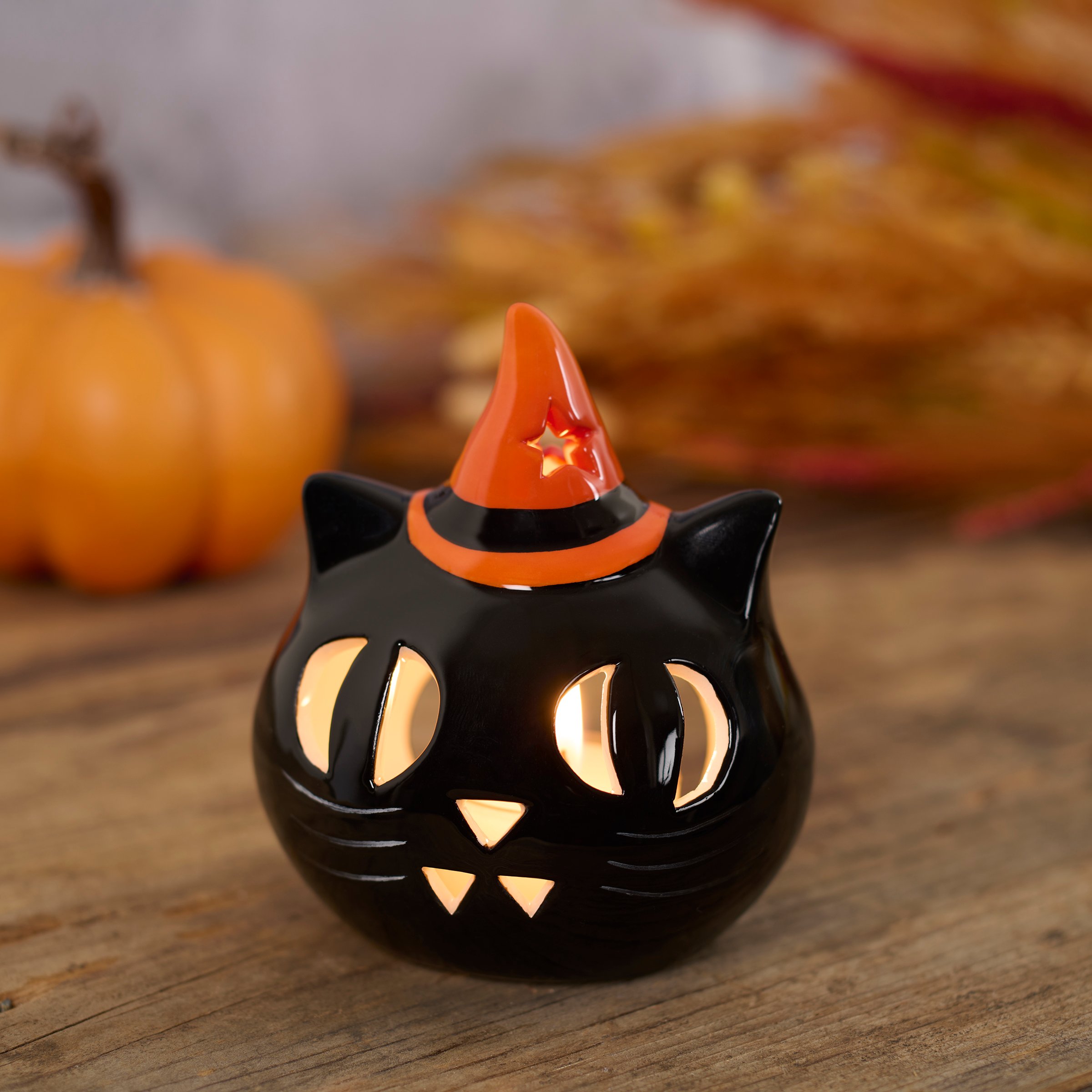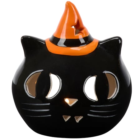 A ceramic candle holder that coordinates well with décor from our Halloween Collection. This Halloween candle holder features a fun sculpted design of a black cat head wearing a witch hat with a colorful glaze finish and an opening in the back to place a single candle inside to illuminate face and hat cutouts. Our Witchy Cat candle holder fits a standard tealight candle and can free-stand on flat surface for display. Candle pictured not included. A fun Halloween home accent perfect for adding natural lighting and seasonal style to any home or work space.