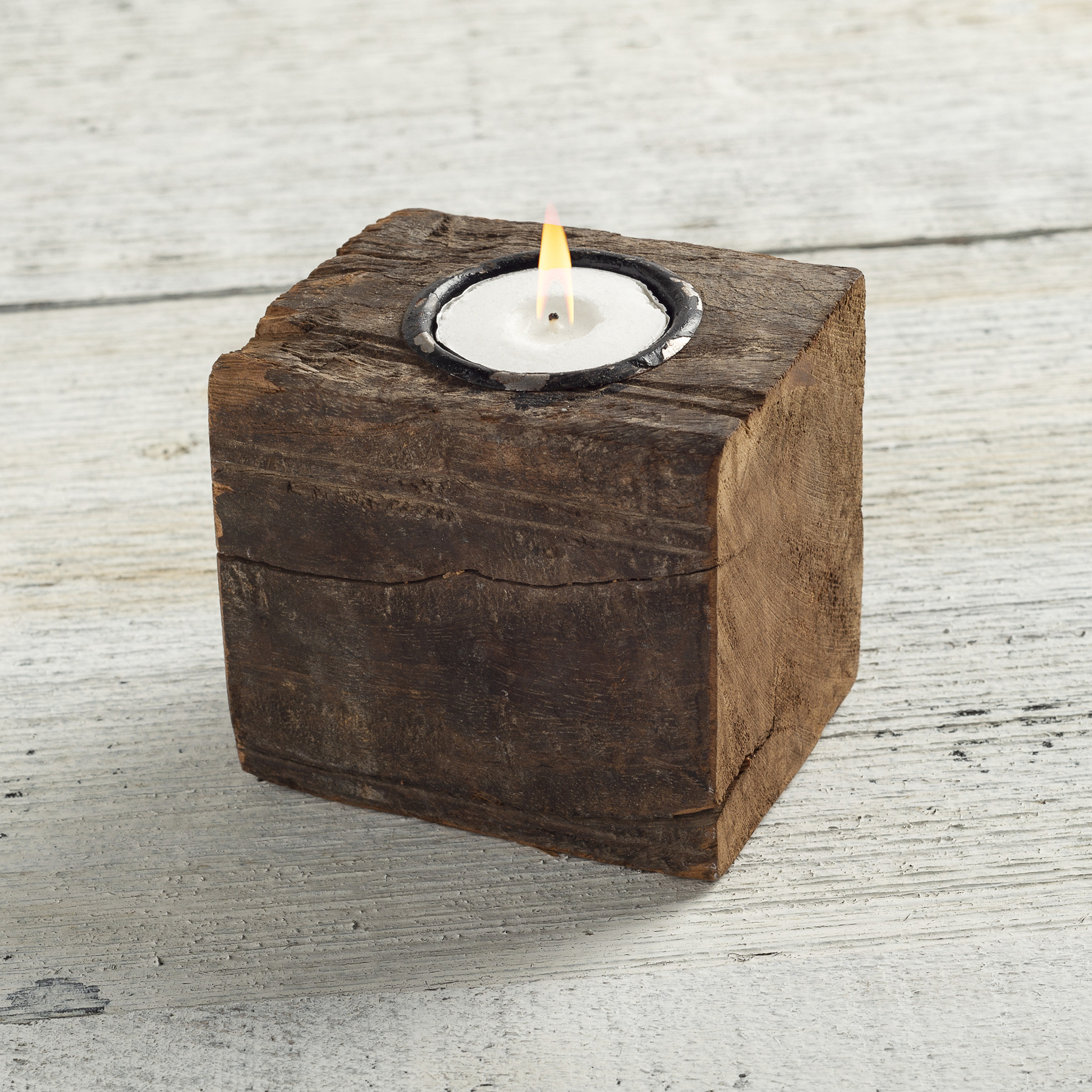 An antique candle holder from our Primitive Collection displaying a natural wood block design with a metal candle holder made from recycled antique items. Each antique wood block candle holder features natural wood and metal accents with distressed details for an aged appearance. Candle holder is designed to hold one tealight size candle. Candles pictured not included. This item is an authentic import from India making each piece unique with varying details like color, style, and size. Due to the method in which this item is made, we cannot guarantee similar details among multiple items. Our Wood Block candle holder is designed to free-stand on any flat surface for display. A rustic everyday home accent perfect for adding natural lighting to any space.