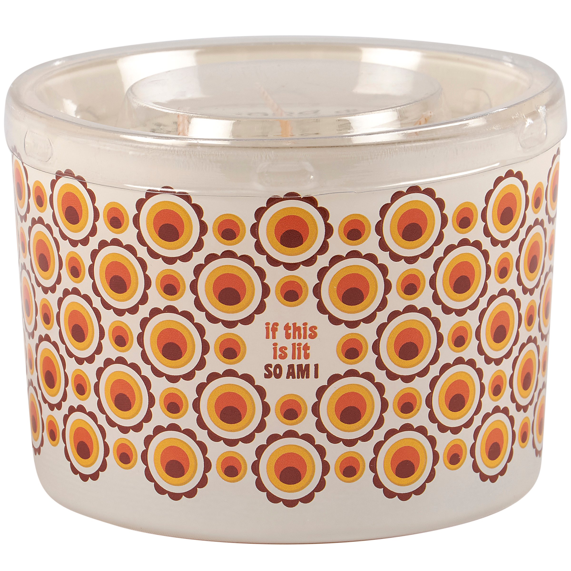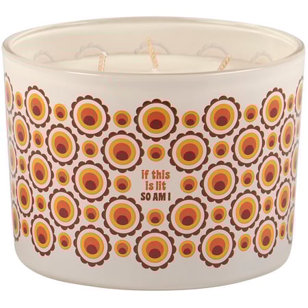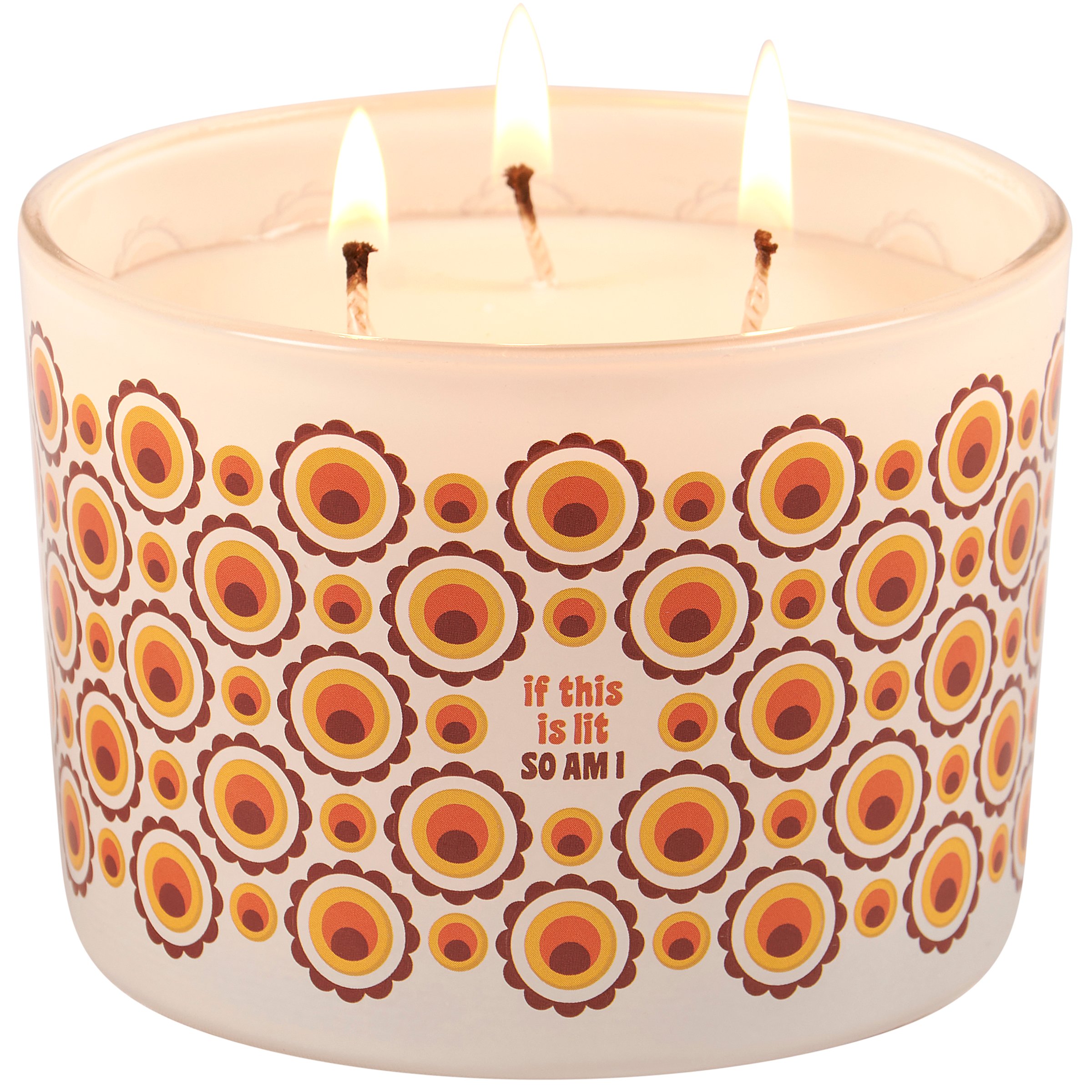 See the flame? Be prepared. This jar candle displays a retro inspired pattern and sassy sentiment that reads "If This Is Lit - So Am I" on frosted glass. Retro candle features soy-based wax and 3 fabric wicks with 30 hours of burn time activating an invigorating Sandalwood & Musk scent. Questionables jar candles include a dust cover and plastic lid for protection and polished appearance. Our If This Is Lit candle is a home accent designed to call back to a retro style while also calling out a modern mentality. Great for gifting!