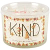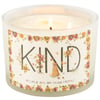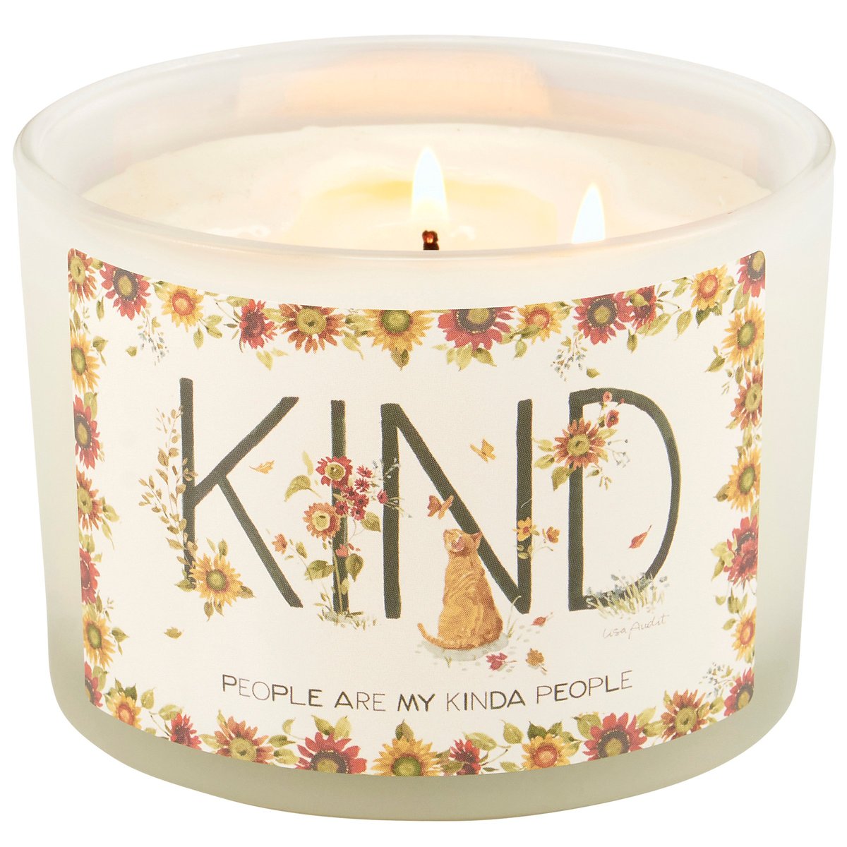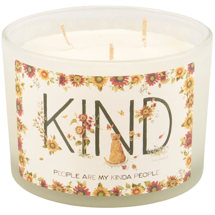 A jar candle from our Fall & Harvest Collection displaying a double-sided design of a hand painted inspirational sentiment that reads "Kind People Are My Kinda People" accented with designs of fall flowers and a cat. Design is replicated from original artwork hand painted in a delicate watercolor style. Seasonal candle features soy-based wax and 3 fabric wicks with 30 hours of burn time activating a calming Cinnamon scent. Our Kind People jar candle includes a dust cover and plastic lid for protection and polished appearance. A fall-themed home accent that is great for gifting.