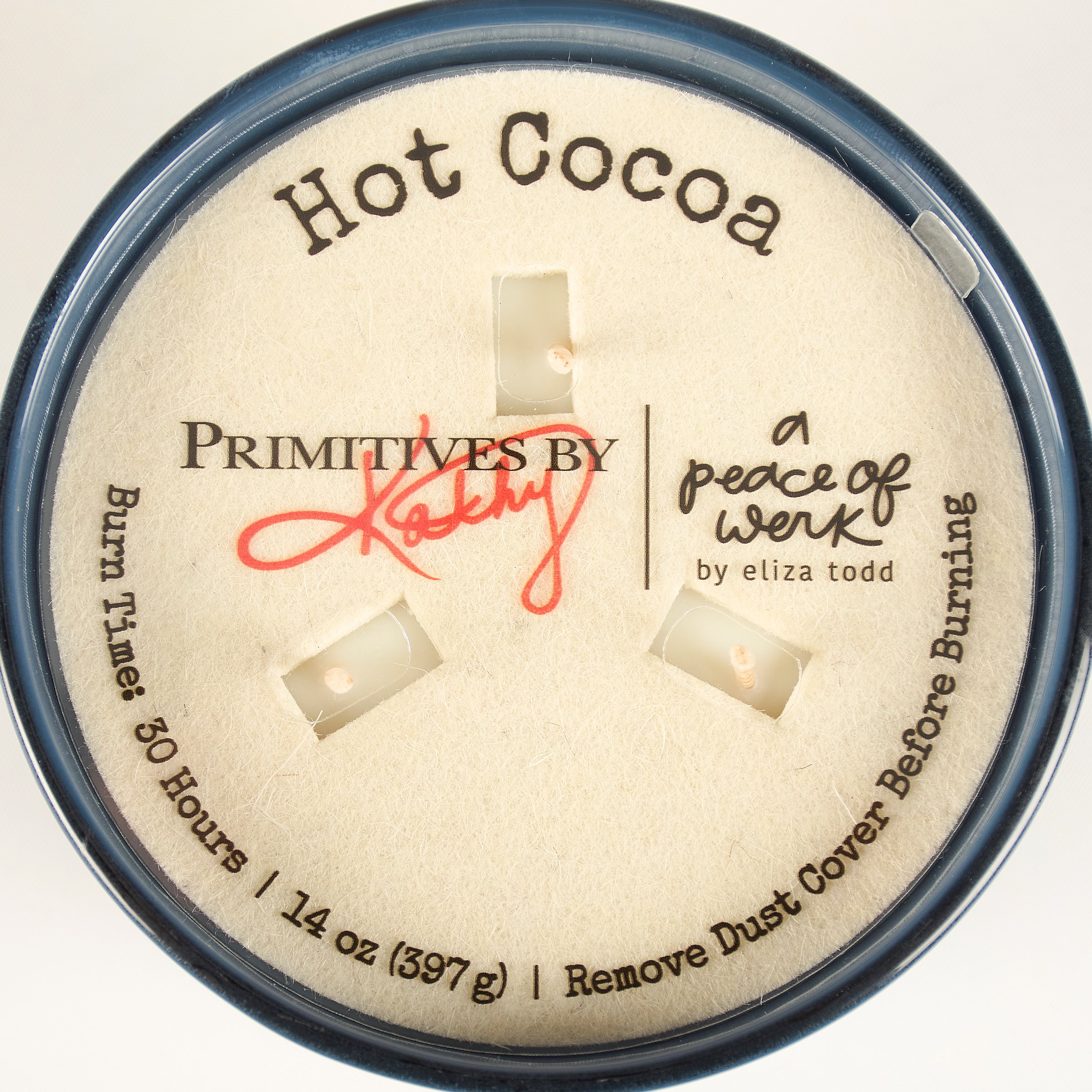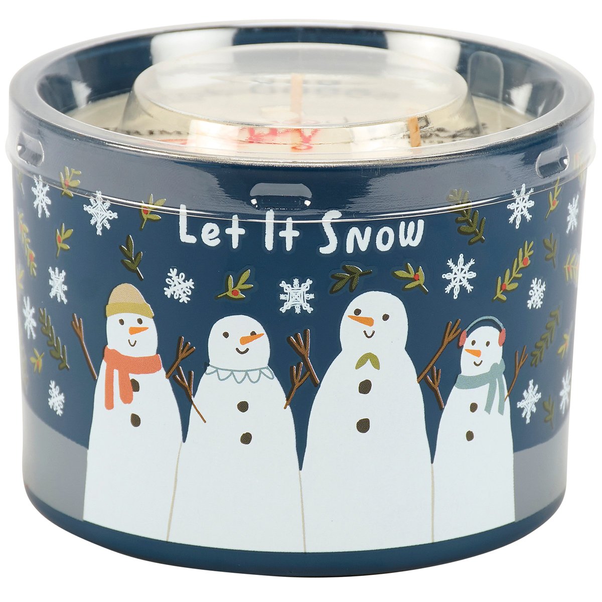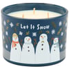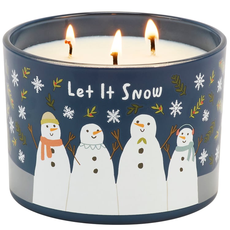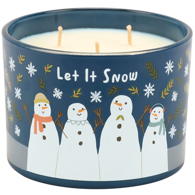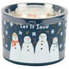 A candle from our Christmas Collection displaying a double-sided design of a snow family with "Let It Snow" sentiment on matte blue glass. Snow family design is replicated from original hand illustrated artwork. Seasonal candle features soy-based wax and 3 fabric wicks with 30 hours of burn time activating a delightful Hot Cocoa scent. Our Let It Snow candle includes a dust cover and plastic lid for protection and enhanced appearance on store displays. A fun snowman-themed Christmas gift perfect for a seasonal home accent.