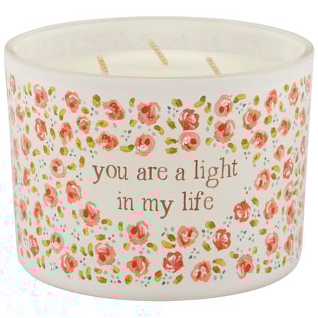 A candle from our Watercolor Collection displaying a full wrap-around design of bright florals on frosted glass with a heartwarming sentiment that reads "You Are A Light In My Life." Floral designs are replicated from original art hand painted in a watercolor style. Giftable candle features soy-based wax and 3 fabric wicks with 30 hours of burn time activating a relaxing Rose scent. Our Light In My Life candle includes a dust cover and plastic lid for protection and enhanced appearance on store displays. A heartwarming gift perfect for an everyday home accent.