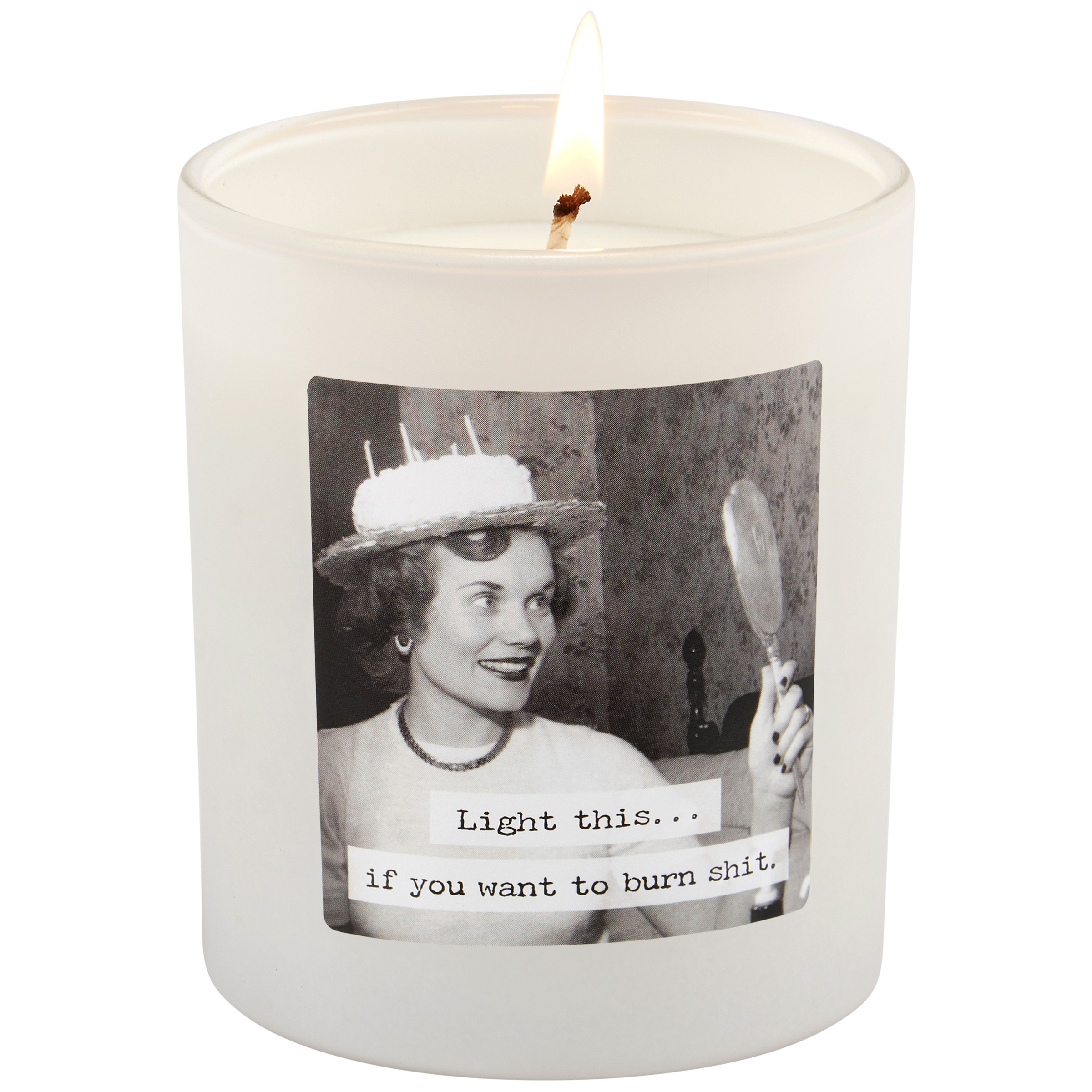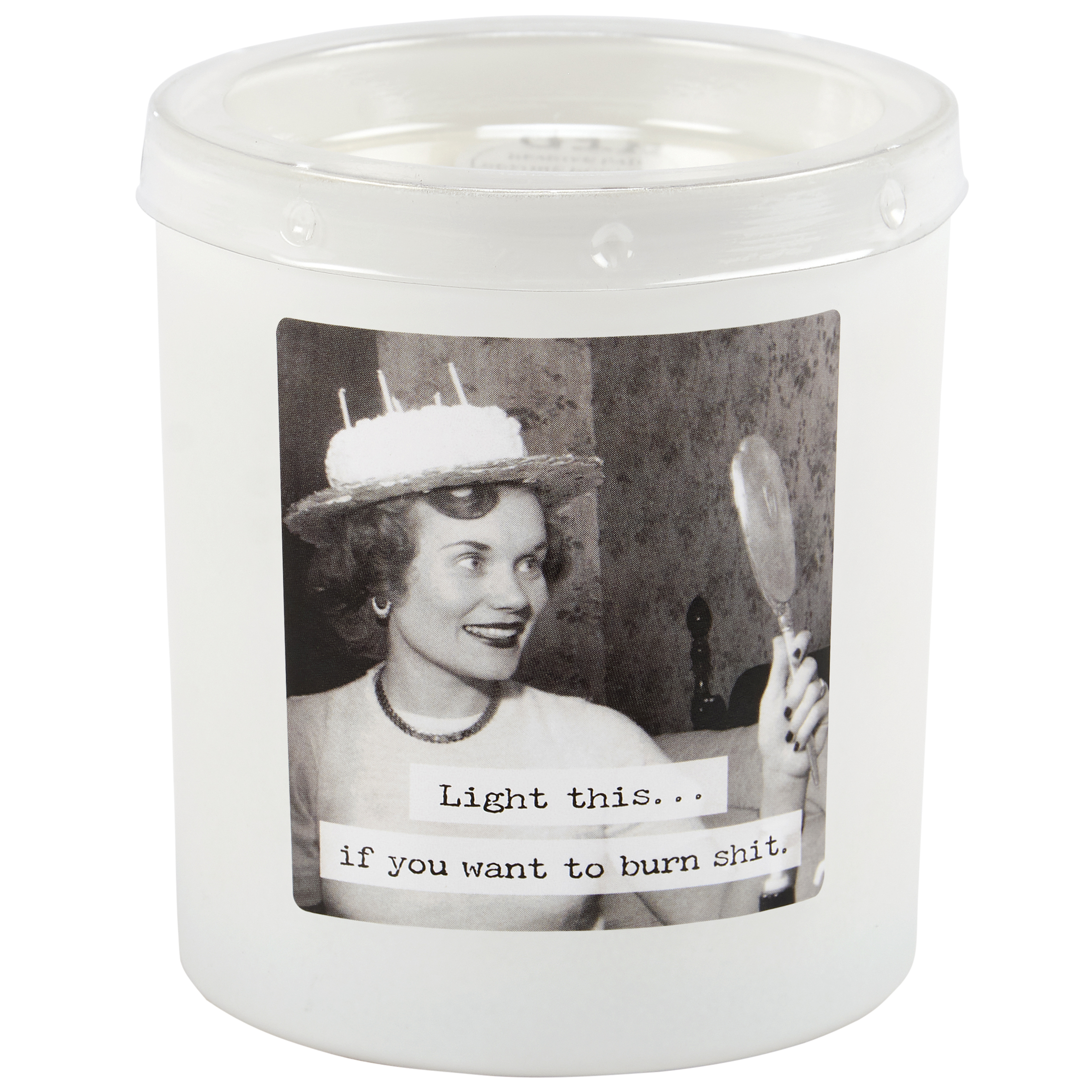 A jar candle from our Trash Talk By Annie Collection displaying a double-sided design of a vintage black and white photograph on frosted white glass complemented with a humorous sentiment that reads "Light This... If You Want To Burn Shit." Candle features soy-based wax and cotton wick with 35 hours of burn time activating a fun Birthday Cake scent. Our Light This jar candle includes a dust cover and plastic lid for protection and polished appearance. A hilarious home accent that is great for everyday gifting.