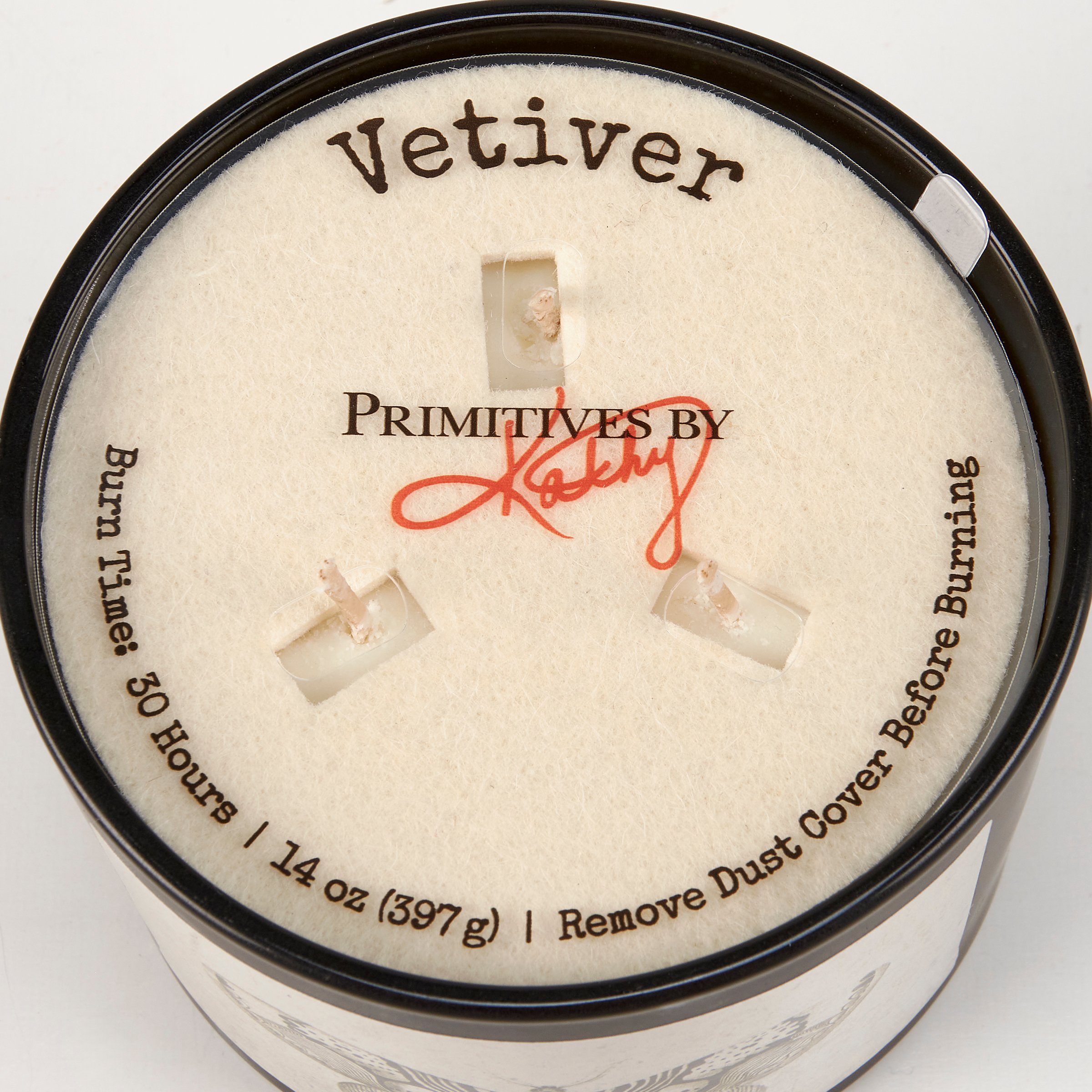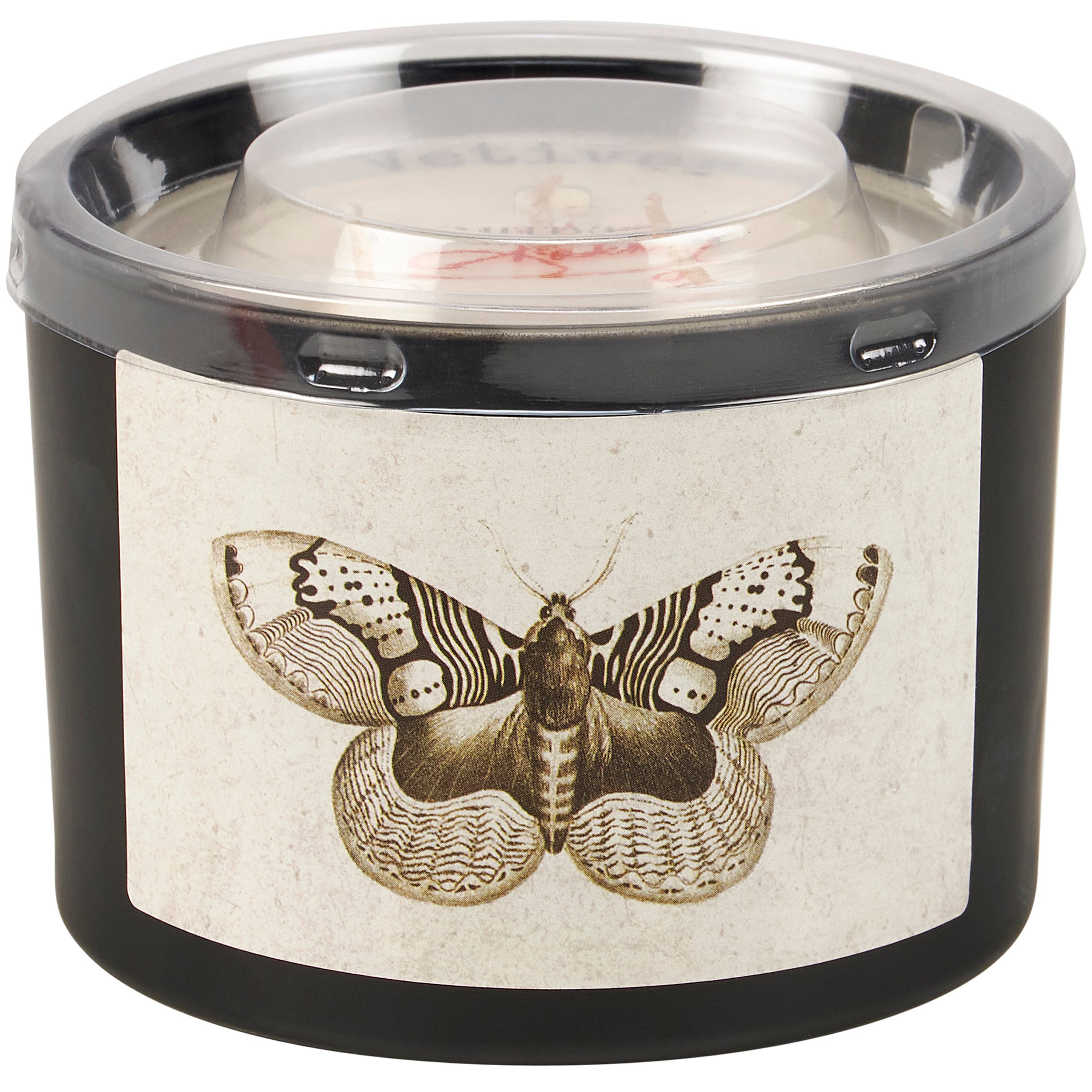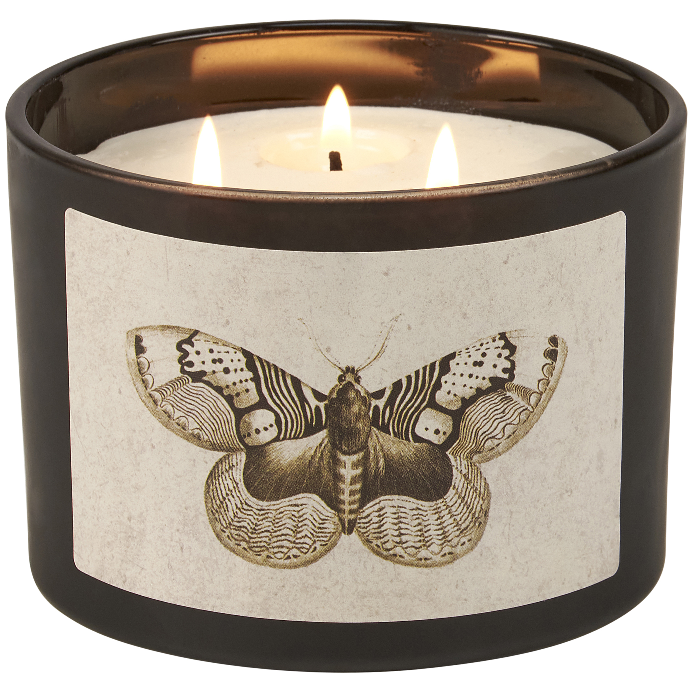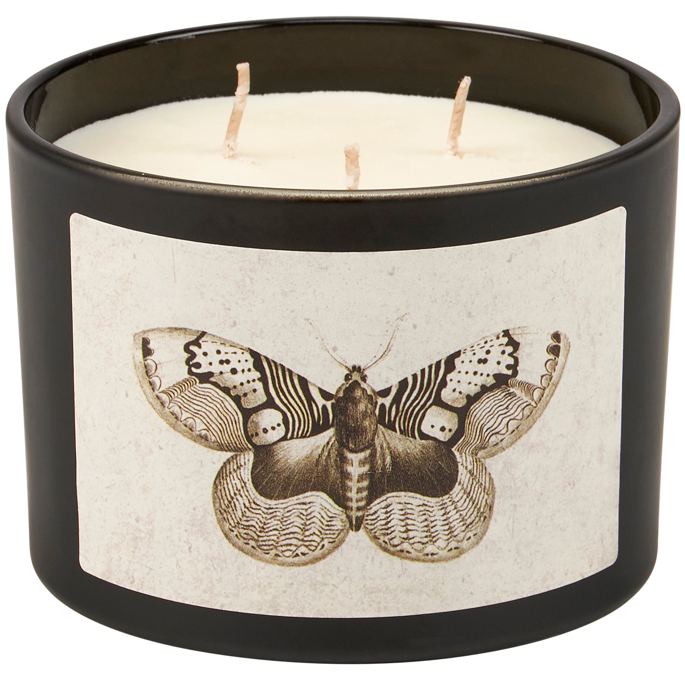 A jar candle from our Moody Collection displaying a double-sided design of a moth in a vintage style on frosted black glass. Candle features soy-based wax and 3 fabric wicks with 30 hours of burn time activating a calming Vetiver scent. Our Moth candle includes a dust cover and plastic lid for protection and polished appearance. A rustic home accent that is great for gifting.