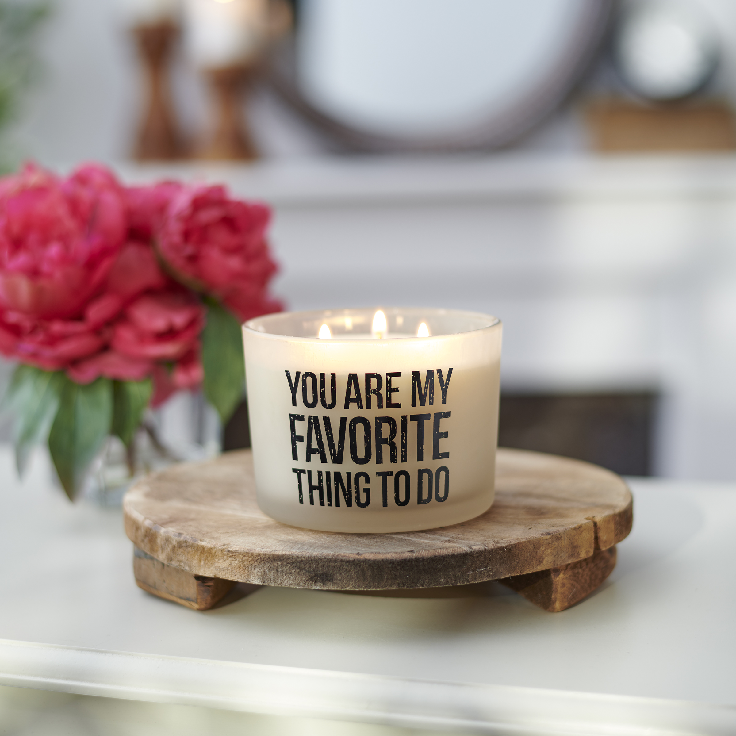 A jar candle from our Box Sign Style Collection displaying a heartwarming box sign style sentiment on matte cream glass that reads "You Are My Favorite Thing To Do." Candle features soy-based wax and 3 fabric wicks with 30 hours of burn time activating a calming French Vanilla scent. Our My Favorite Thing jar candle includes a dust cover and plastic lid for protection and polished appearance. A lovely gift perfect for an everyday home accent.