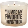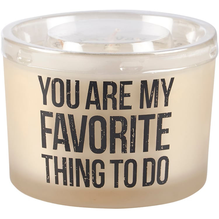 A jar candle from our Box Sign Style Collection displaying a heartwarming box sign style sentiment on matte cream glass that reads "You Are My Favorite Thing To Do." Candle features soy-based wax and 3 fabric wicks with 30 hours of burn time activating a calming French Vanilla scent. Our My Favorite Thing jar candle includes a dust cover and plastic lid for protection and polished appearance. A lovely gift perfect for an everyday home accent.